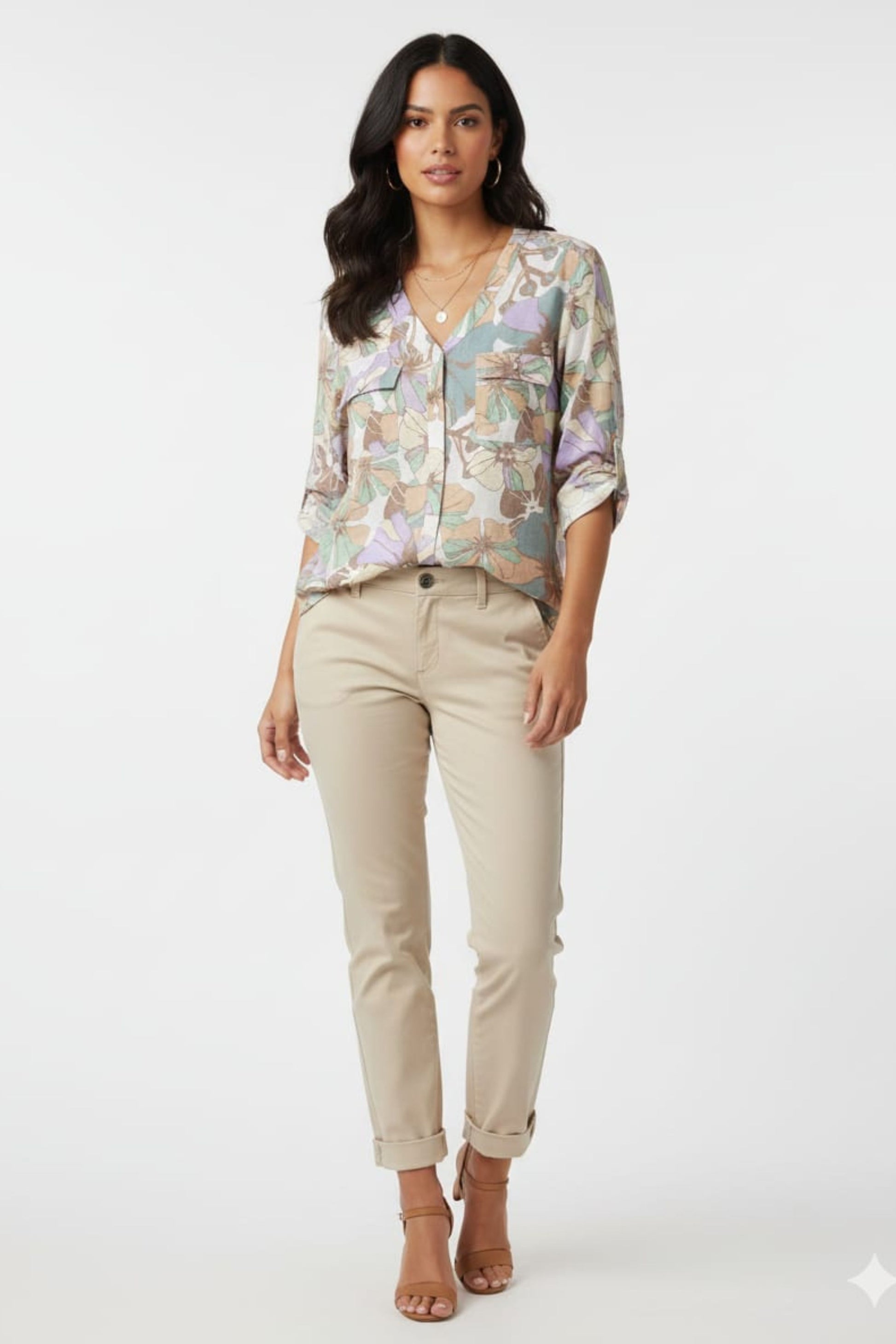 Product Highlights Tropical Botanical Print: A high-definition floral design featuring golden hibiscus flowers and greenery set against a light, airy background for a fresh, summer-ready aesthetic. Functional Double Chest Pockets: Designed with two front chest pockets with flap details, providing a touch of utility-inspired structure to the feminine print. Versatile 3/4 Roll-Tab Sleeves: Includes adjustable roll-tab sleeves, allowing you to switch effortlessly from a polished elbow-length look to a more casual pushed-up style. Classic V-Neckline: Features a flattering V-neck and full button-down front, creating a sleek and lengthening silhouette that is easy to style. Lightweight & Breathable: Crafted from a breezy, semi-sheer fabric that ensures maximum comfort and airflow on even the warmest days.