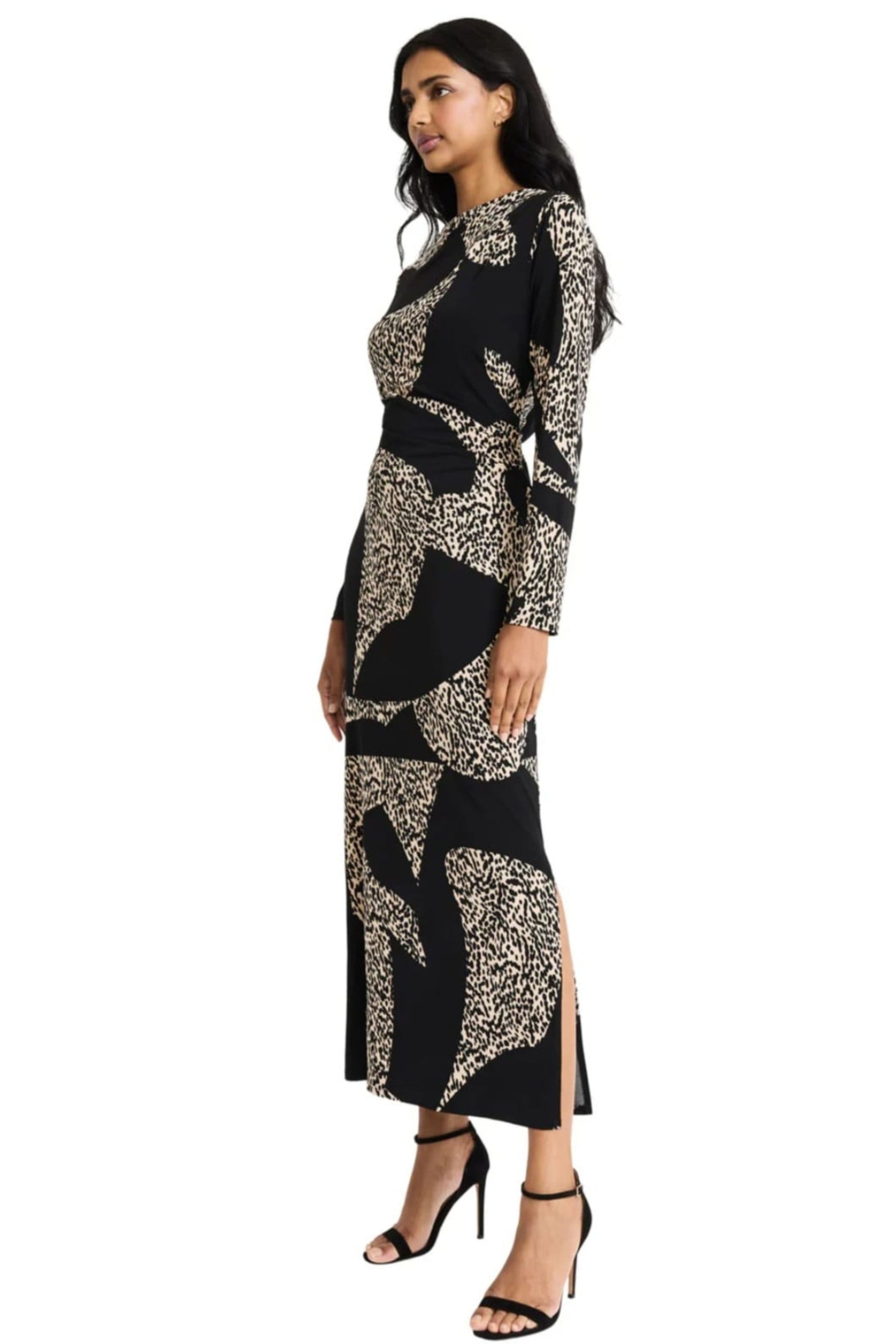 Stretch jersey multi print long dress with side skirt slit. Dress is lined, with side zipper. STYLE: D9479M
