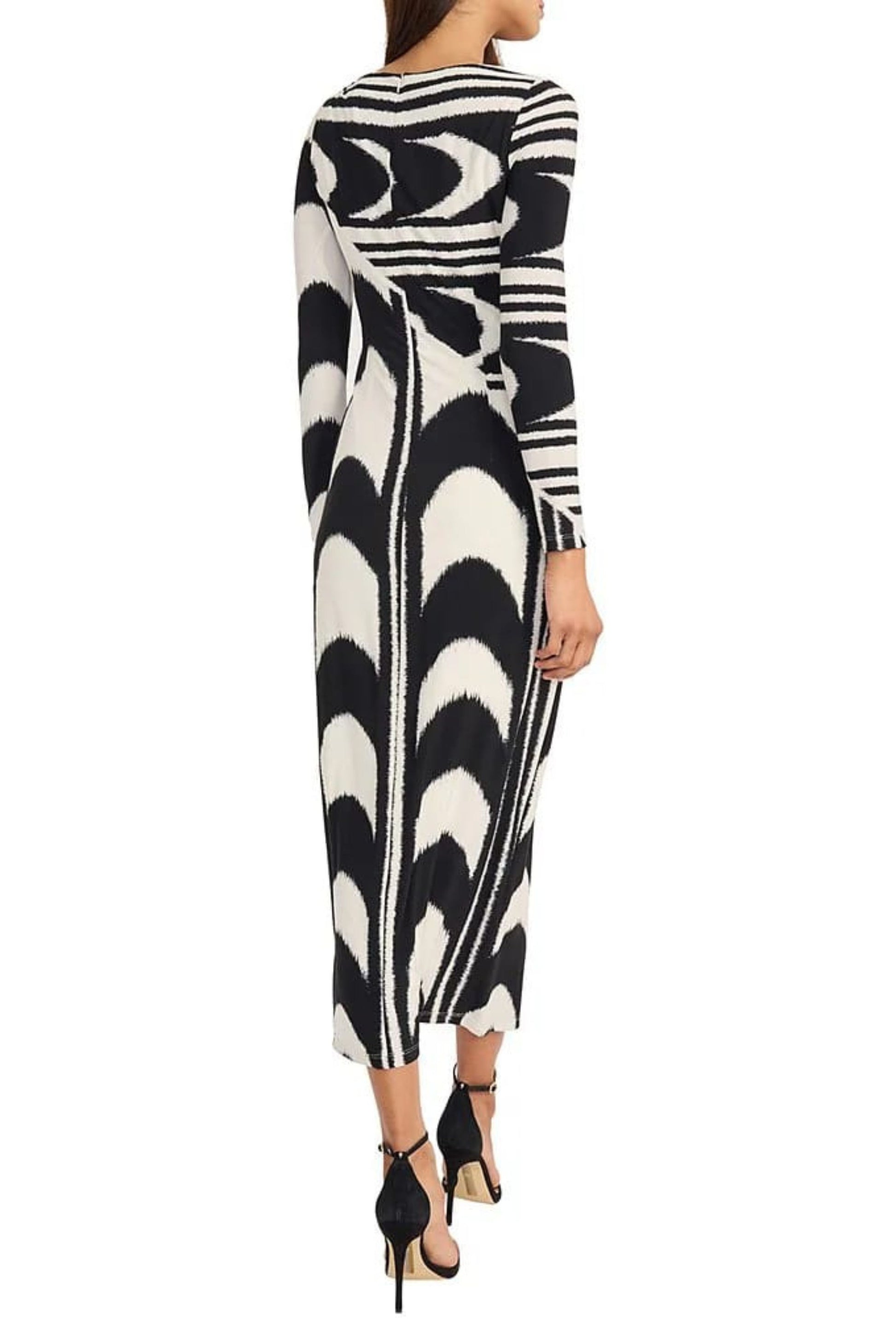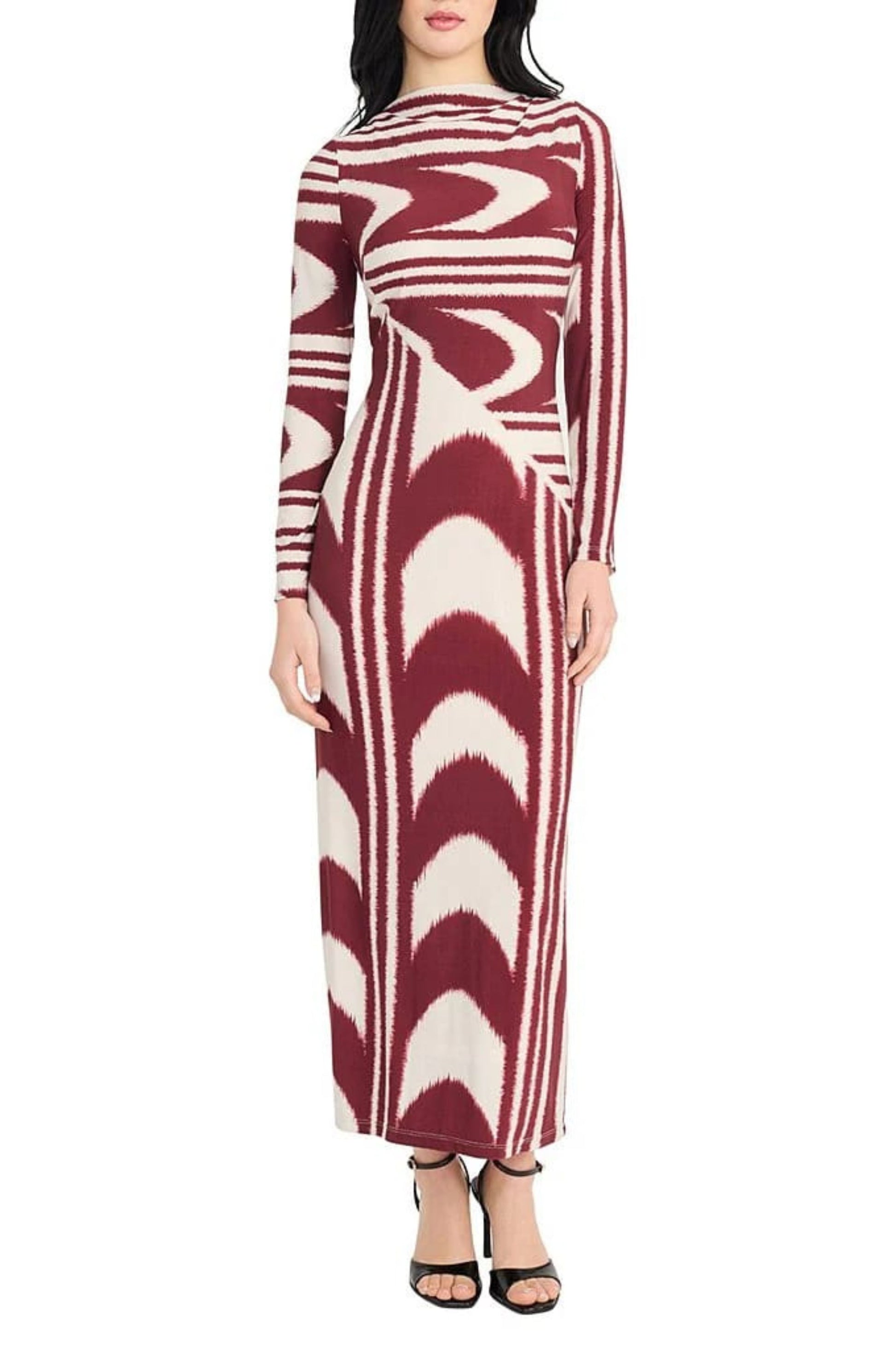 Stretch jersey long multi color dress. Dress is lined, with hidden back zipper. STYLE: D9759M