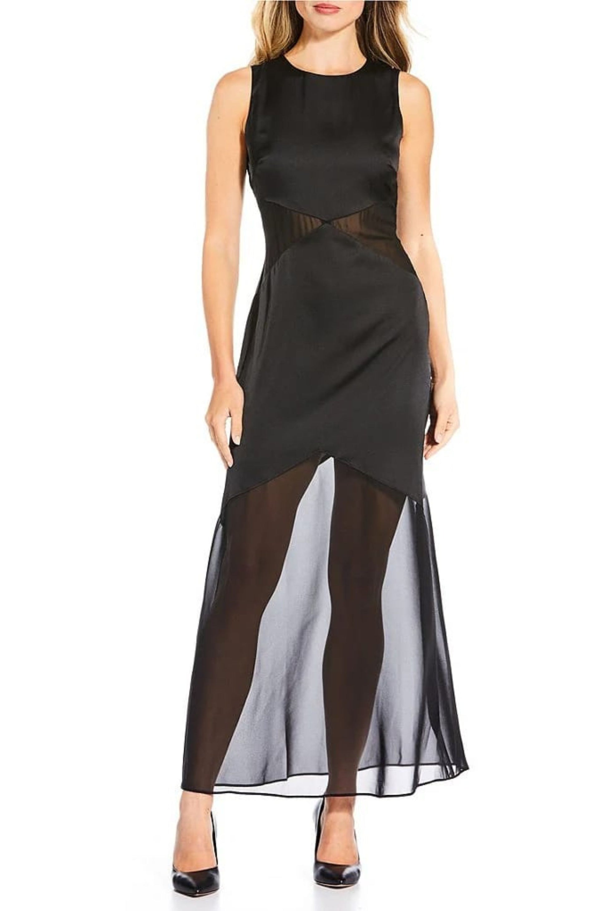 Santeen dress with chiffon contrast detail. Dress is lined, has hidden back zipper. STYLE: D9780M