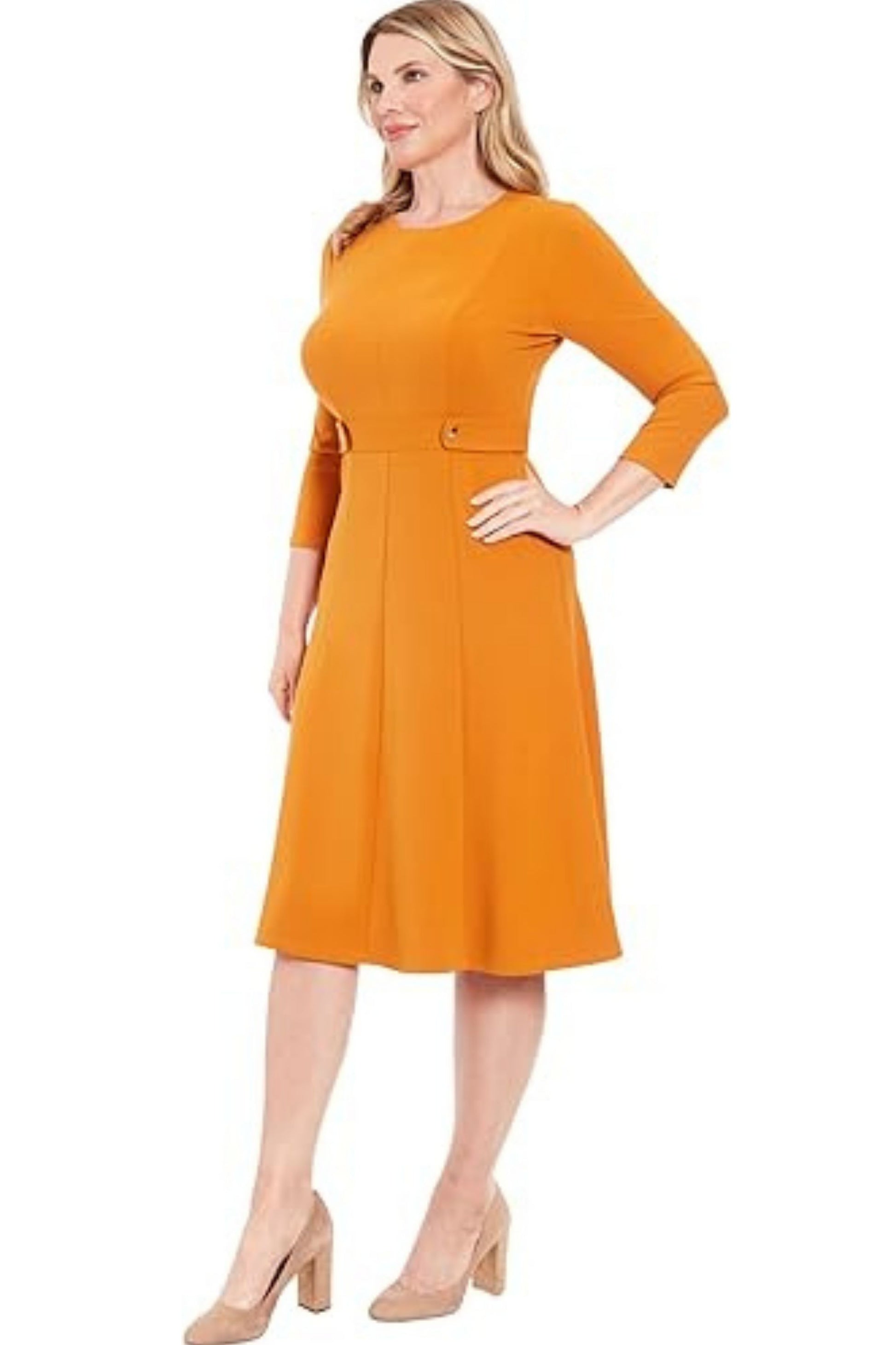 Scuba crepe dress with button waist detail. Dress is not lined, has hidden back zipper. STYLE: T6004