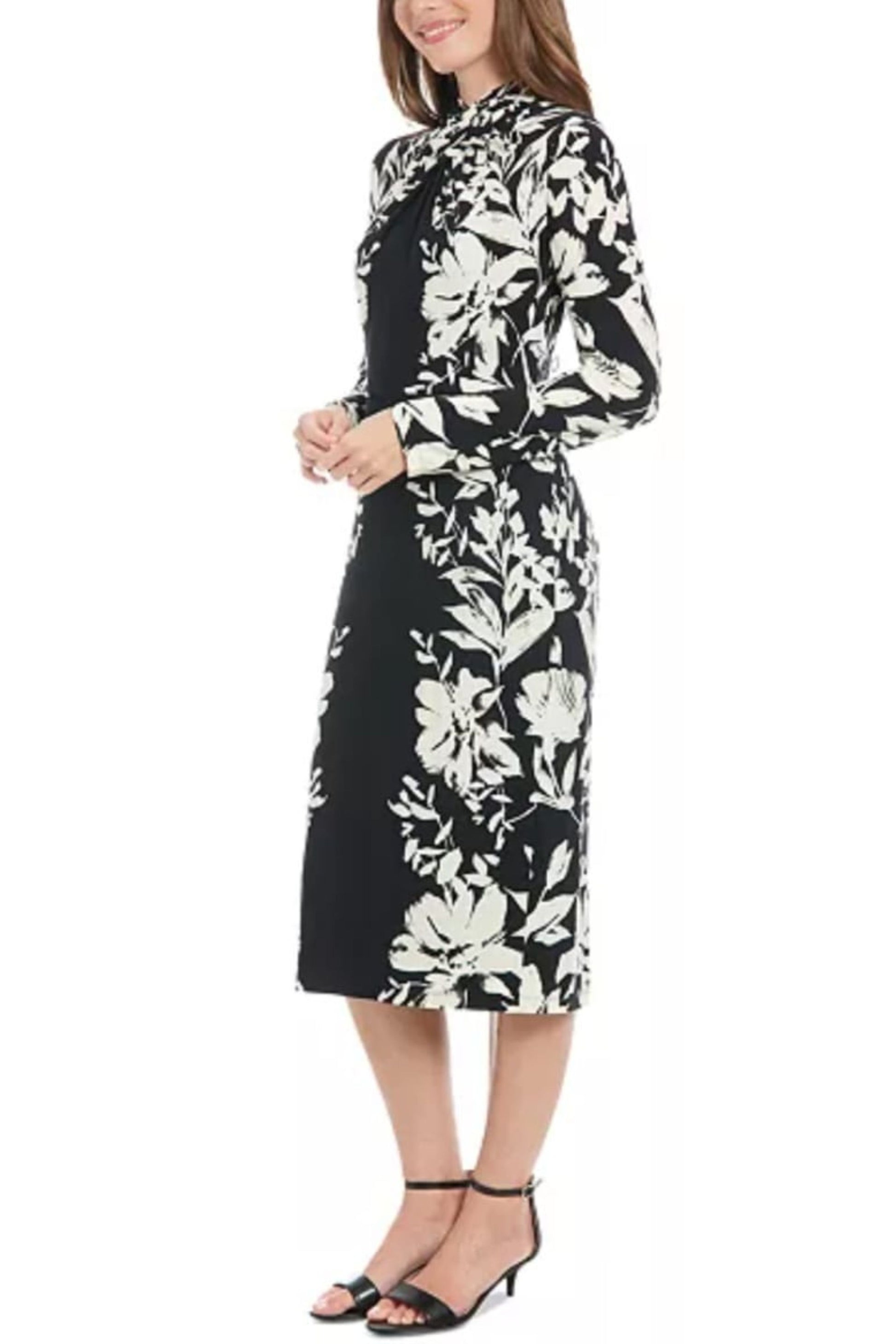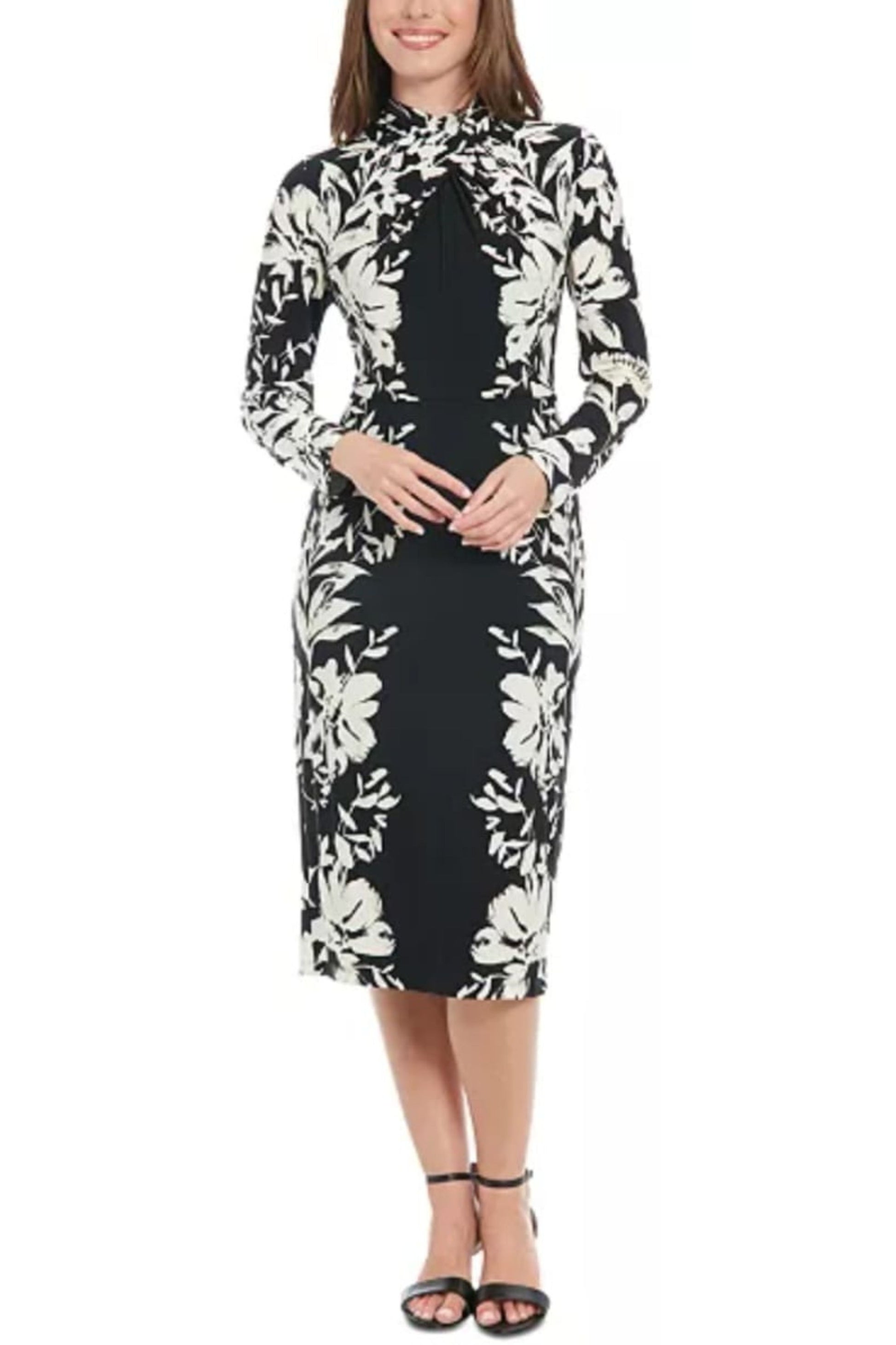 Twist mock neck sheath day to night dress. Dress is lined with back zipper. STYLE: T7593P