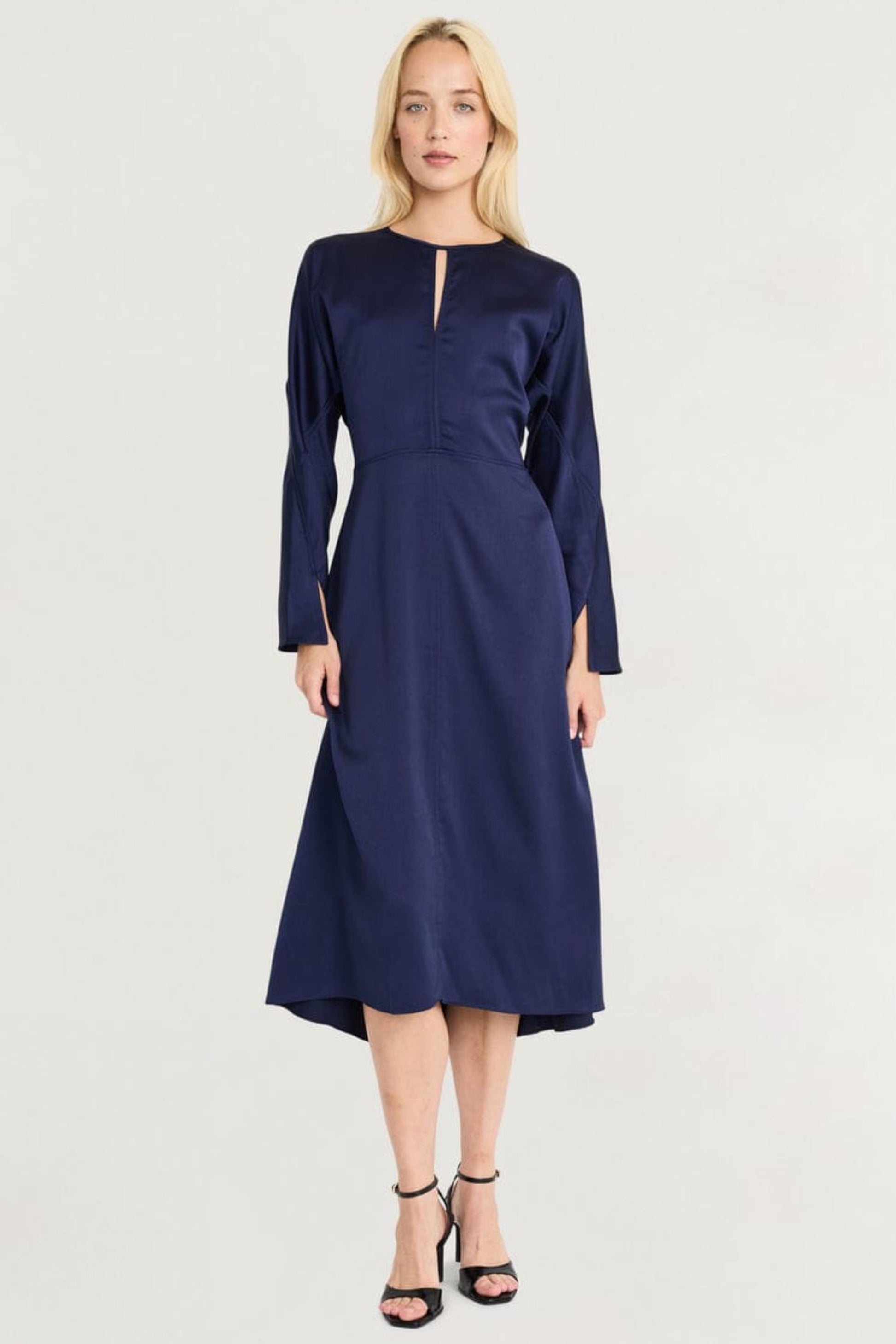Charmuse dress with peep hole neckline, slit sleeves, and piping detail. Dress is not lined, has hidden back zipper. STYLE: Y10111M