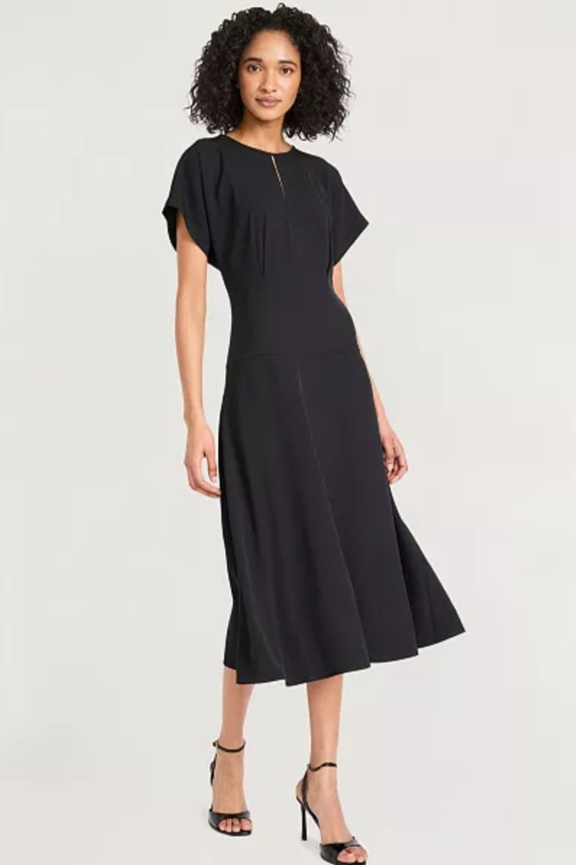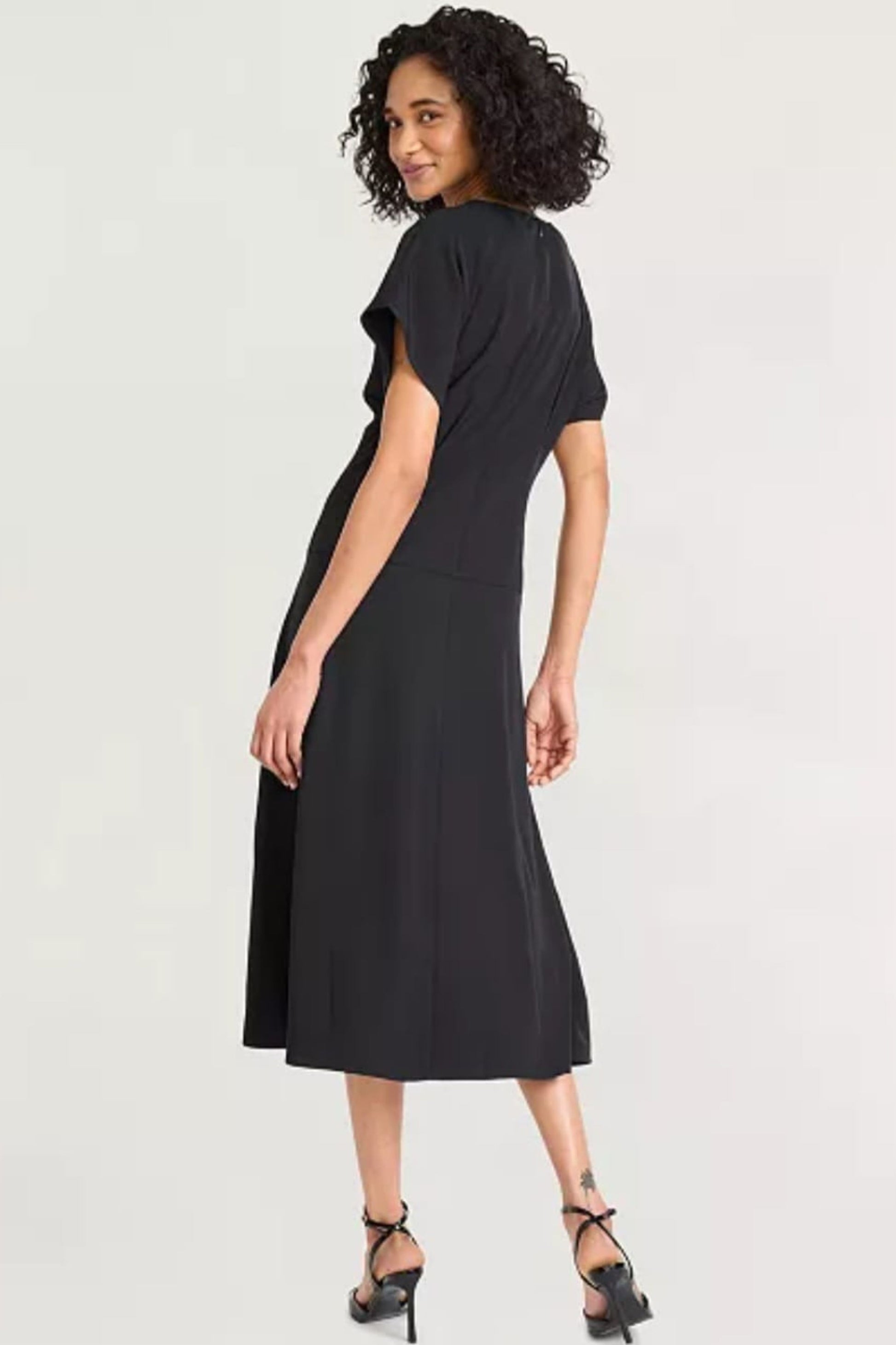Stretch woven dress with batwing sleeves, peep hole, and pleat detail. Dress is not lined, has hidden back zipper. STYLE: Y10334M