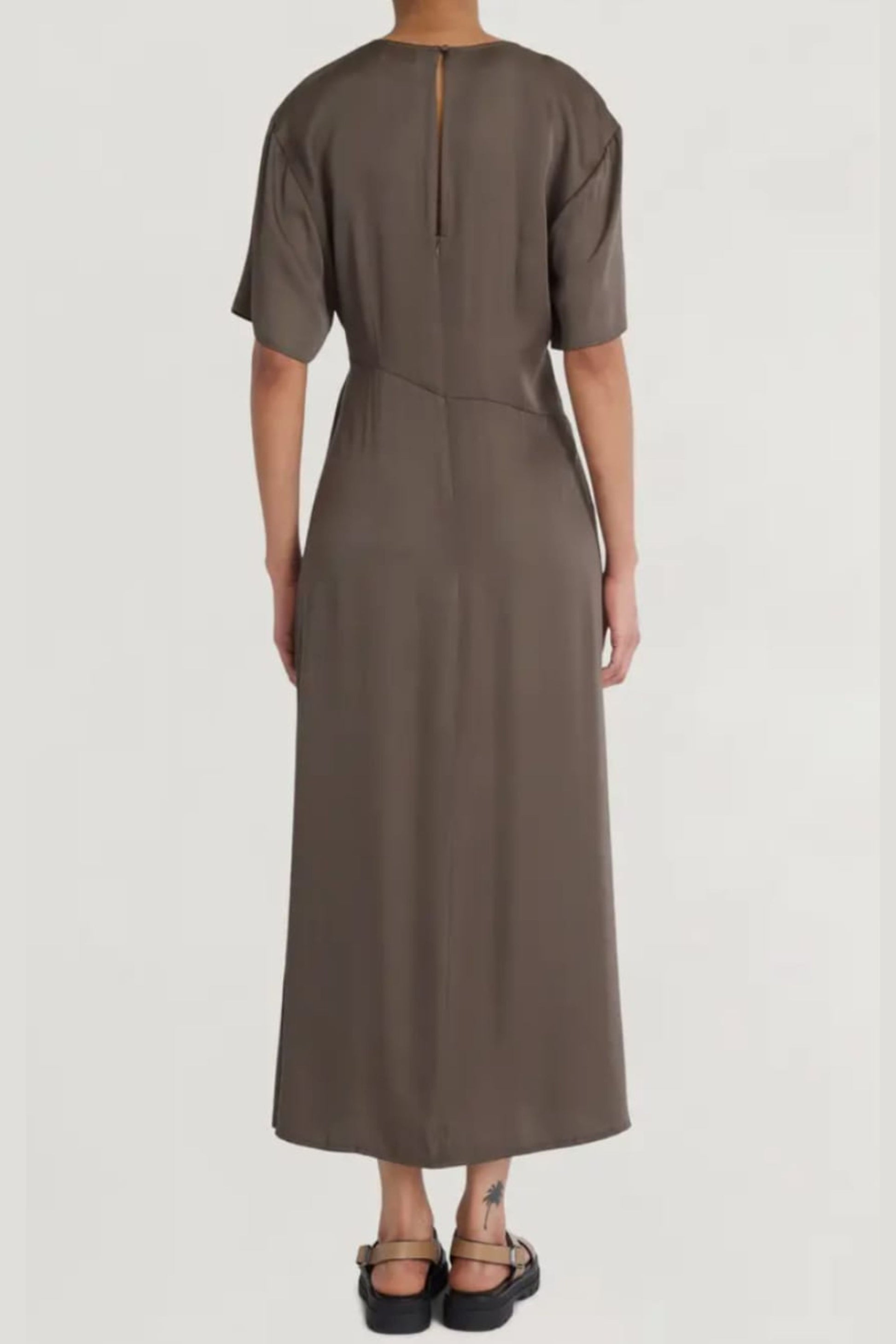 Sateen silky dress with front skirt slit and waist gather detail. Dress is not lined, has back hidden zipper. STYLE: Y10151M