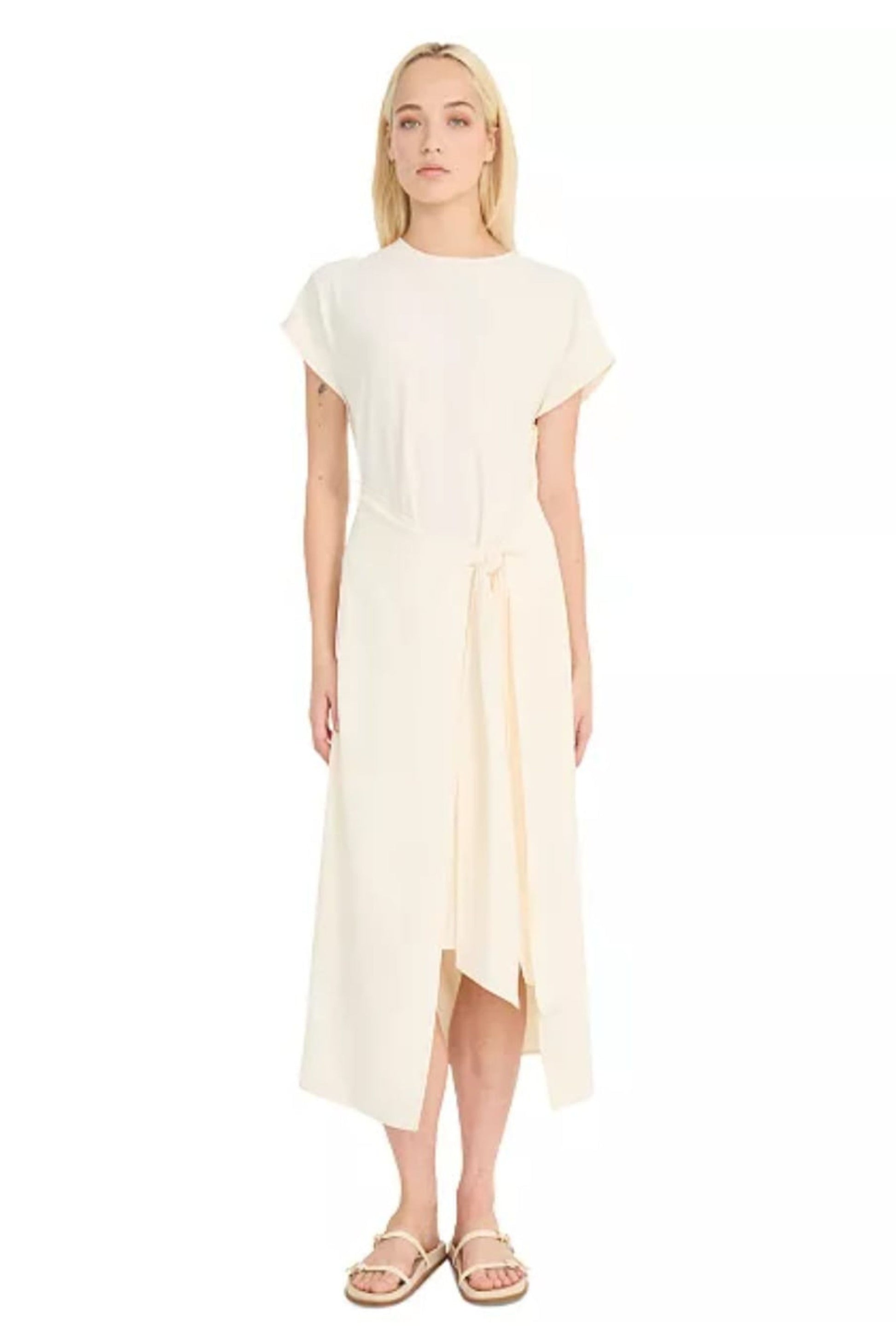 Stretch woven overlay tie waist dress and hi-lo skirt. Dress is not lined, has hidden back zipper. STYLE: Y10266M