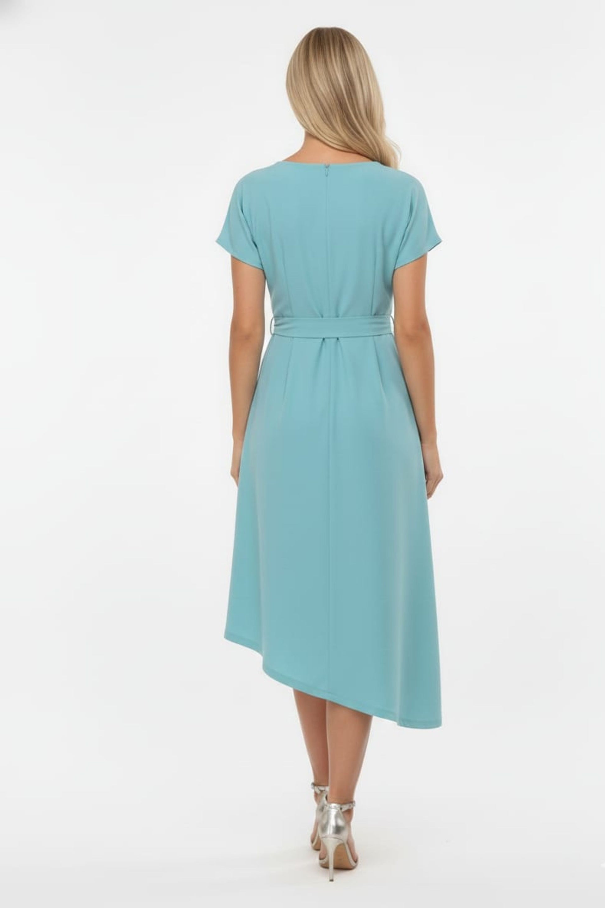Scuba crepe short sleeve midi dress with sash belt. Dress is lined, with hidden back zipper. STYLE: G6352M