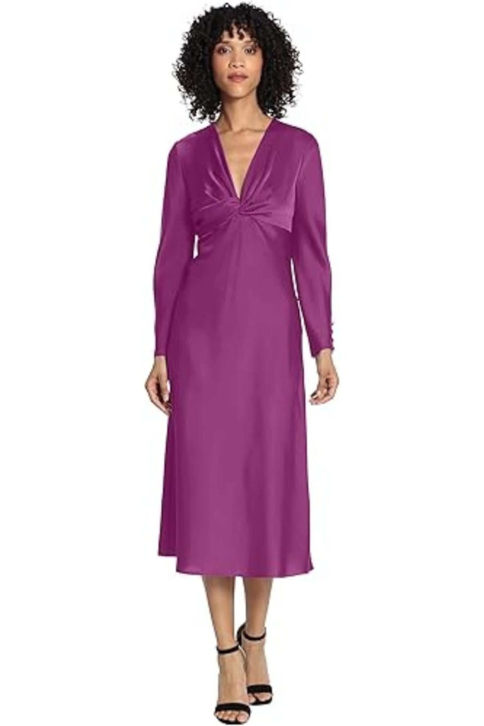 Stun them all at your next ticket to the opera, a dinner engagement, corporate event, or a classy holiday or cocktail party when you're seen wearing this gorgeous midi dress that features four fabric button-cuff long sleeves, an A-line calf-length skirt, and a V-neckline that connects to the decorative twisted center knot detail.