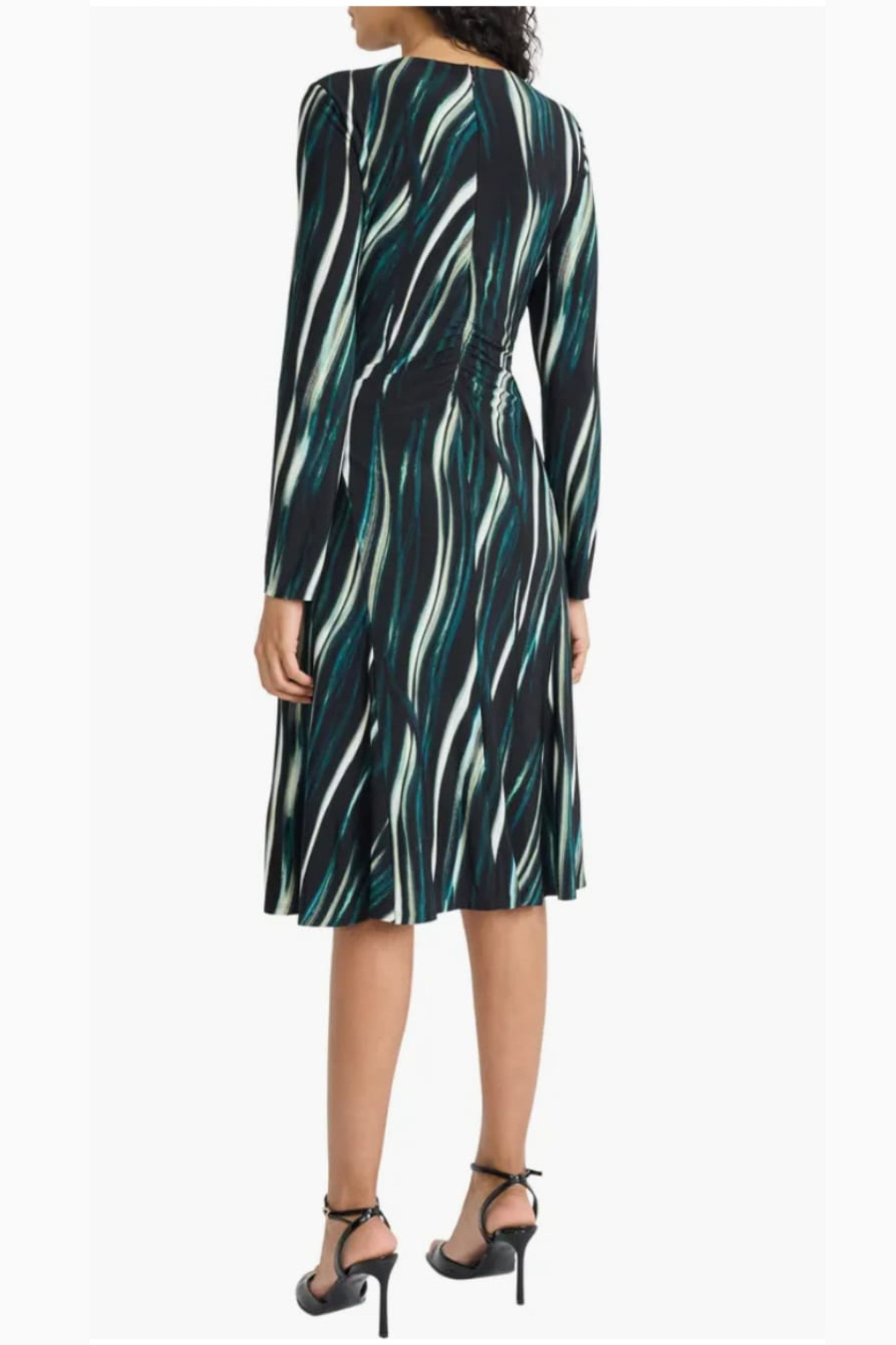 Stretch jersey long sleeve dress with front shirring detail. Dress is lined with hidden back zipper. STYLE: GT1176M