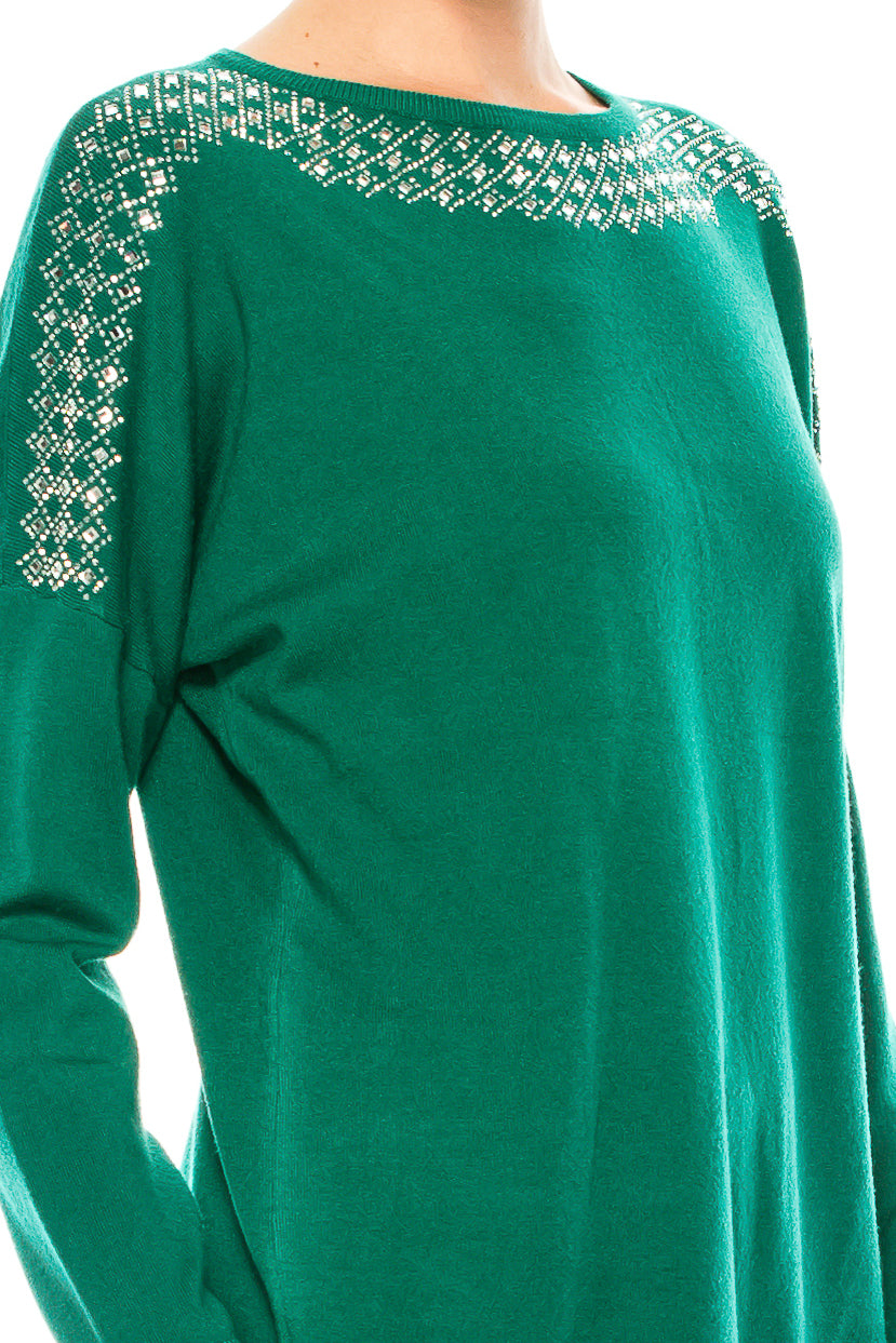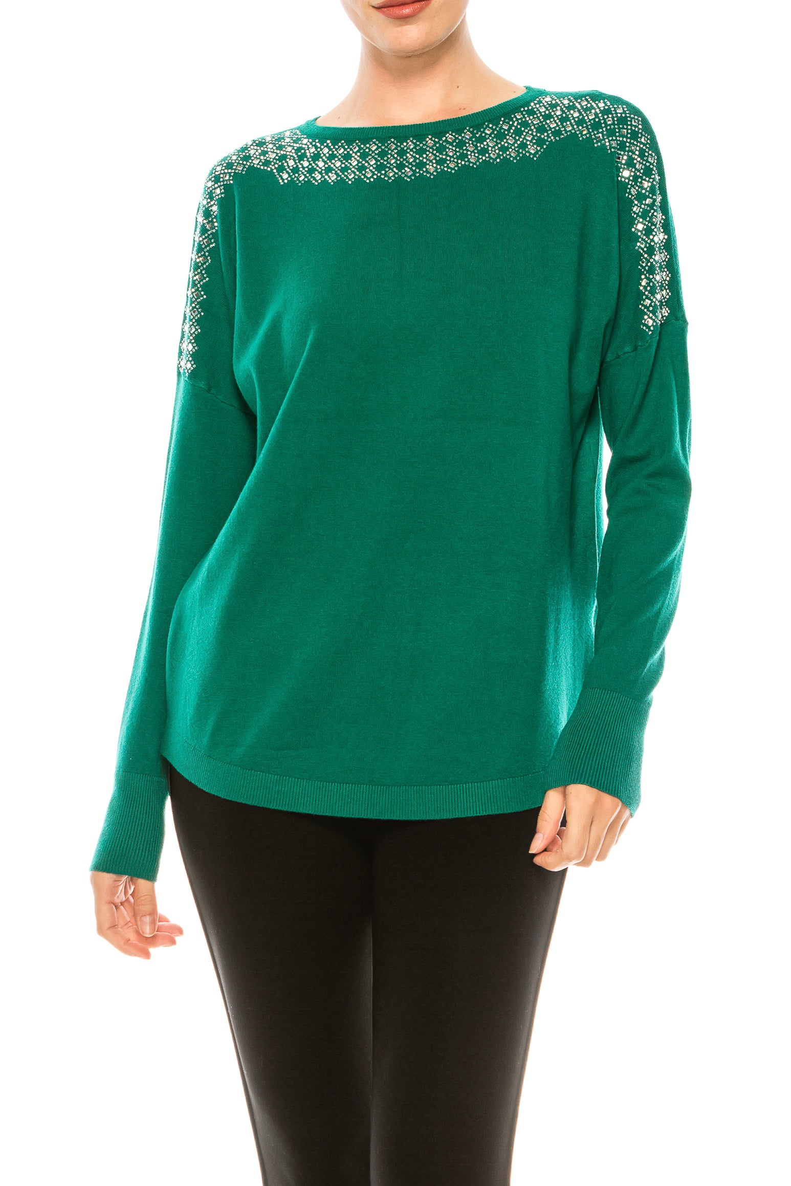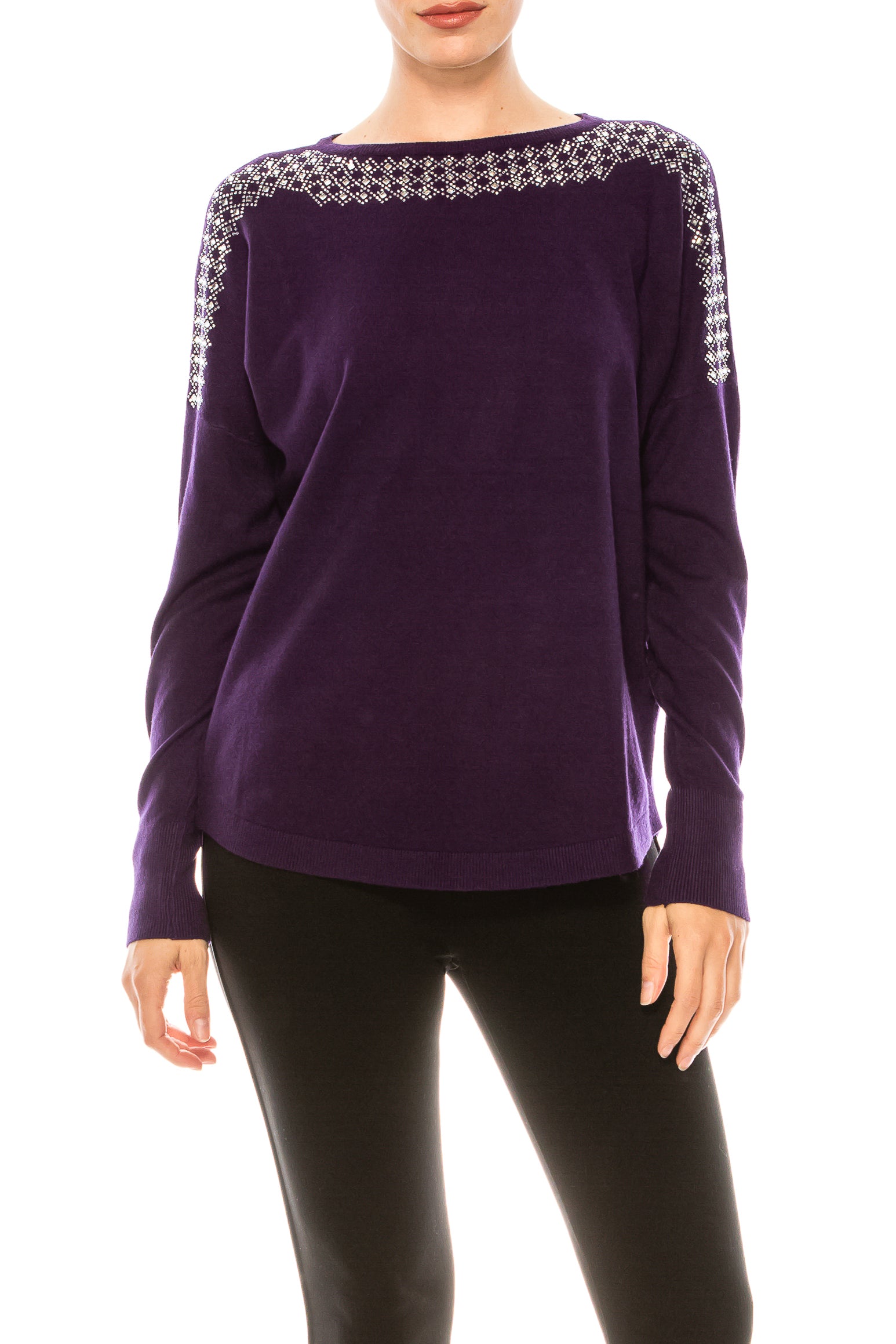So chic is this ever so soft sweater top with drop shoulder sleeves and bling detail with back slit hem. Aaeda sister brand of Sioni