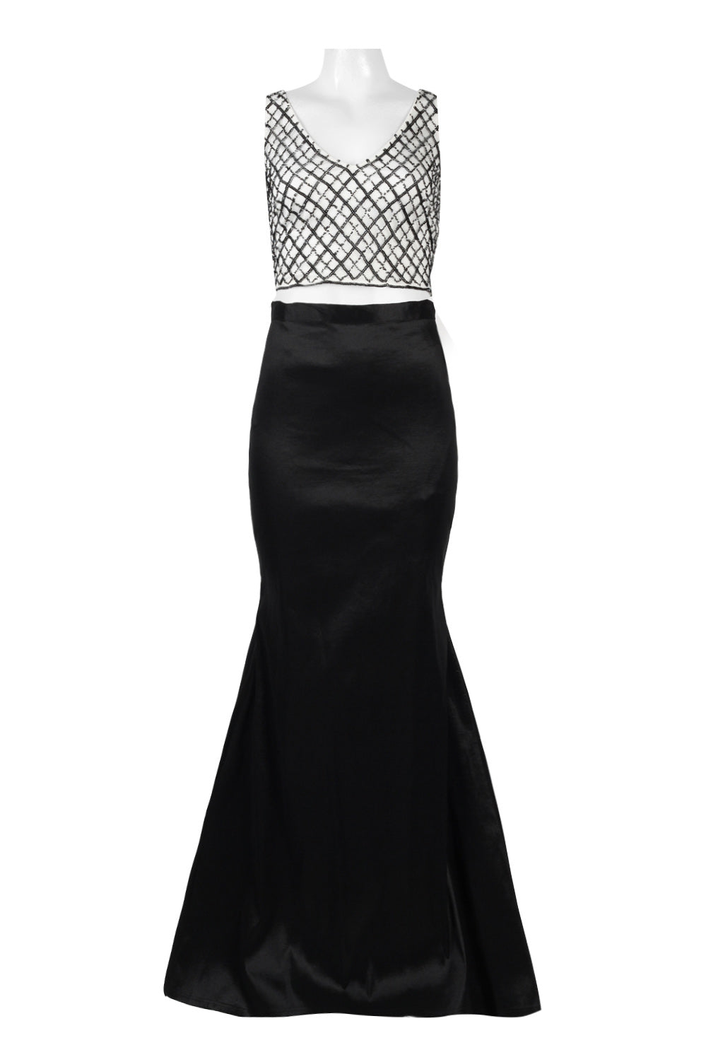 V-Neck Sleeveless Zipper Back Embellished Bodice Mermaid Mesh Taffeta Dress. Lined. By Adrianna Papell.