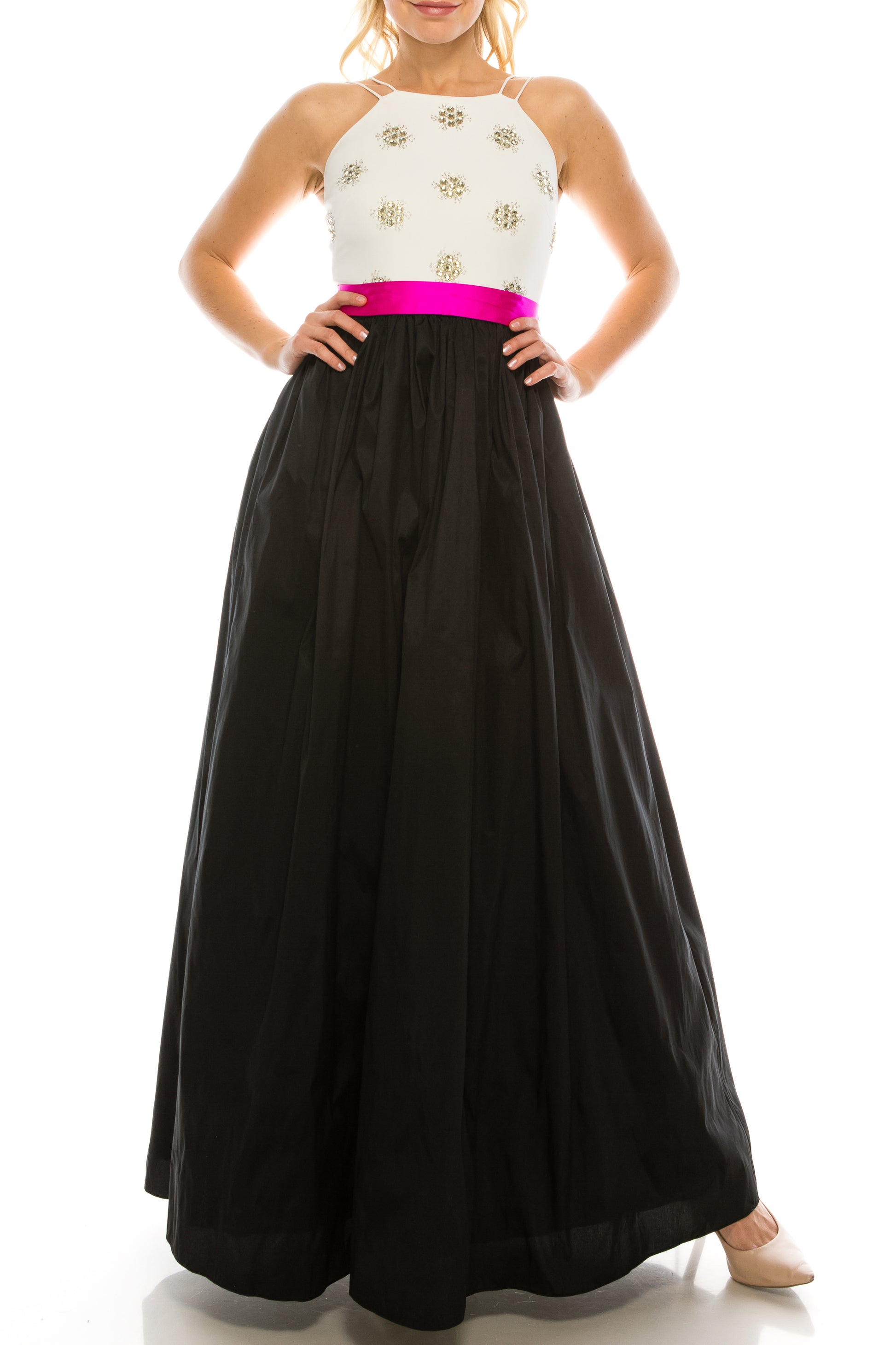 A stunning halter-style dress that features a dual-strap top adorned with floral-shaped rhinestone embellishments, a banded contrast waist, and a long, flowy A-line skirt.