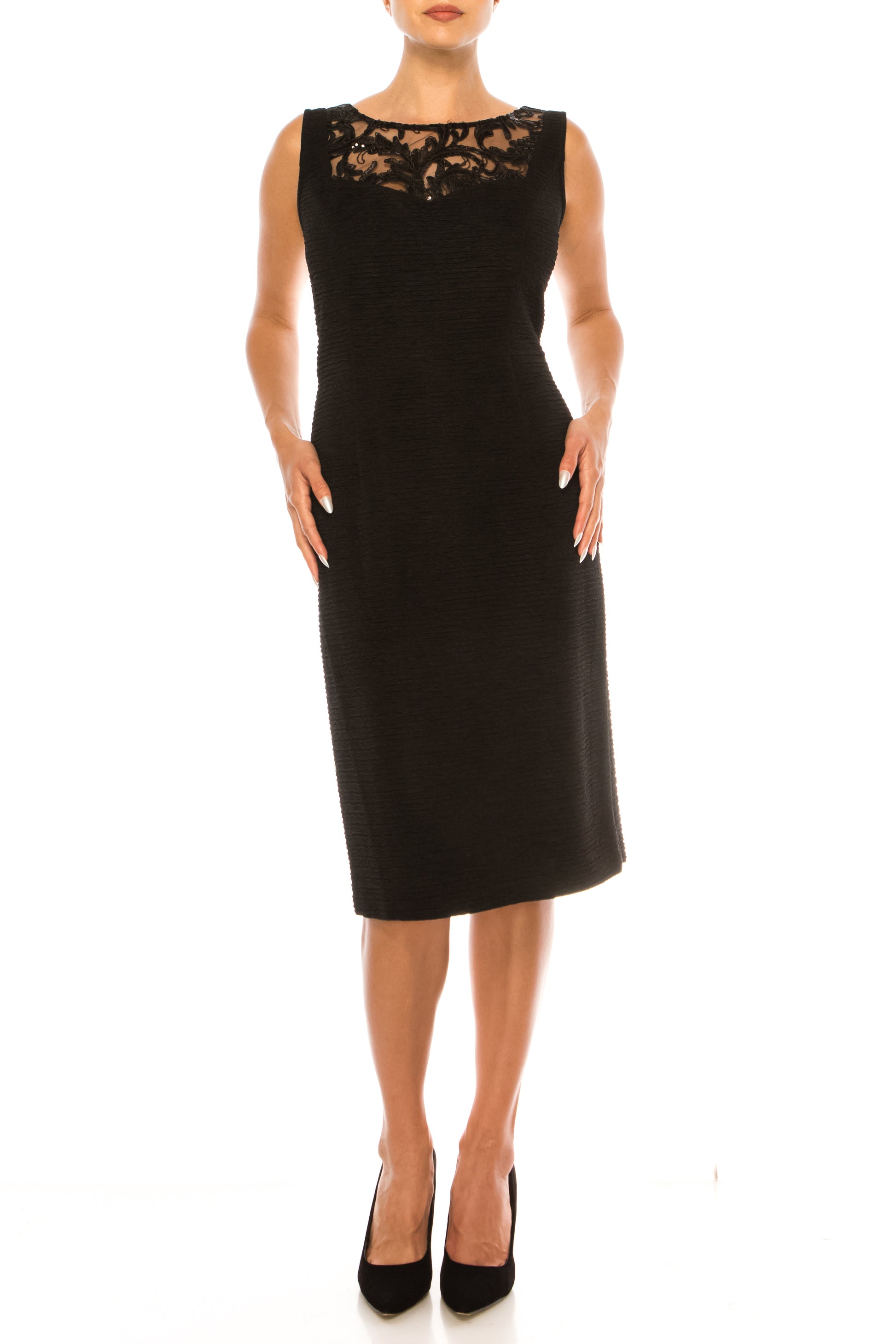 An elegant and sophisticated pintucked and sequin-embroidered tulle trim 2-piece dress suit that features an open cropped, collarless jacket with shoulder pads, and a midi-sheath, sleeveless dress with an illusion semi-sweetheart neckline, back slit, and V-cut back. This dress and jacket set is perfect for religious services, weddings, and luncheons.