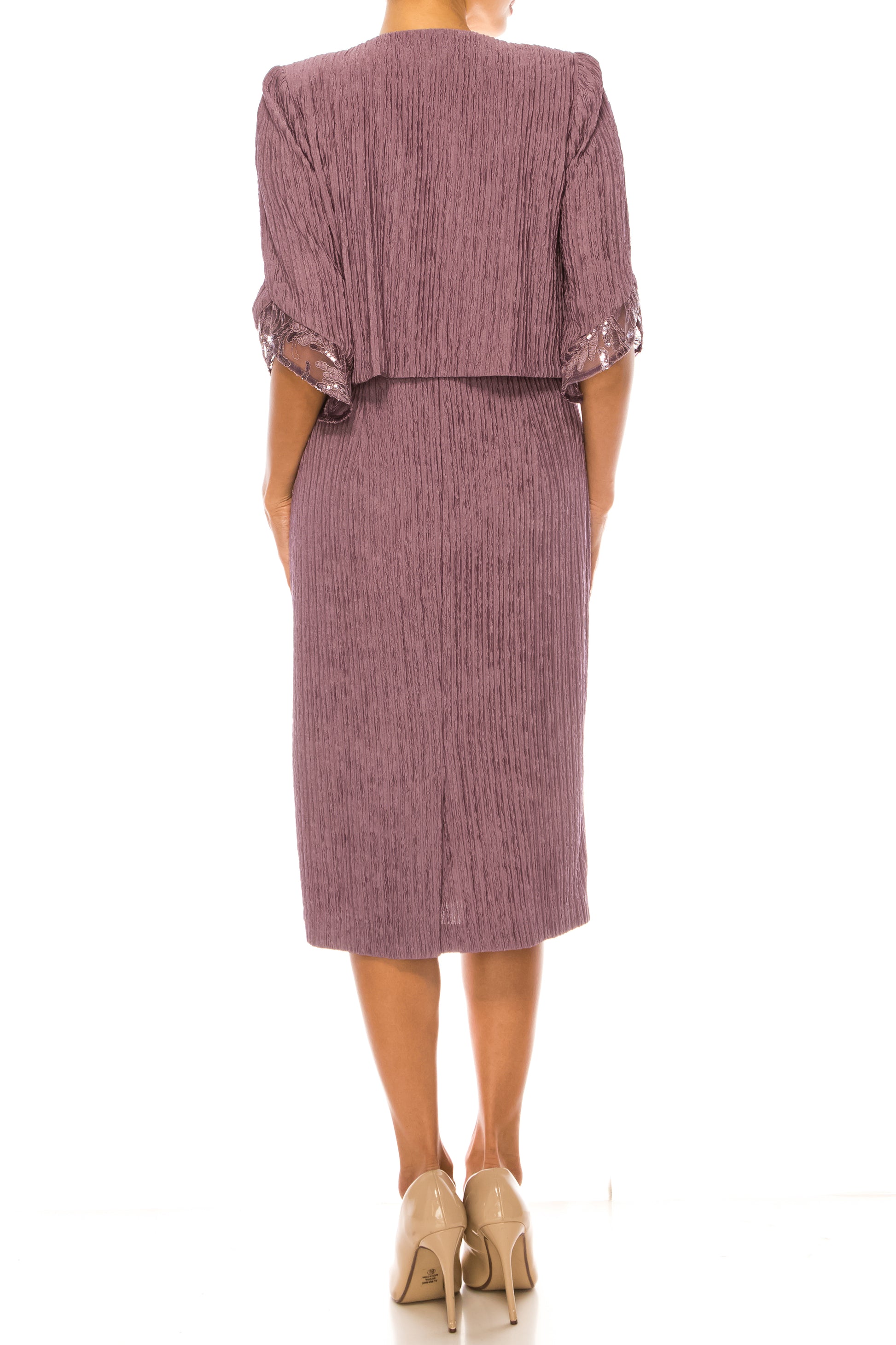 You'll look every bit of regal and divine in this lovely jacket with dress two-piece set that features a cropped, open-front, collar-less jacket with shoulder pads and window-like, embroidered and sequin-cuff, 3/4-sleeves that matches the sweetheart's neckline of the sleeveless, knee-length sheath dress with a back slit. You can wear this dress suit to weddings, parties and religious services.