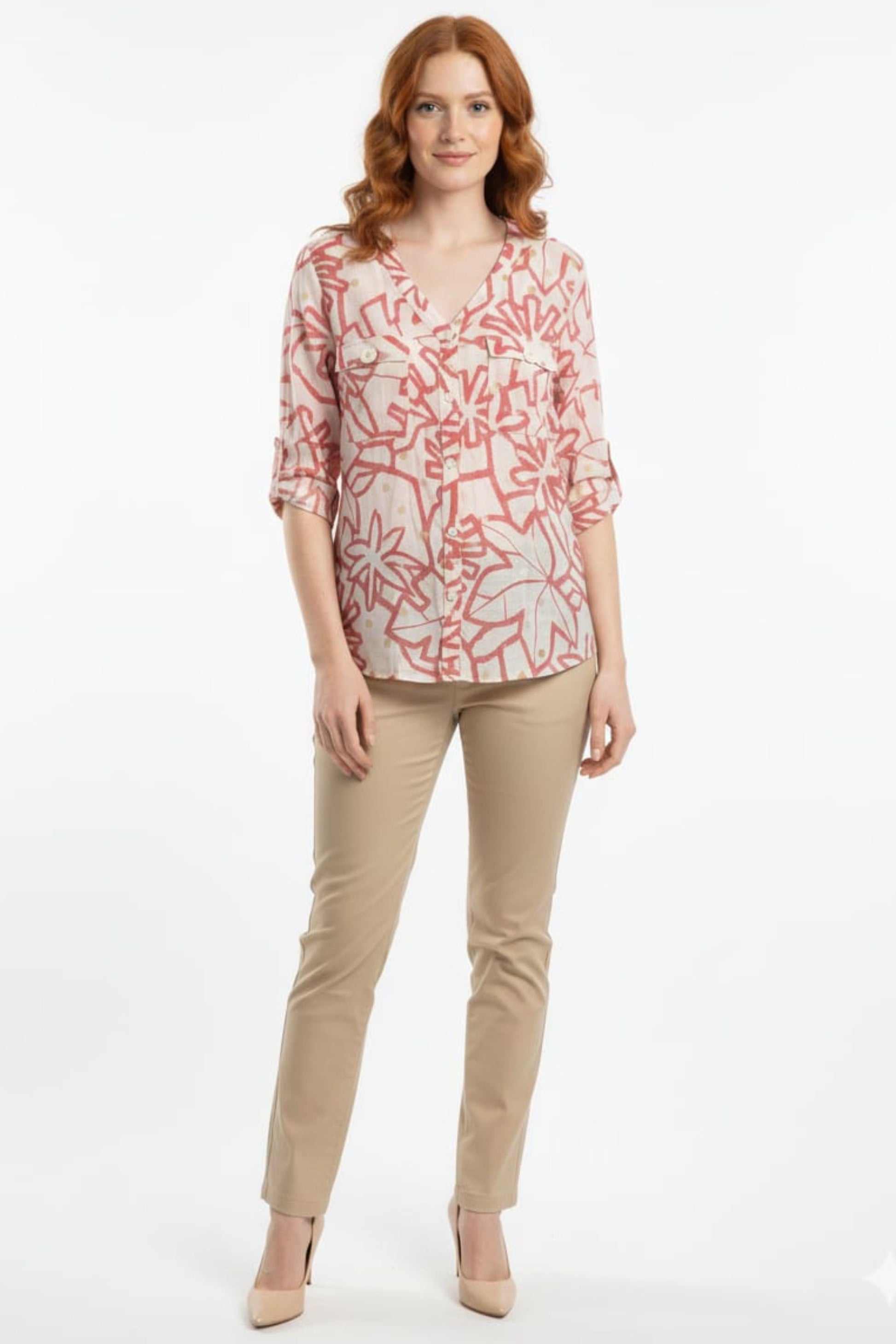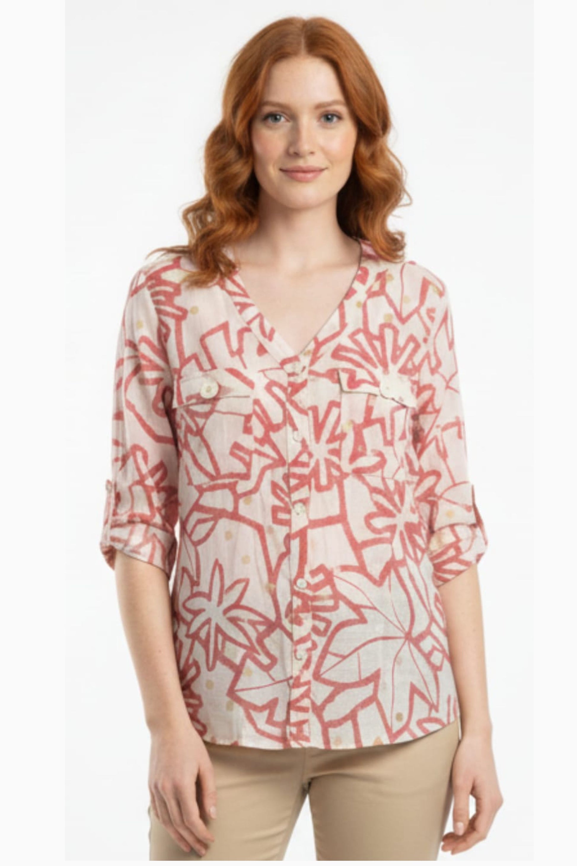 Product Highlights Tropical Botanical Print: A high-definition floral design featuring golden hibiscus flowers and greenery set against a light, airy background for a fresh, summer-ready aesthetic. Functional Double Chest Pockets: Designed with two front chest pockets with flap details, providing a touch of utility-inspired structure to the feminine print. Versatile 3/4 Roll-Tab Sleeves: Includes adjustable roll-tab sleeves, allowing you to switch effortlessly from a polished elbow-length look to a more casual pushed-up style. Classic V-Neckline: Features a flattering V-neck and full button-down front, creating a sleek and lengthening silhouette that is easy to style. Lightweight & Breathable: Crafted from a breezy, semi-sheer fabric that ensures maximum comfort and airflow on even the warmest days.