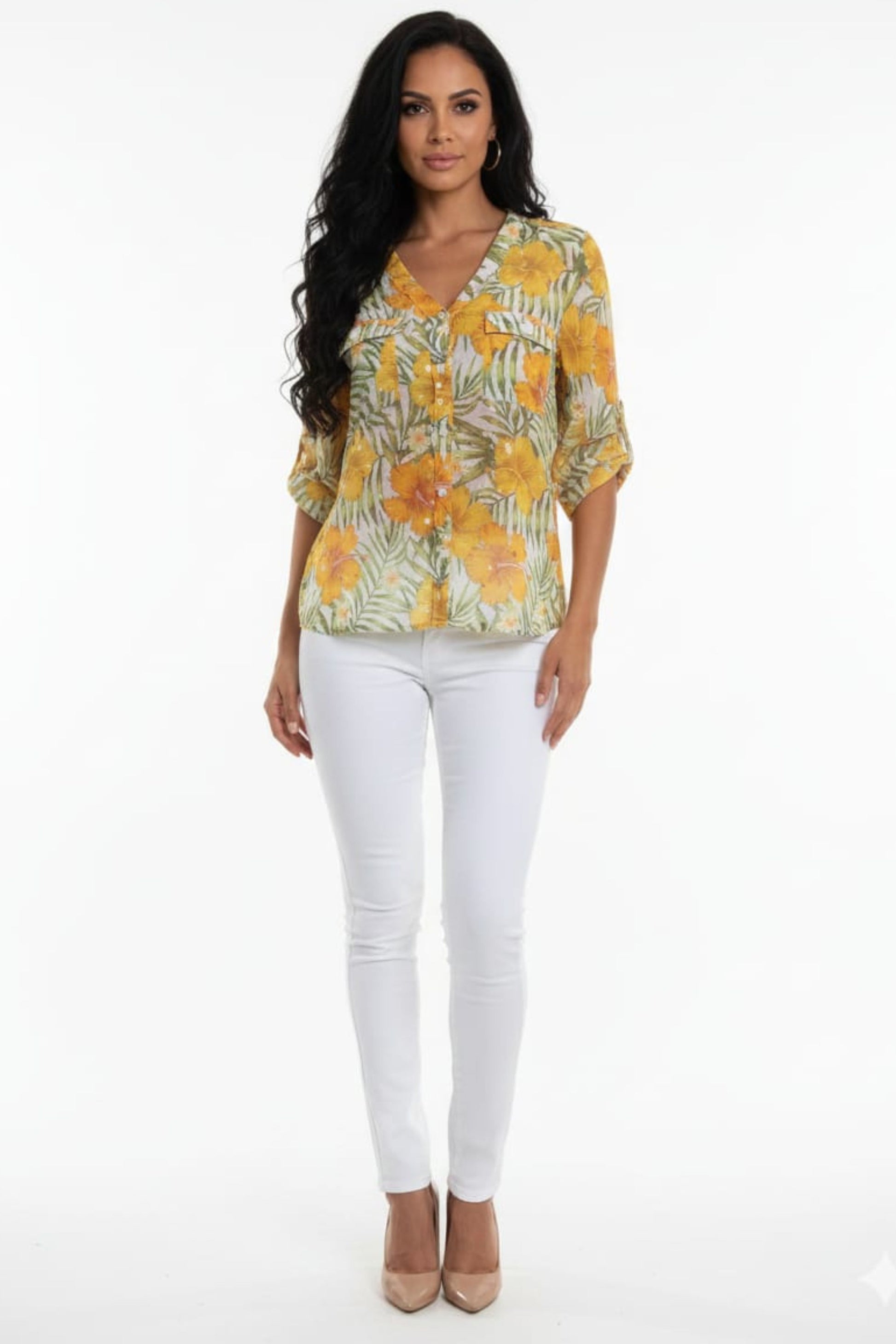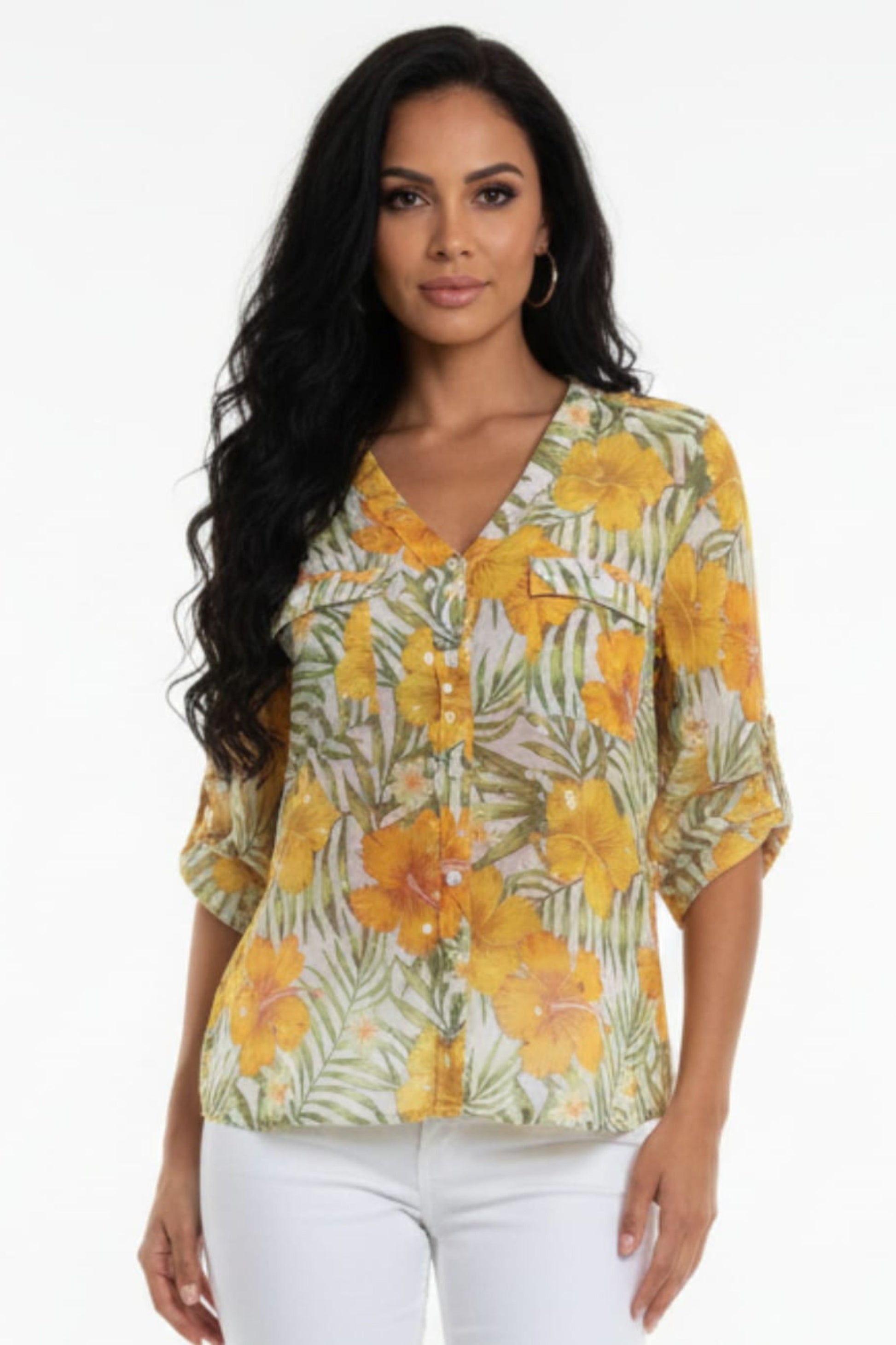 Bring the essence of a summer getaway to your everyday wardrobe with this vibrant Hibiscus Cabana Blouse. Featuring a stunning all-over tropical print, this top combines sun-drenched yellow hibiscus blooms with lush green palm fronds for a quintessential island-inspired look. Whether you're heading to a coastal brunch or a casual day at the office, this blouse adds an instant pop of color and energy to any outfit. Product Highlights Tropical Botanical Print: A high-definition floral design featuring golden hibiscus flowers and greenery set against a light, airy background for a fresh, summer-ready aesthetic. Functional Double Chest Pockets: Designed with two front chest pockets with flap details, providing a touch of utility-inspired structure to the feminine print. Versatile 3/4 Roll-Tab Sleeves: Includes adjustable roll-tab sleeves, allowing you to switch effortlessly from a polished elbow-length look to a more casual pushed-up style. Classic V-Neckline: Features a flattering V-neck and full button-down front, creating a sleek and lengthening silhouette that is easy to style. Lightweight & Breathable: Crafted from a breezy, semi-sheer fabric that ensures maximum comfort and airflow on even the warmest days.