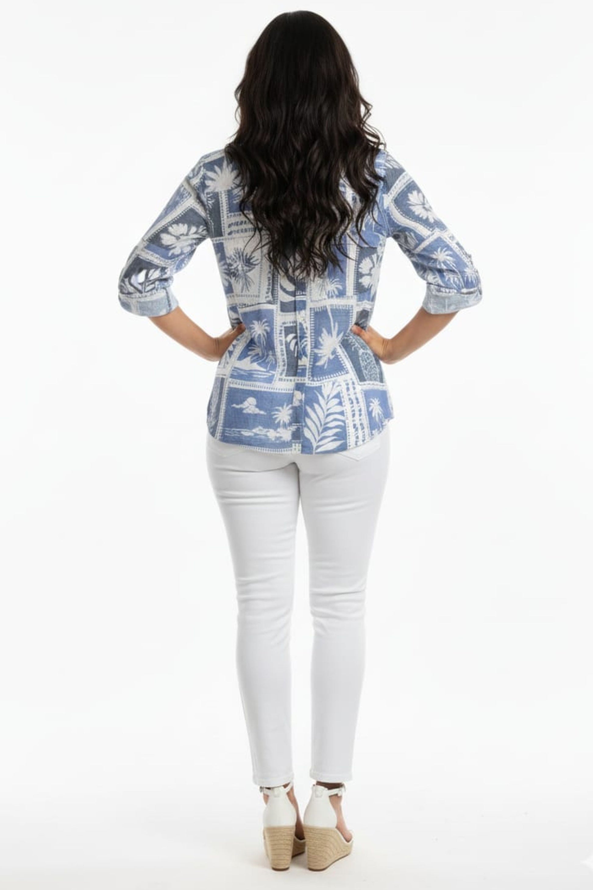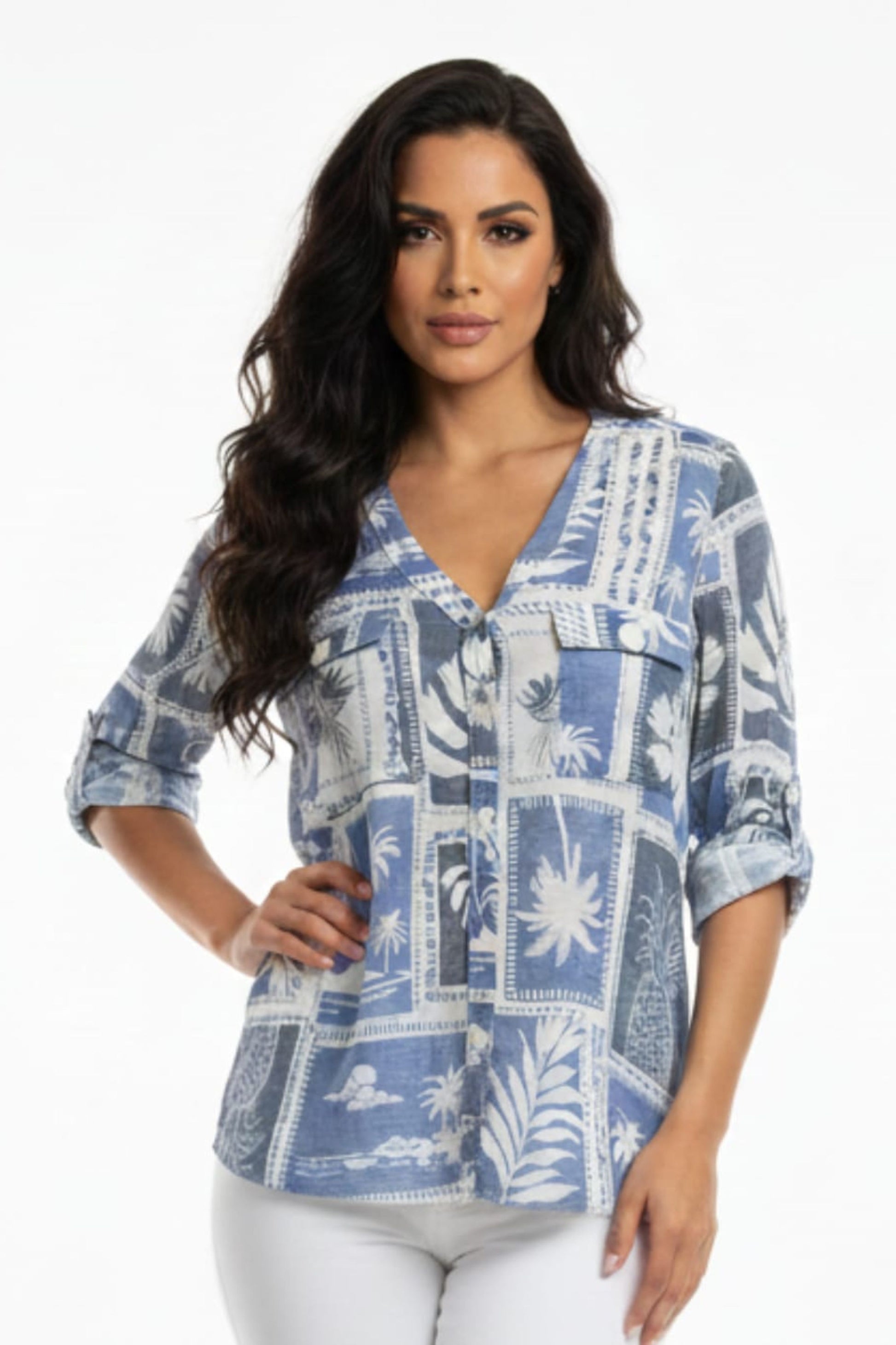 Product Highlights Tropical Botanical Print: A high-definition floral design featuring golden hibiscus flowers and greenery set against a light, airy background for a fresh, summer-ready aesthetic. Functional Double Chest Pockets: Designed with two front chest pockets with flap details, providing a touch of utility-inspired structure to the feminine print. Versatile 3/4 Roll-Tab Sleeves: Includes adjustable roll-tab sleeves, allowing you to switch effortlessly from a polished elbow-length look to a more casual pushed-up style. Classic V-Neckline: Features a flattering V-neck and full button-down front, creating a sleek and lengthening silhouette that is easy to style. Lightweight & Breathable: Crafted from a breezy, semi-sheer fabric that ensures maximum comfort and airflow on even the warmest days.