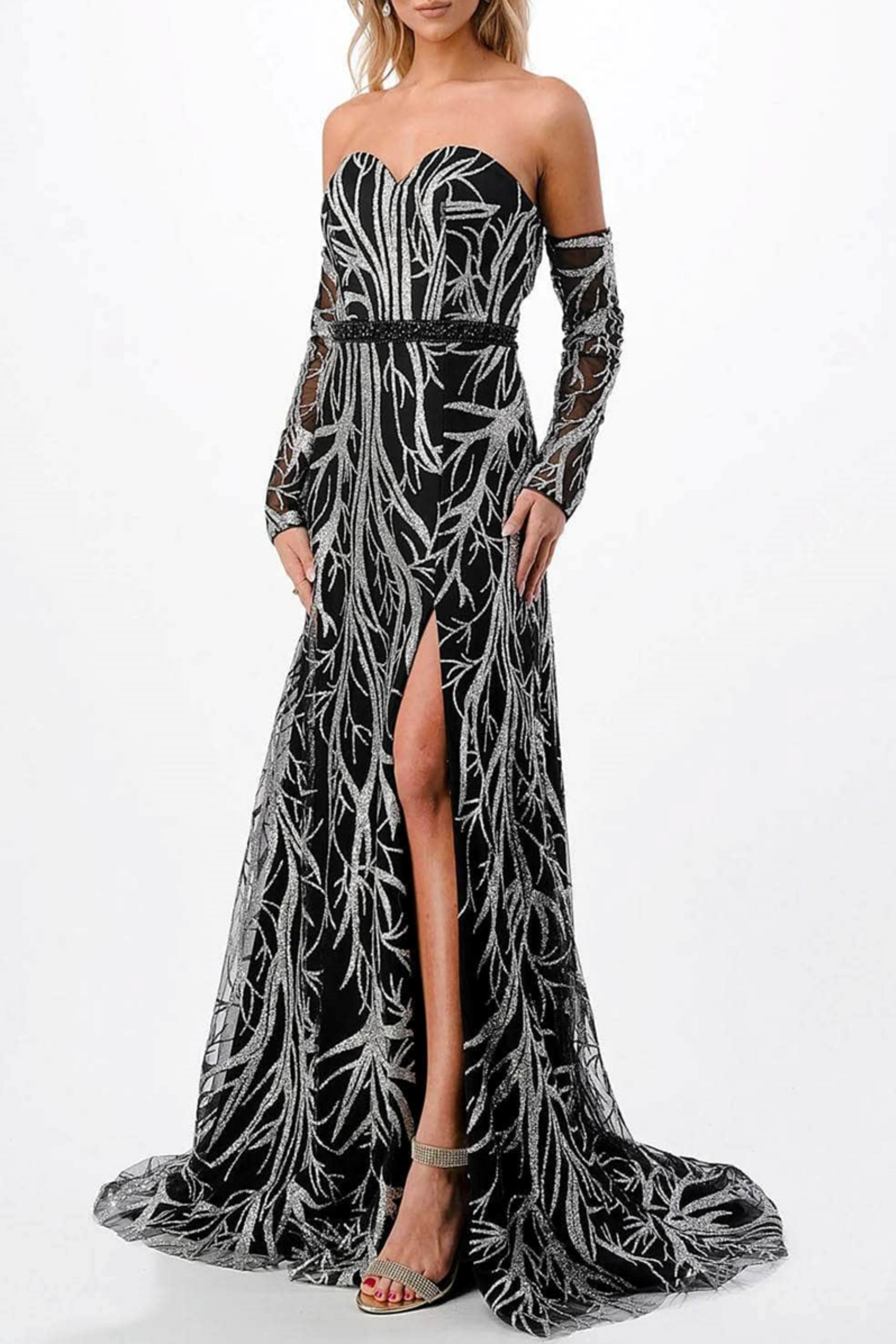 This formal dress is the epitome of spectacular, and it's the ultimate black tie attire for attending galas, balls, weddings, proms and an array of special occasion events. This breathtaking evening dress features all-around sparkly detail in a branch-like motif, a sweetheart's neckline, matching removable sleeves, a cluster of beading beltline, and a floor-length, draped train skirt with a side slit.