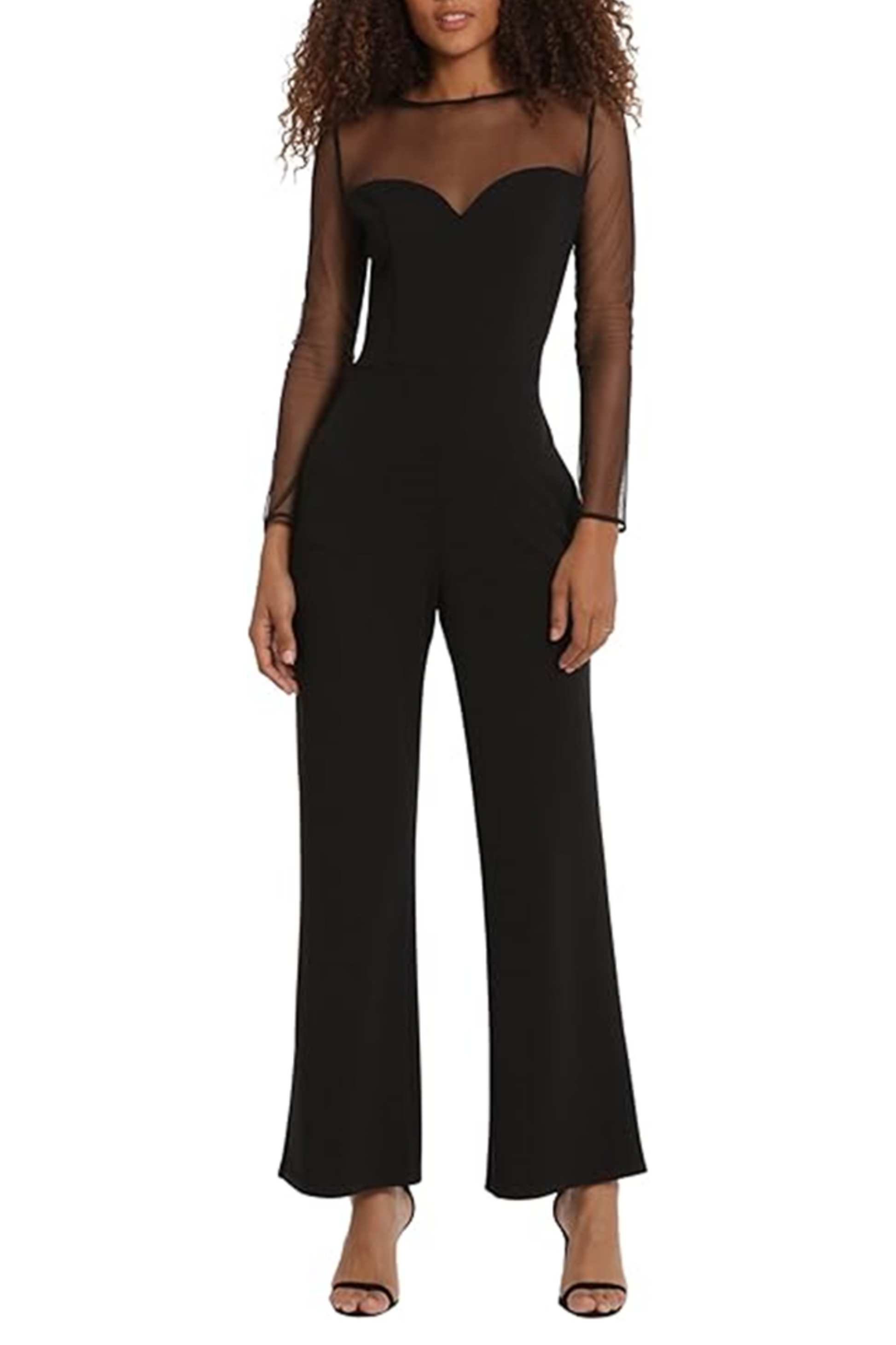 When you're tired of wearing dresses to fancy events, a dressy jumpsuit comes in handy, and this fabulous one features an illusion neckline and long sheer sleeves, a sweetheart's neckline, wide leg styling and hidden side pockets. This evening jumpsuit is made for nighttime affairs such as cocktail and dinner parties, birthday and holiday celebrations, weddings, and galas.