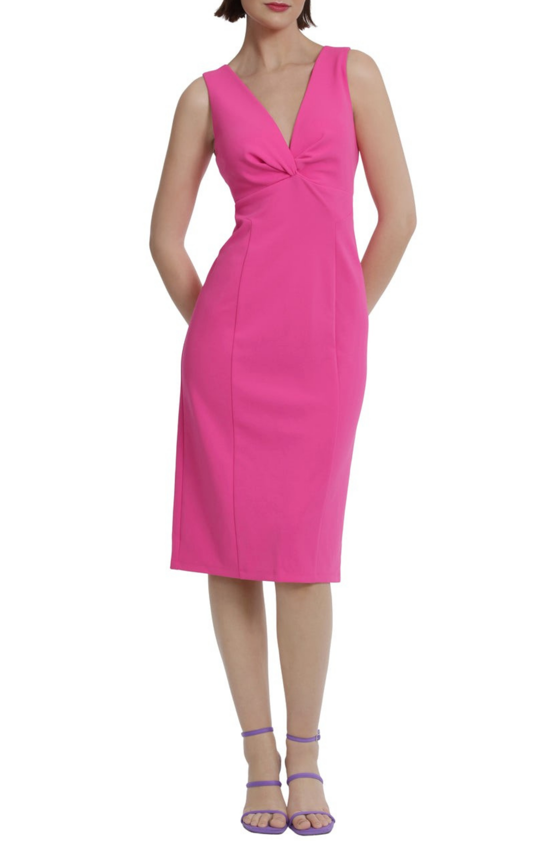 A must-have spring and summer dress that shows off your waistline, and it features a sleeveless and sheath silhouette, a V-neckline and back with folded frontal detail along the bodice, a knee-length skirt with a back slit that pairs nicely with strappy heels, pumps, or sandals, and can be worn to affairs like gender reveals, birthday parties, derbies, luncheons, and Sunday brunches.