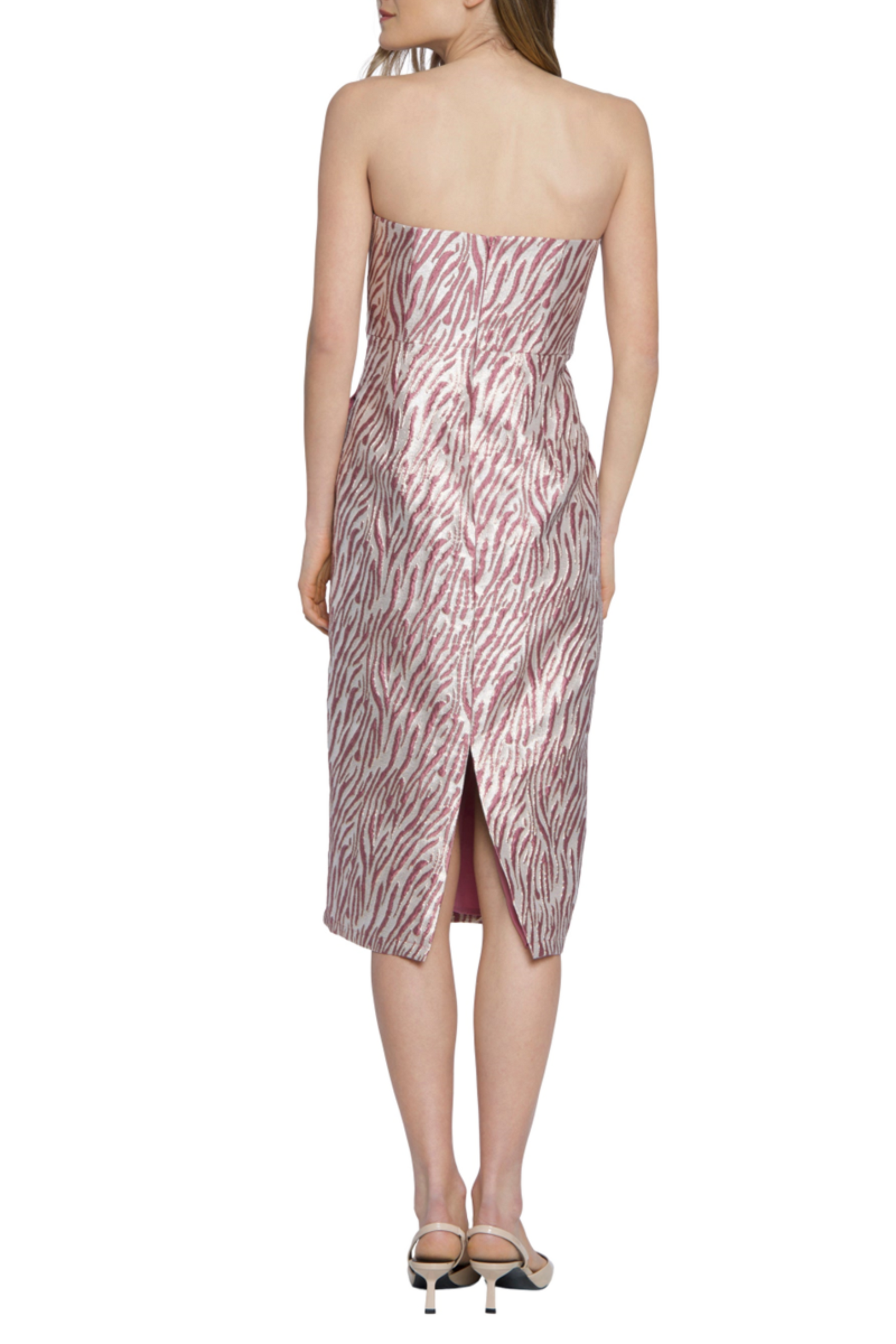 You're sure to outshine the rest in this elegant strapless dress at your next wedding, gala, birthday celebration, homecoming or cocktail party you attend. This stunning evening dress features an overall animal-like motif with metallic gold detail, a midi-length skirt with a back slit, a strapless silhouette with a sweetheart's neckline, and a pleated waistline.