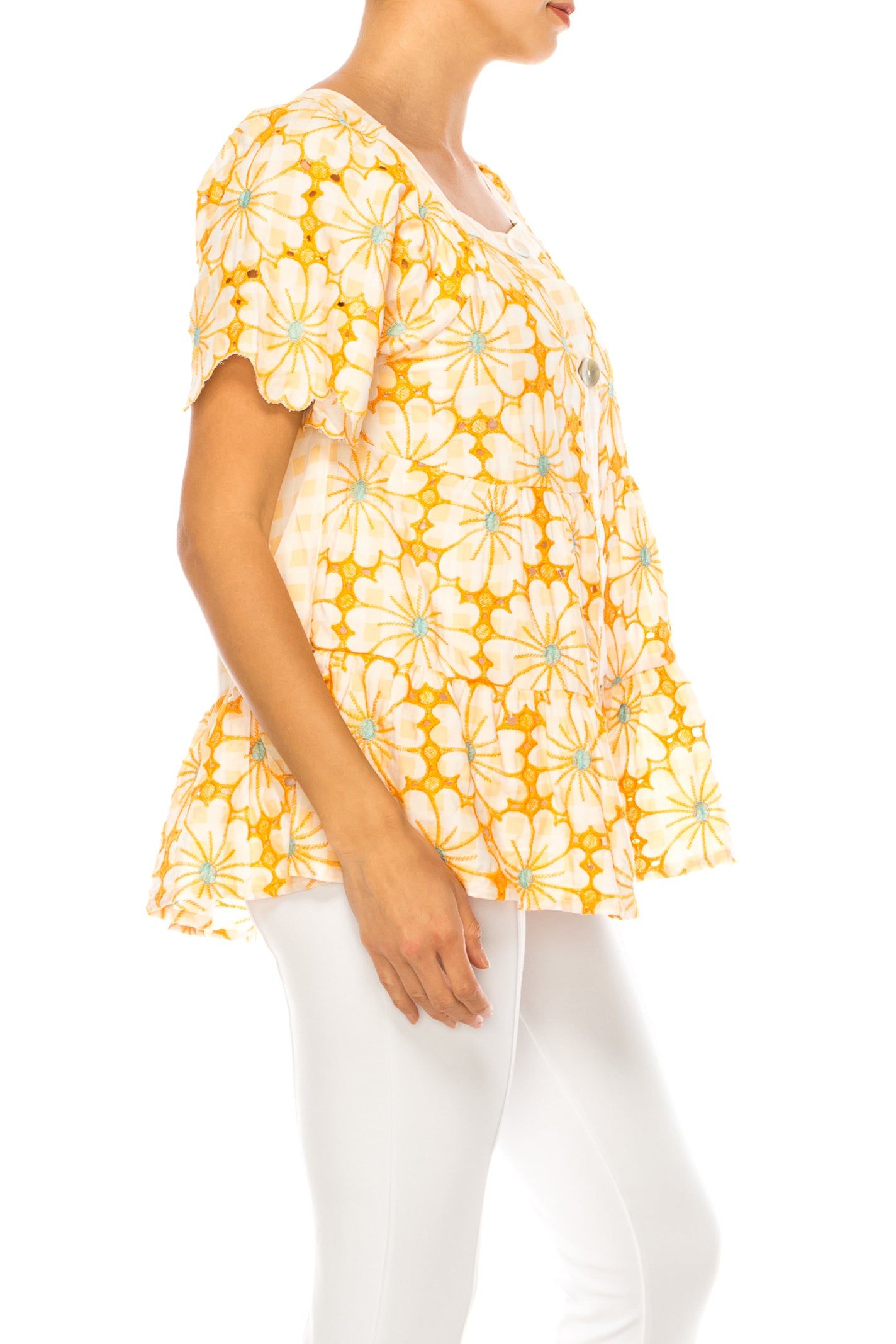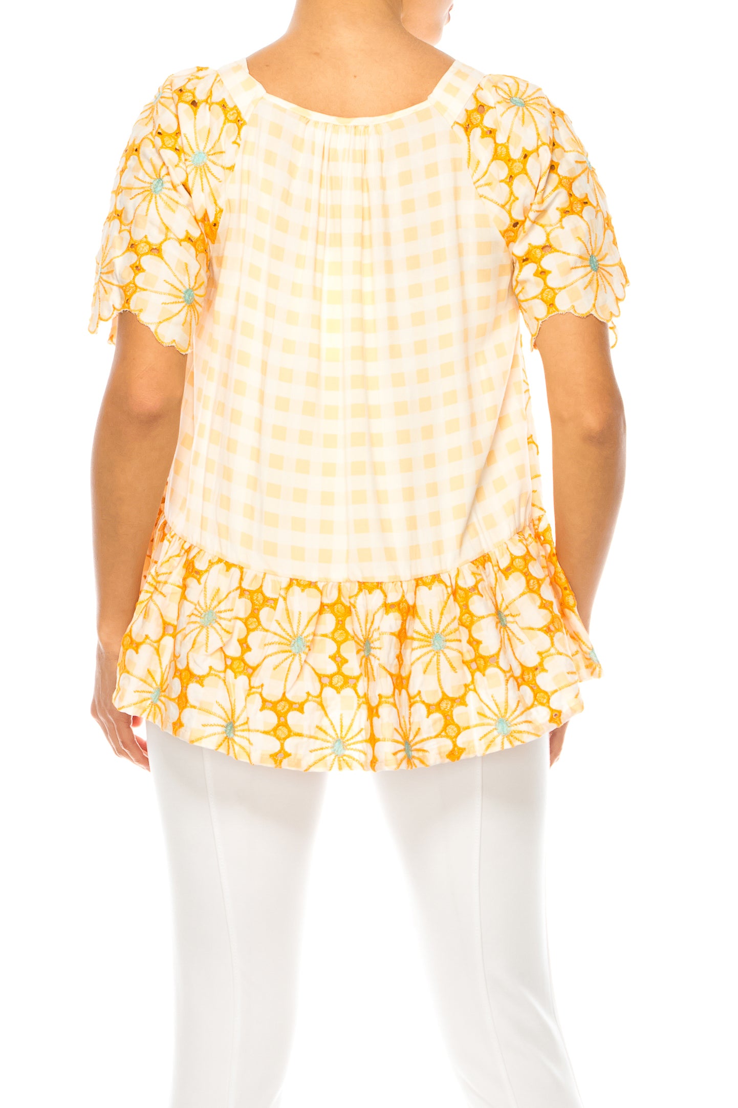 An enchanting short sleeve shirt that pairs well with shorts, skirts, pants and jeans, features a checkered print with a floral embroidered overlay motif, a loose fit with a tiered design, a button-down placket with large iridescent buttons, short scalloped sleeves, and a square neckline. This spring and summer blouse is perfect for outings like lunch dates, weekend brunches, and birthday parties.