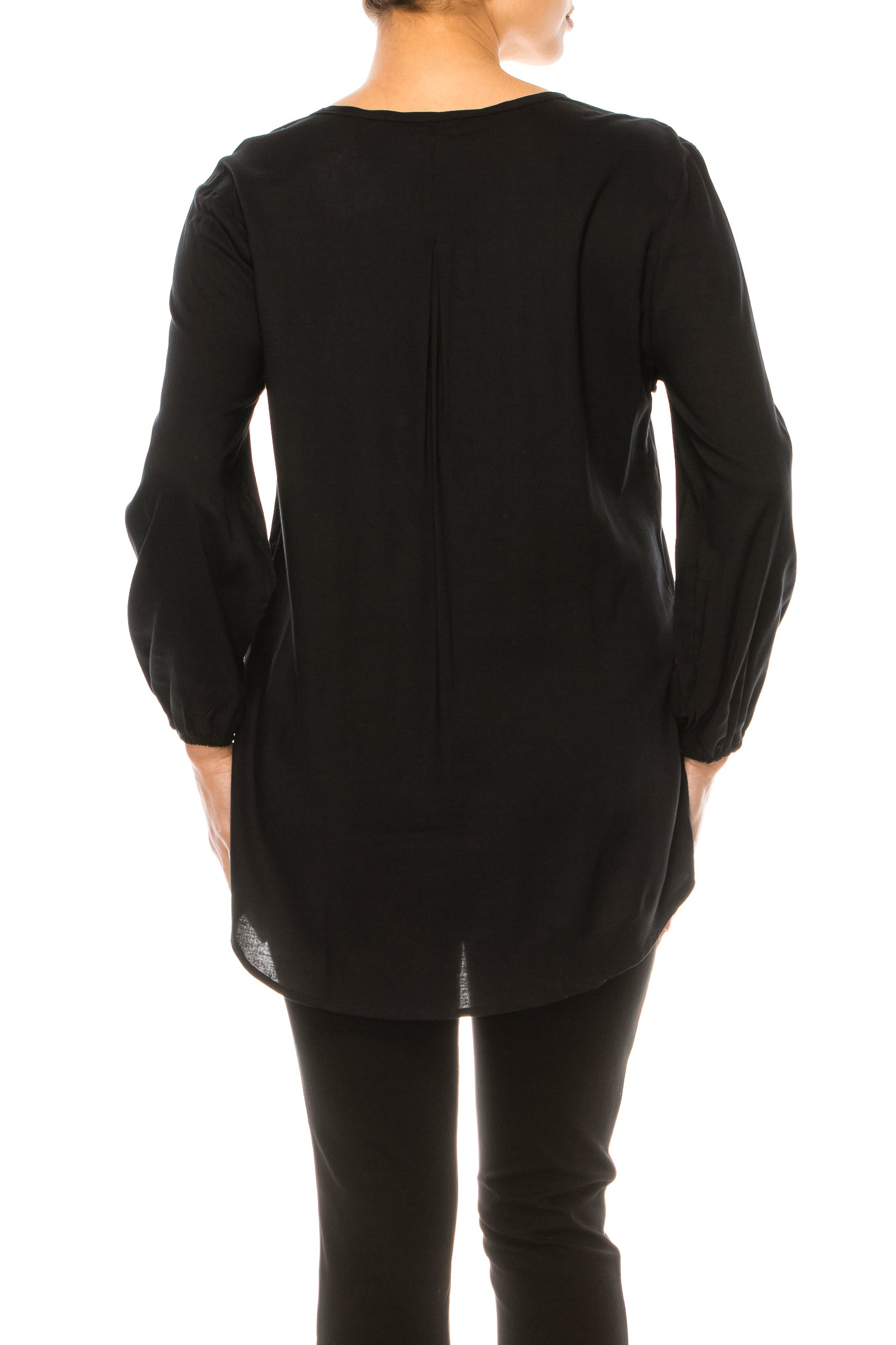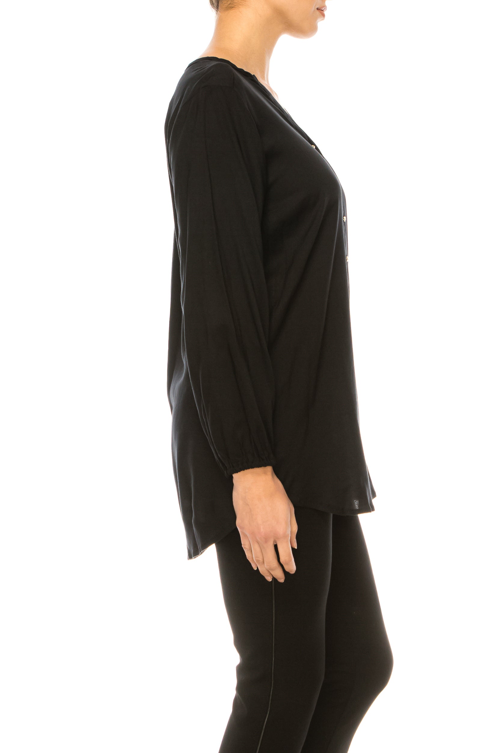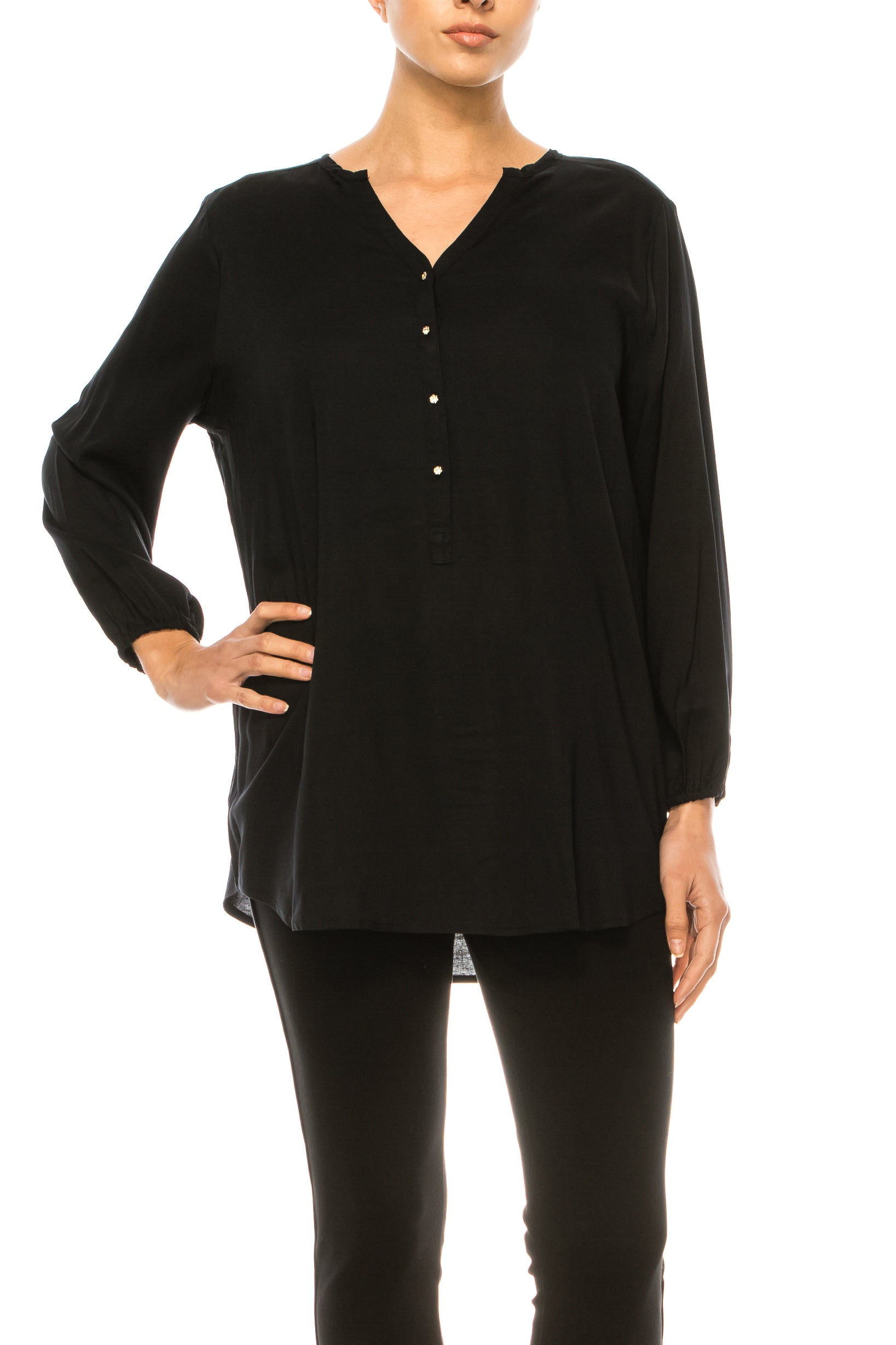 This casual yet sophisticated shirt features a half-button placket with stud-like rhinestone embellished buttons along with elastic cuff sleeves.