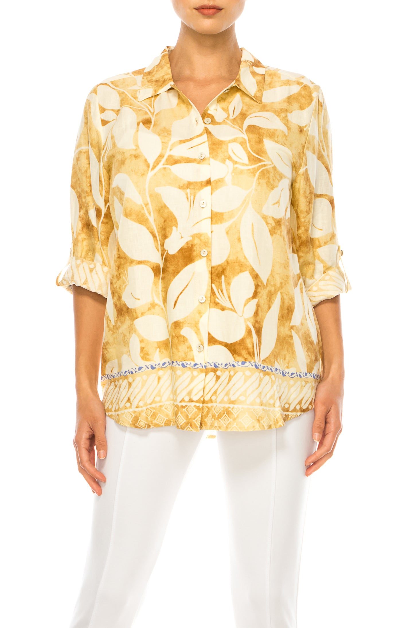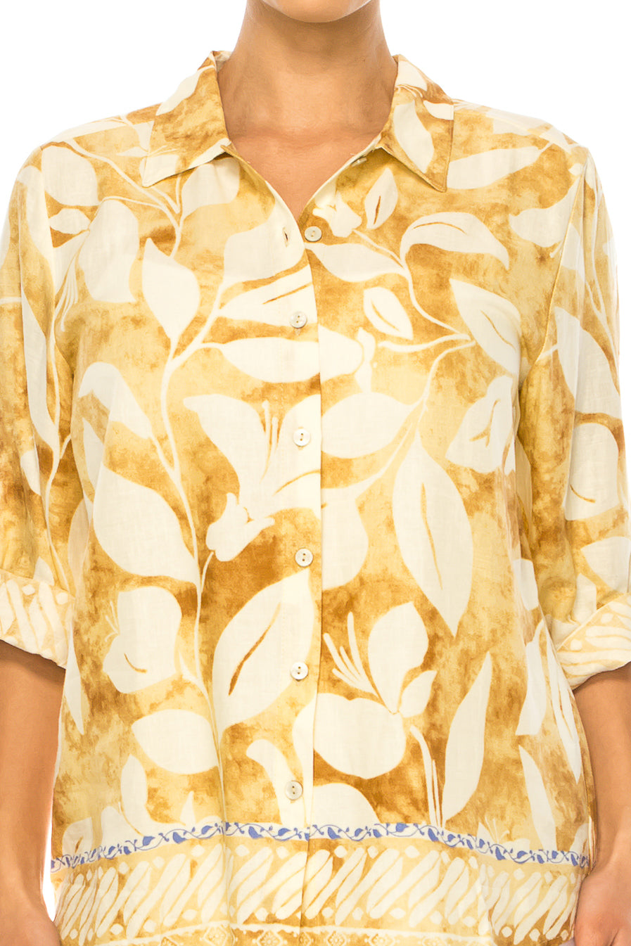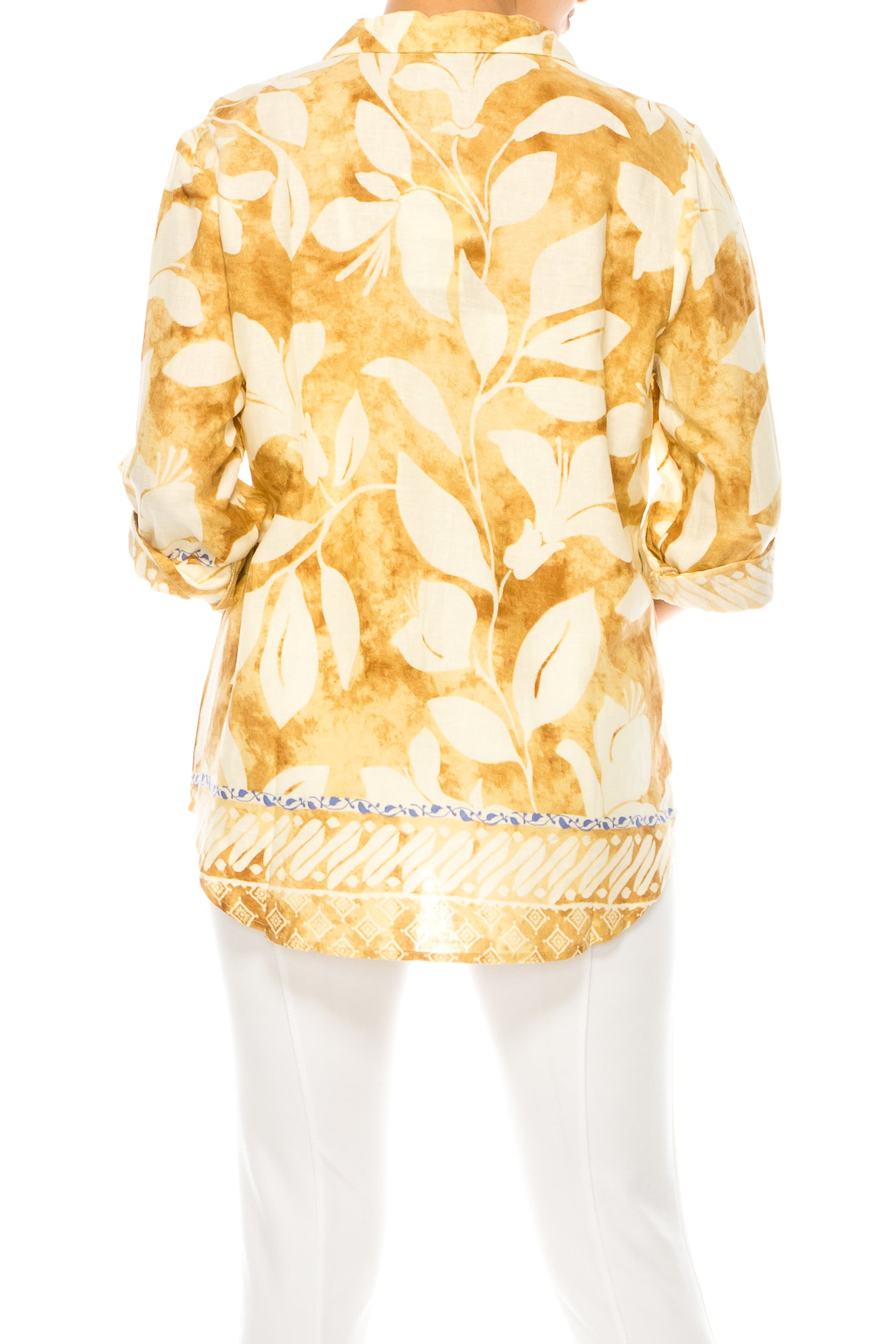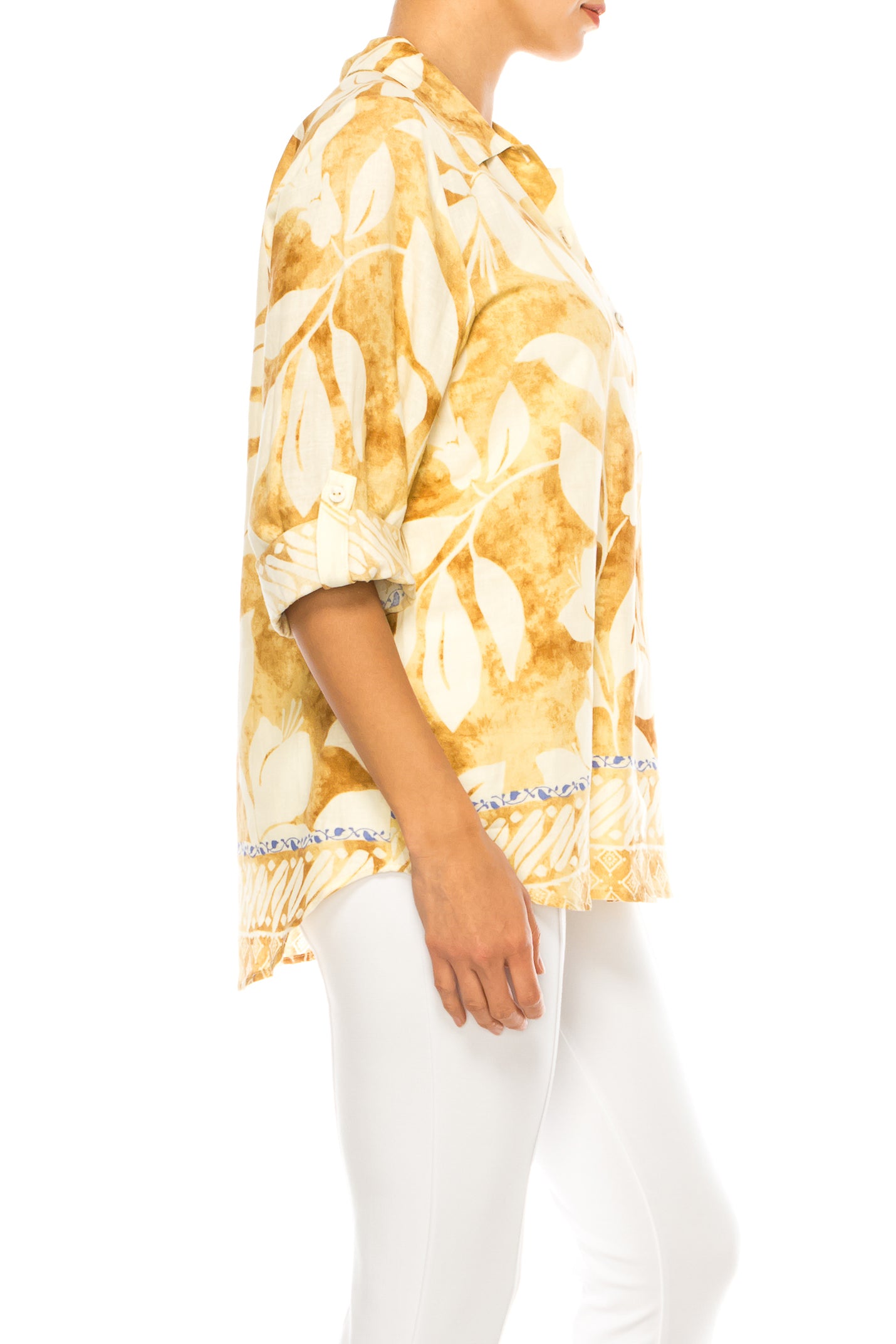 This beautiful button up women's top that features a loose fit, a lovely floral contrast print that decorates the lower half and sleeves, a spread collar, a button-down placket with iridescent buttons, and adjustable one-button strap sleeves that can be worn as a 3/4th or long sleeve shirt year-round to work, dinner dates, birthday parties, brunches, lunches, and cocktail hours with slacks, blazers, jeans, skirts, sweaters, and shorts.