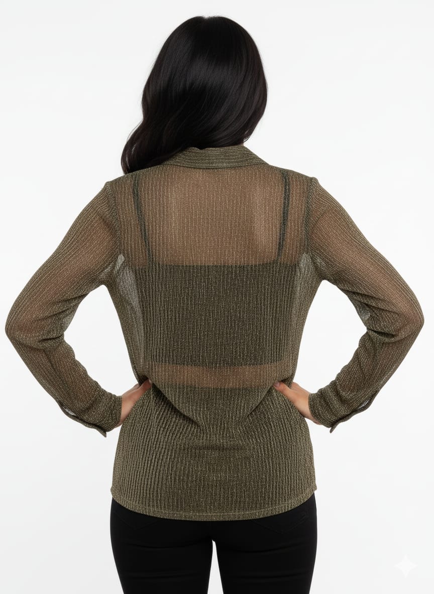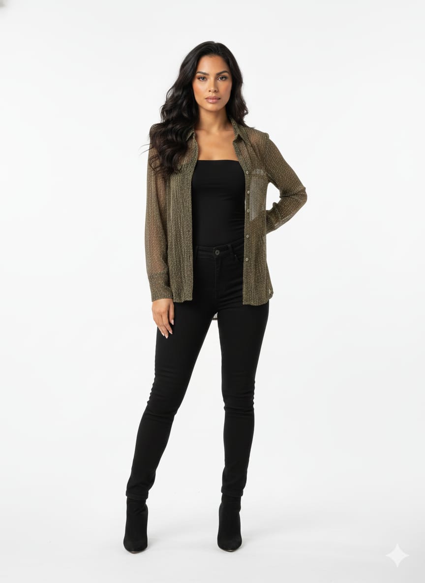 Elevate your evening ensemble with this stunning Midnight Gold Shimmer Blouse. Perfectly blending a sophisticated silhouette with eye-catching texture, this top features a luxurious metallic finish that catches the light beautifully. Whether you’re dressing for a holiday party, a dinner date, or a night out, this piece offers a refined glam aesthetic that is both modern and timeless. Product Highlights Radiant Metallic Texture: Crafted from a premium plissé pleated fabric, this blouse boasts vertical micro-ribbing infused with fine gold-tone metallic threads for a sophisticated shimmer. Versatile Button-Down Design: Featuring a full-length button placket and a classic pointed collar, this top can be worn fully closed for a polished look or styled open as a chic lightweight duster. Sheer Elegance: The semi-sheer, airy material provides a delicate drape, making it the perfect layering piece over a sleek camisole or bralette. Tailored Silhouette: Designed with long sleeves and buttoned cuffs, the relaxed yet structured fit ensures a flattering silhouette that moves gracefully with you. Modern Color Palette: The rich, deep olive and black undertones paired with gold shimmer make this a versatile staple for any evening wardrobe.