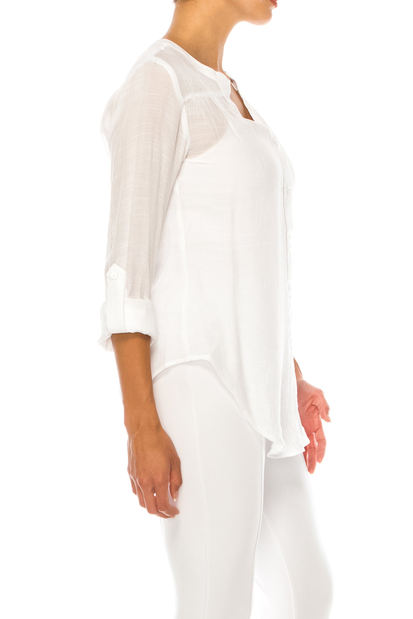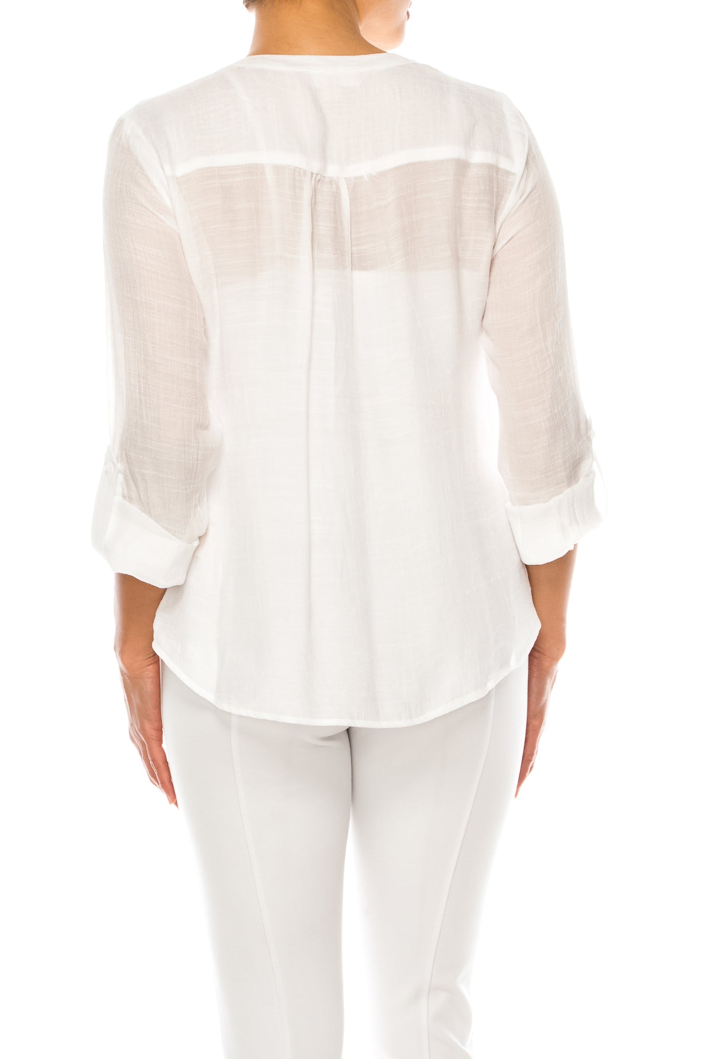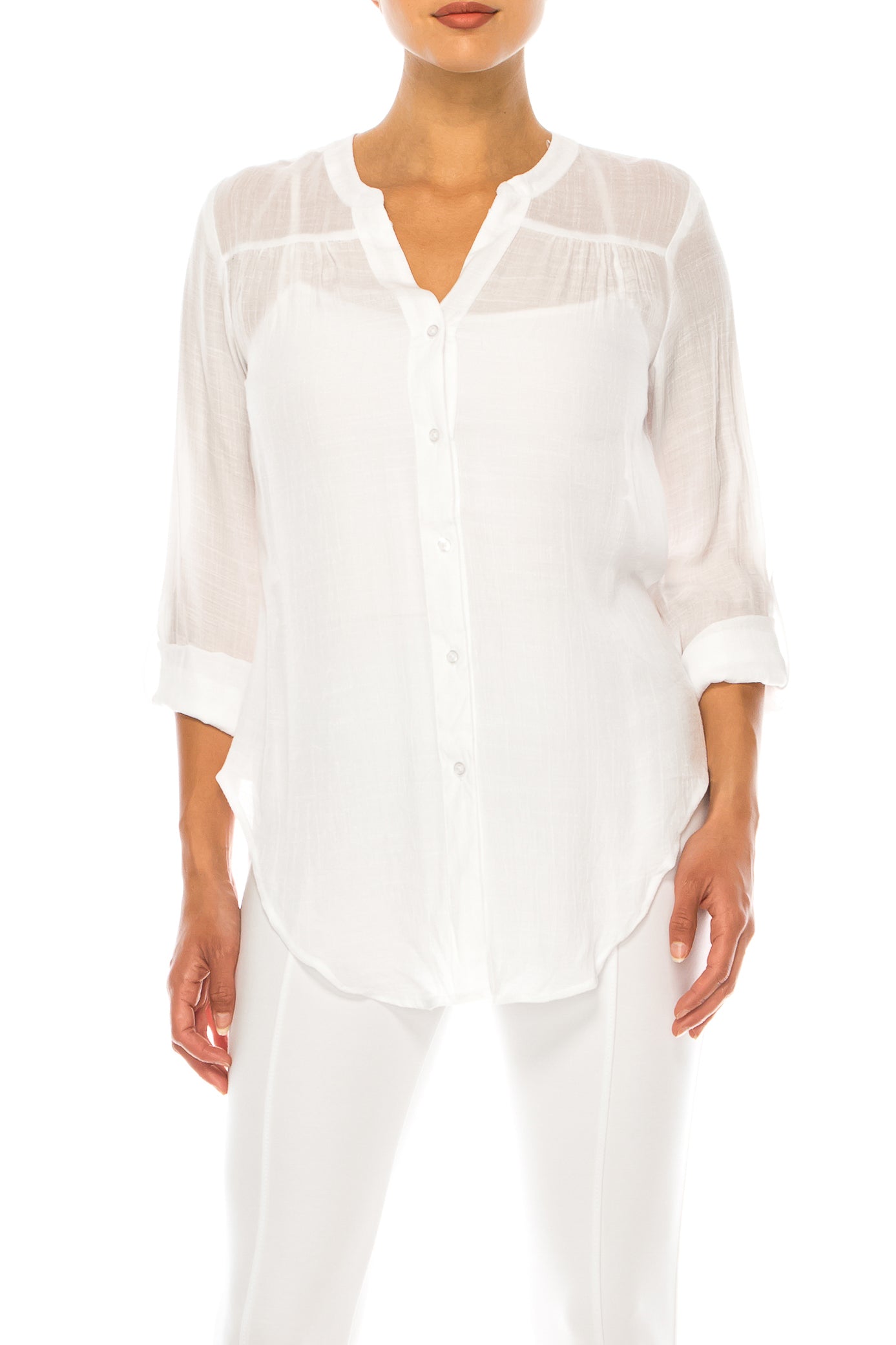 Every girl needs to have that one go-to lightweight button down shirt for those warm-weather spring and summer days, and this beauty features a collarless V-neckline, adjustable, one-button tab sleeves to be worn at the 3/4th or long length, and a button-down placket. This V neck top looks nice when paired with camisoles, jeans, slacks, skirts, and shorts.
