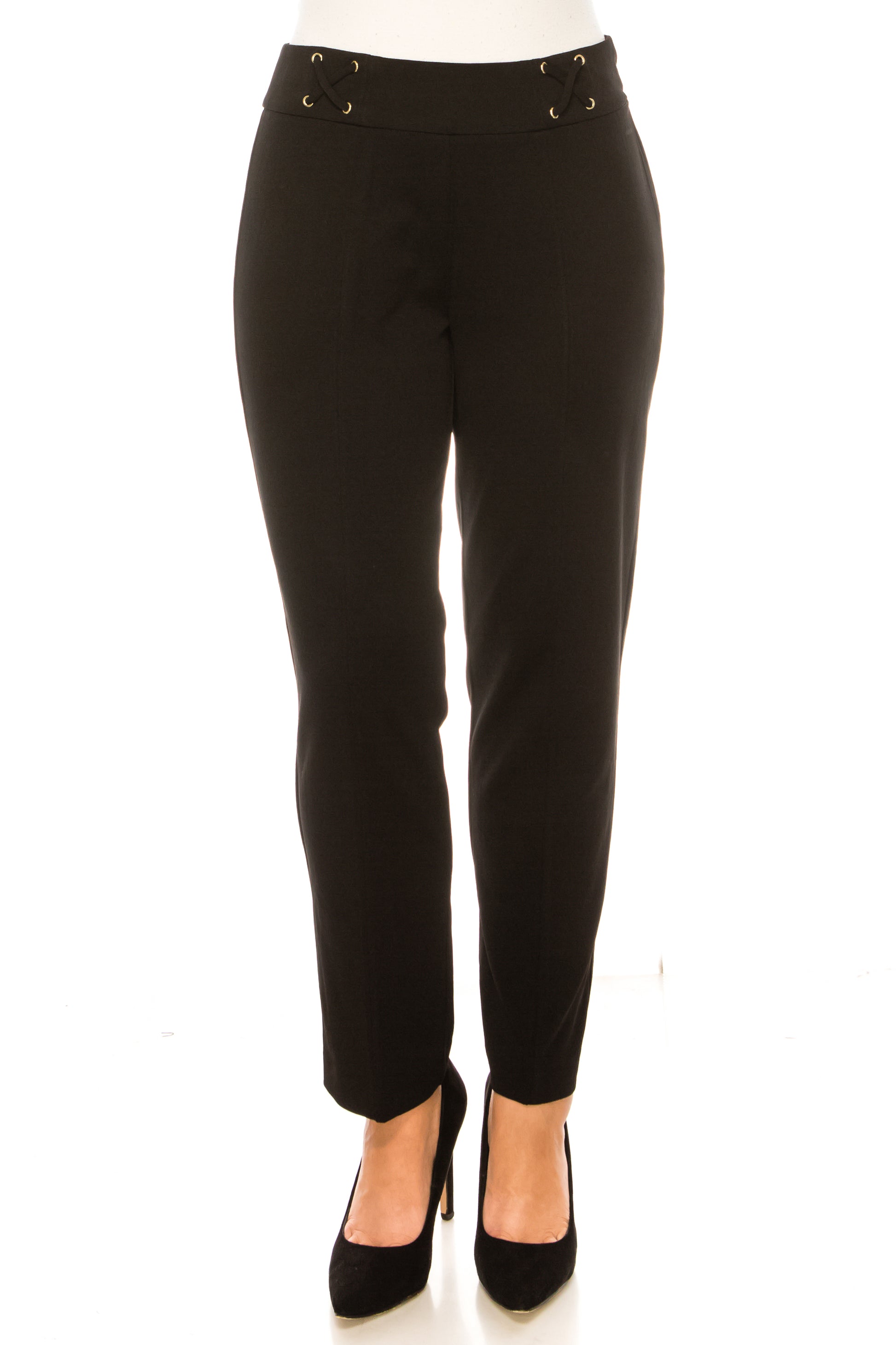 Dress up or down these sophisticated pull on pants for women that pair nicely with sweaters, t-shirts, blazers, and button-down shirts that feature a comfortable and stretchy feel straight leg styling, a high waist, and a beltline with two criss-cross laced eyelet side details that can be worn year-round to work, dinners, date nights, cocktail hours and a variety of parties.