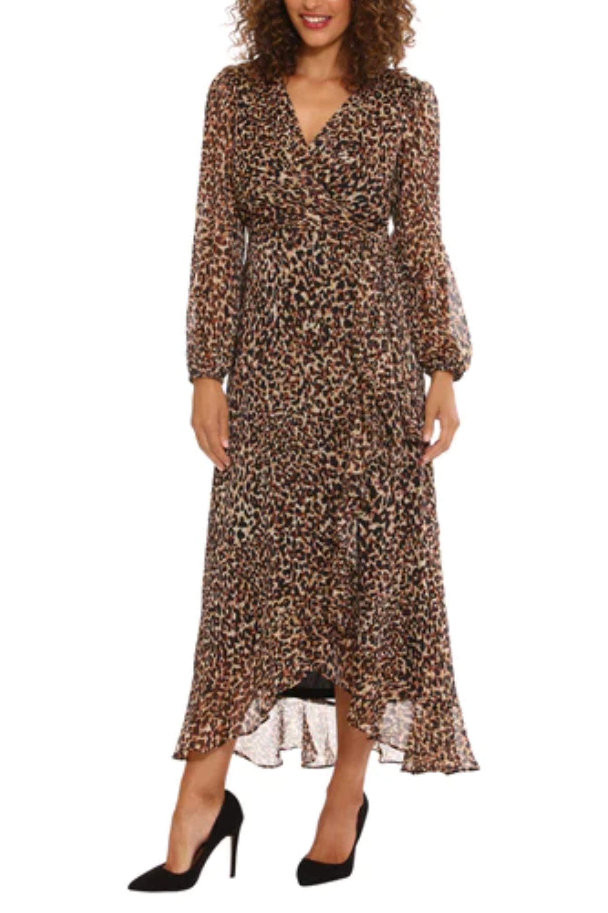 A chic-looking animal print with metallic stripes, midi dress that is so versatile that it can be worn during the day or night to holiday or dinner parties, date nights, and even work, features long cuffed balloon sleeves, a surplice neckline, an attached side tie belt, and ruffly trim along the uneven hem flowy skirt.Â
