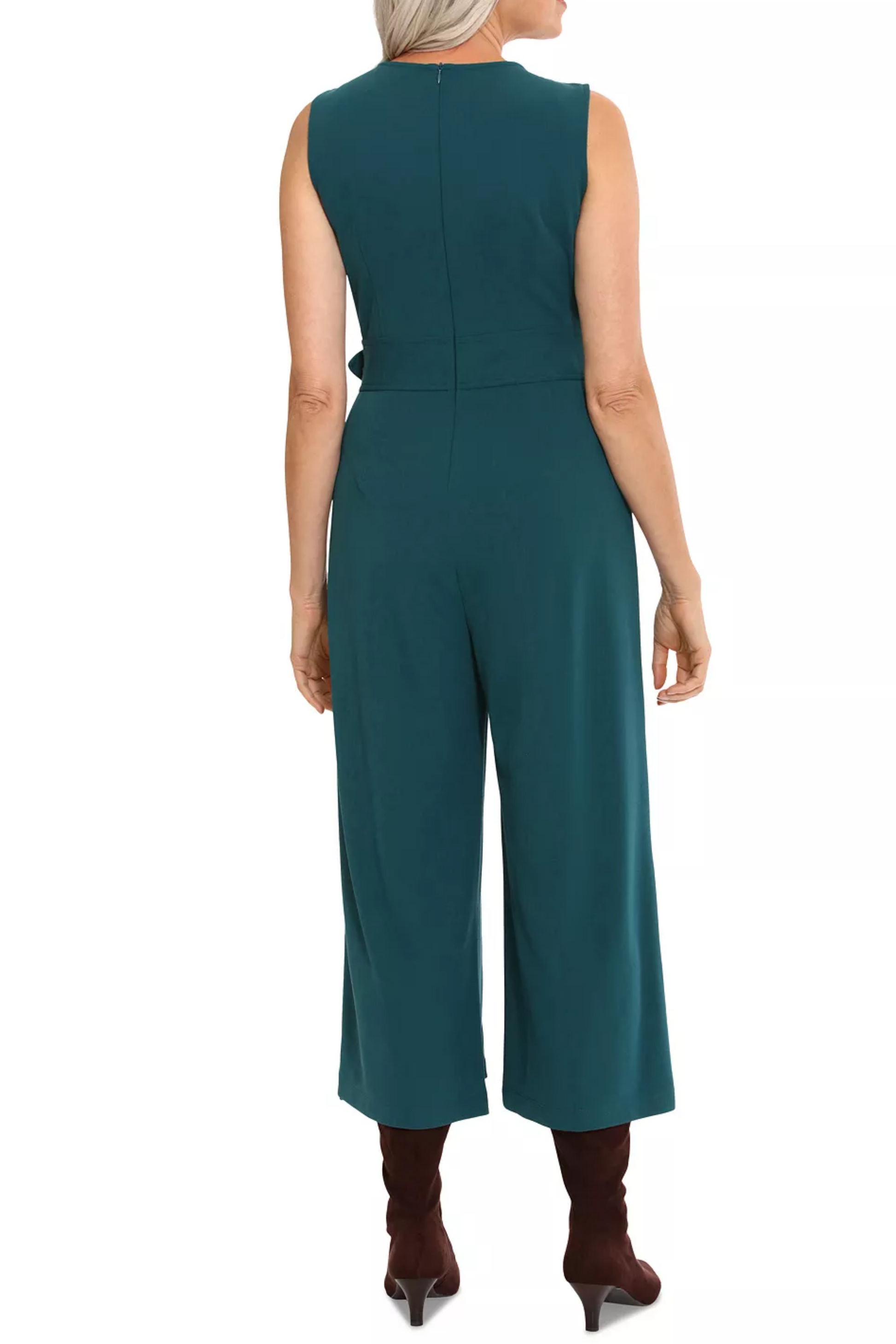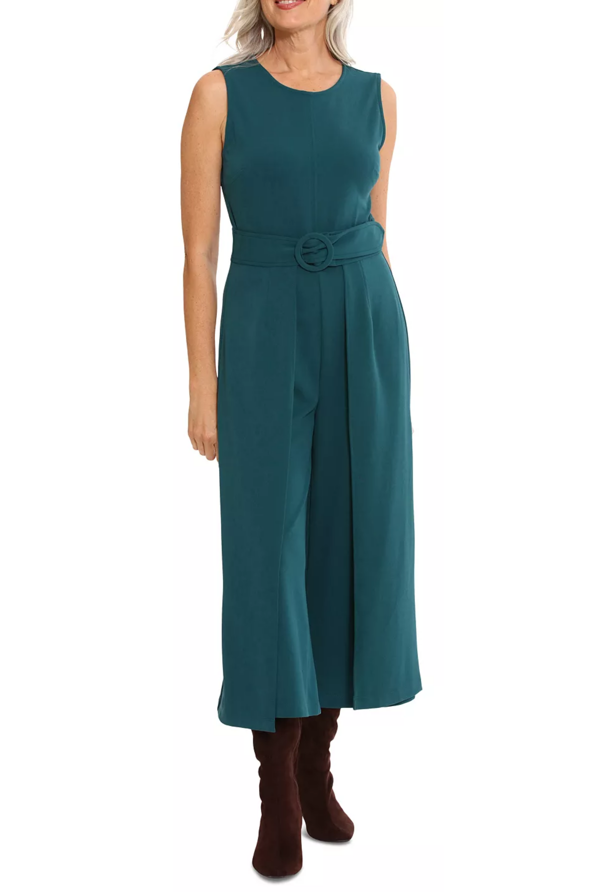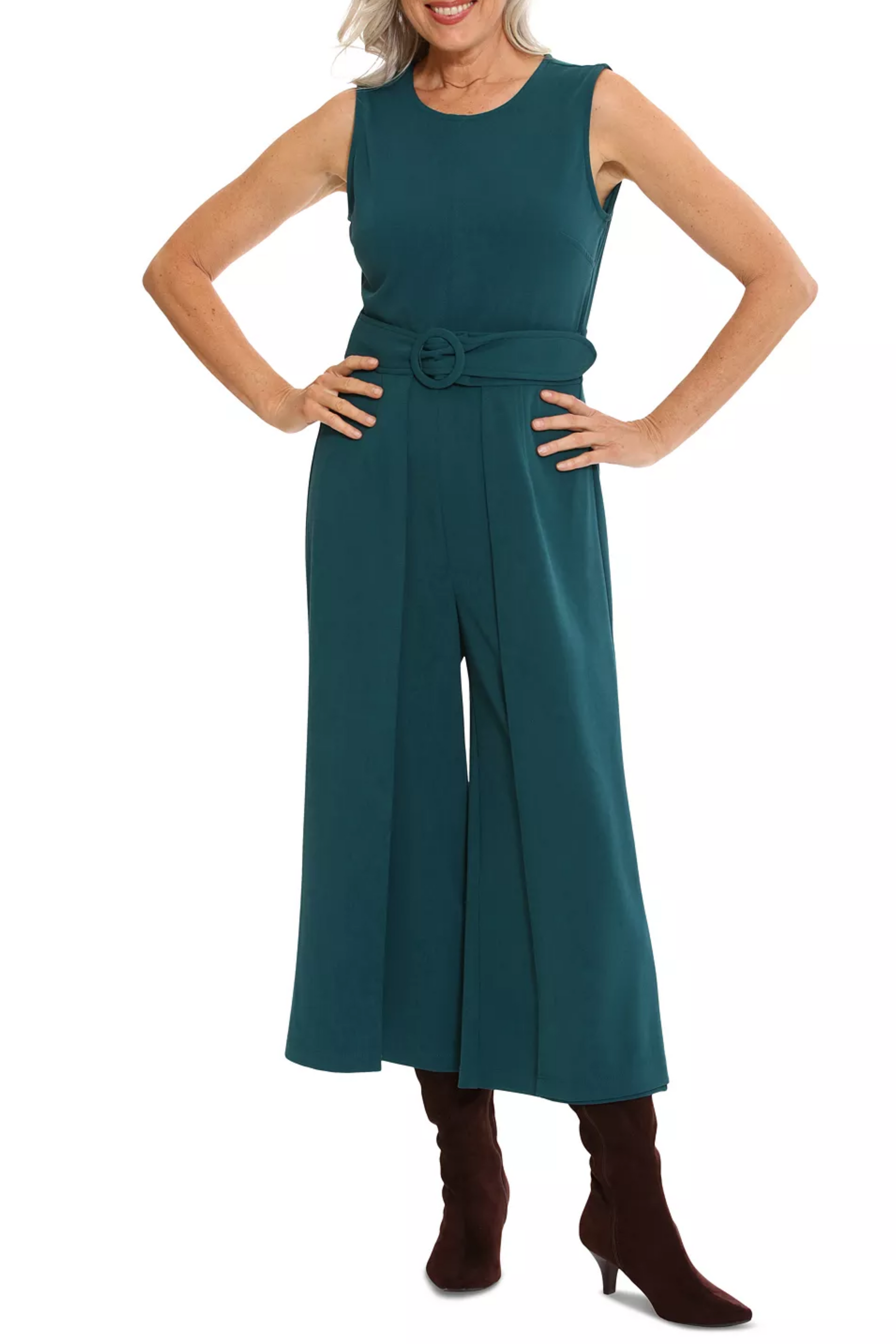 A simplistic and smart-looking women's jumpsuit that features a round neckline, a sleeveless silhouette, a built-in belt and buckle, and culottes-style wide leg pants with a frontal overlay. This stylish wide leg jumpsuit can be dressed up and down throughout the year, both during the day and night, for parties, brunches, luncheons, baby and bridal showers, and dinner engagements.