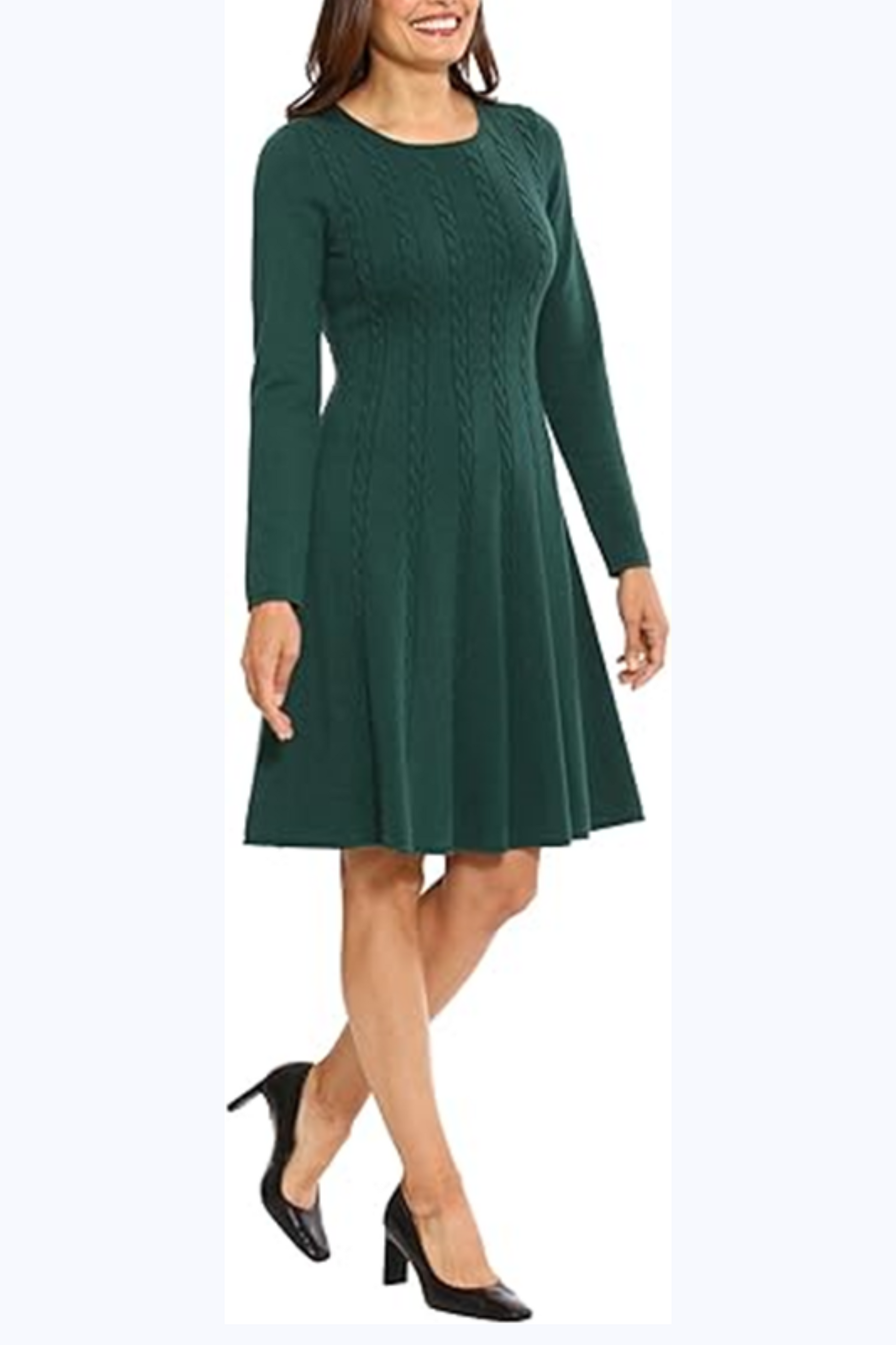 Show off your style during those colder days in this smart-looking sweater dress that features long sleeves, a flared knee-length, and an A-line skirt, along with an overall large cable knit design. This classic fit and flare dress can be worn both during the day and night, and it can be dressed up and down for attending parties, dinners, and celebrations, and pairs nicely with heels, pumps, boots, and flats.