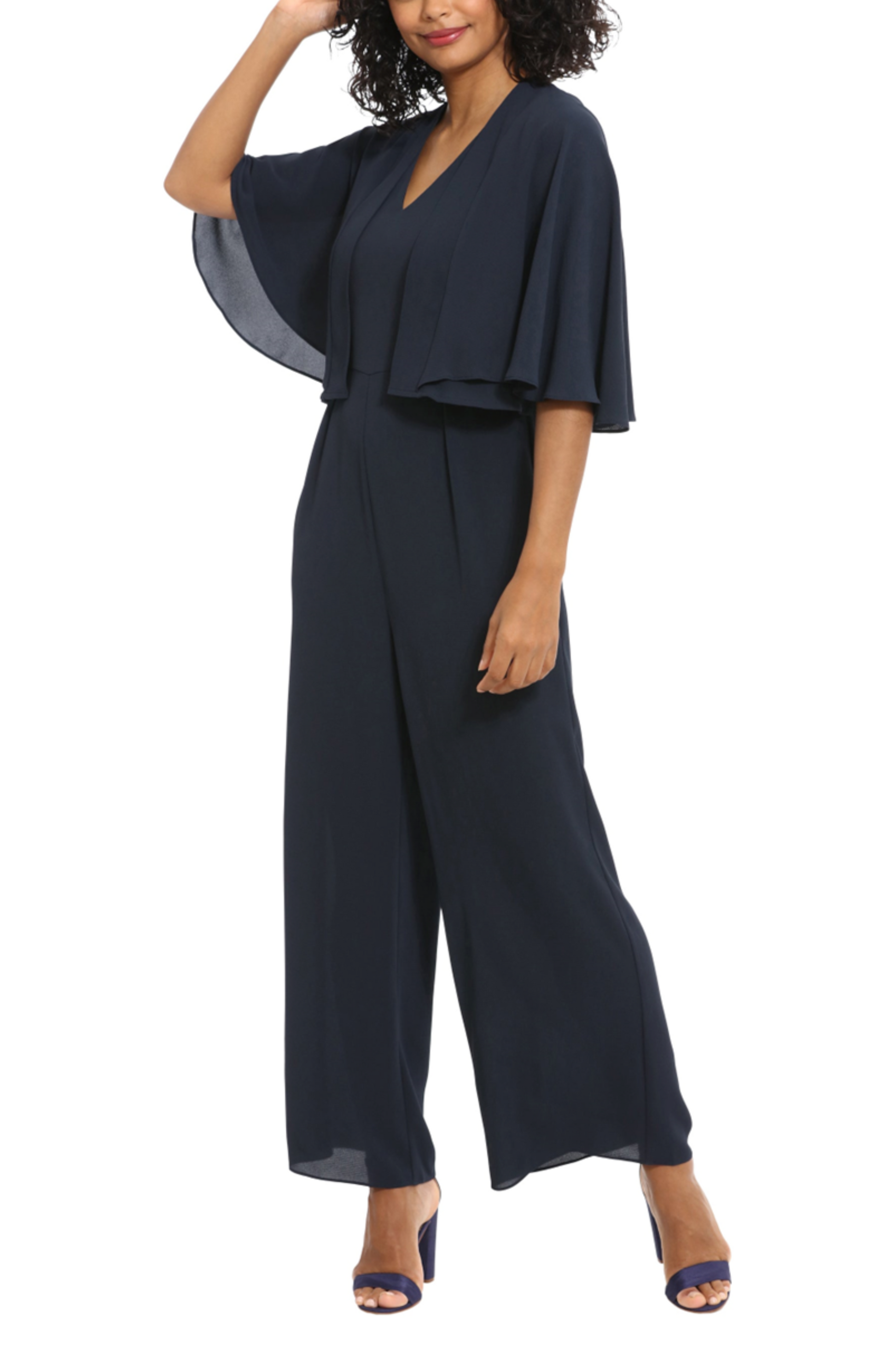 It's all in the details when it comes to dressy jumpsuits for women, like this precious set that features a sleeveless silhouette, a V-neckline, wide-leg styling, and a matching open-front, capelet jacket with sleeves. This evening jumpsuit can be worn year-round, and it's made for an array of events, such as cocktail parties, dinner engagements, holiday gatherings, and weddings.