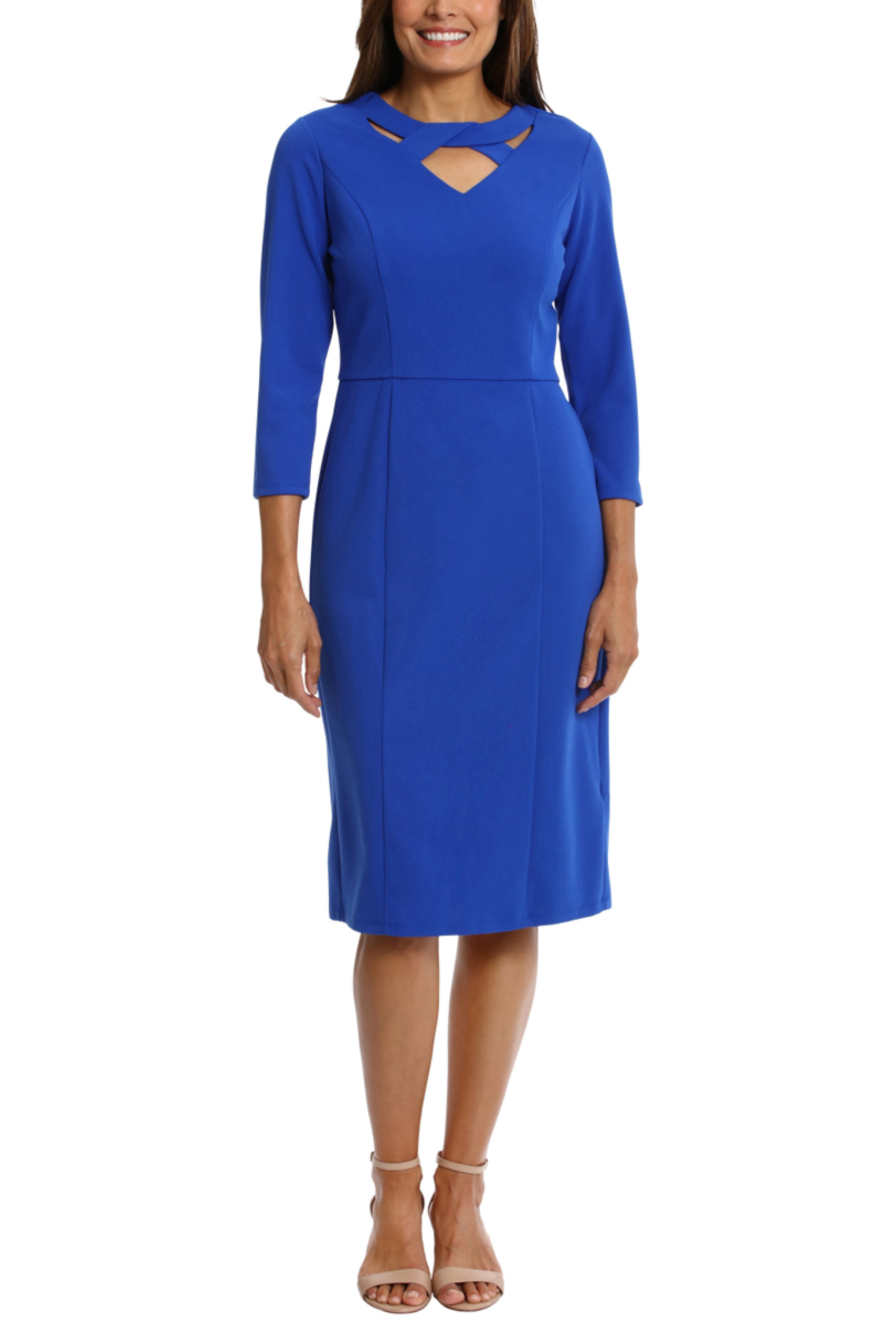 Sophistication and smarts emanate with this unique-looking cocktail dress that features 3/4 sleeves, a knee-length, sheath dress silhouette, and a standout crisscross cutout round neckline. This cutout neck dress is quite eye catching, and you need to show it off when you attend your next dinner party, birthday celebration, holiday gathering or corporate event throughout the year.