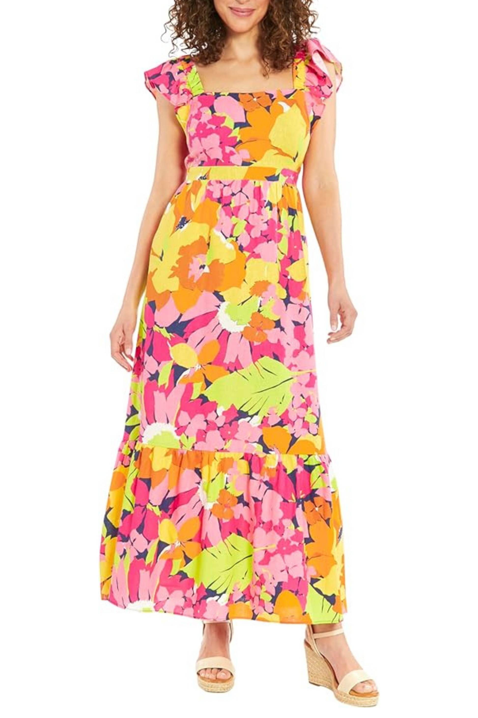 Like a beautiful garden, this floral dress embodies the essence of such a place, and it features a square neckline, elastic, short flutter sleeves, a built-in beltline, a long ankle-length with a one-tier skirt, and an overall vibrant floral print. This enchanting maxi dress is great for spring and summer and can be worn to bridal and baby showers, birthday parties, lunches, and brunches.