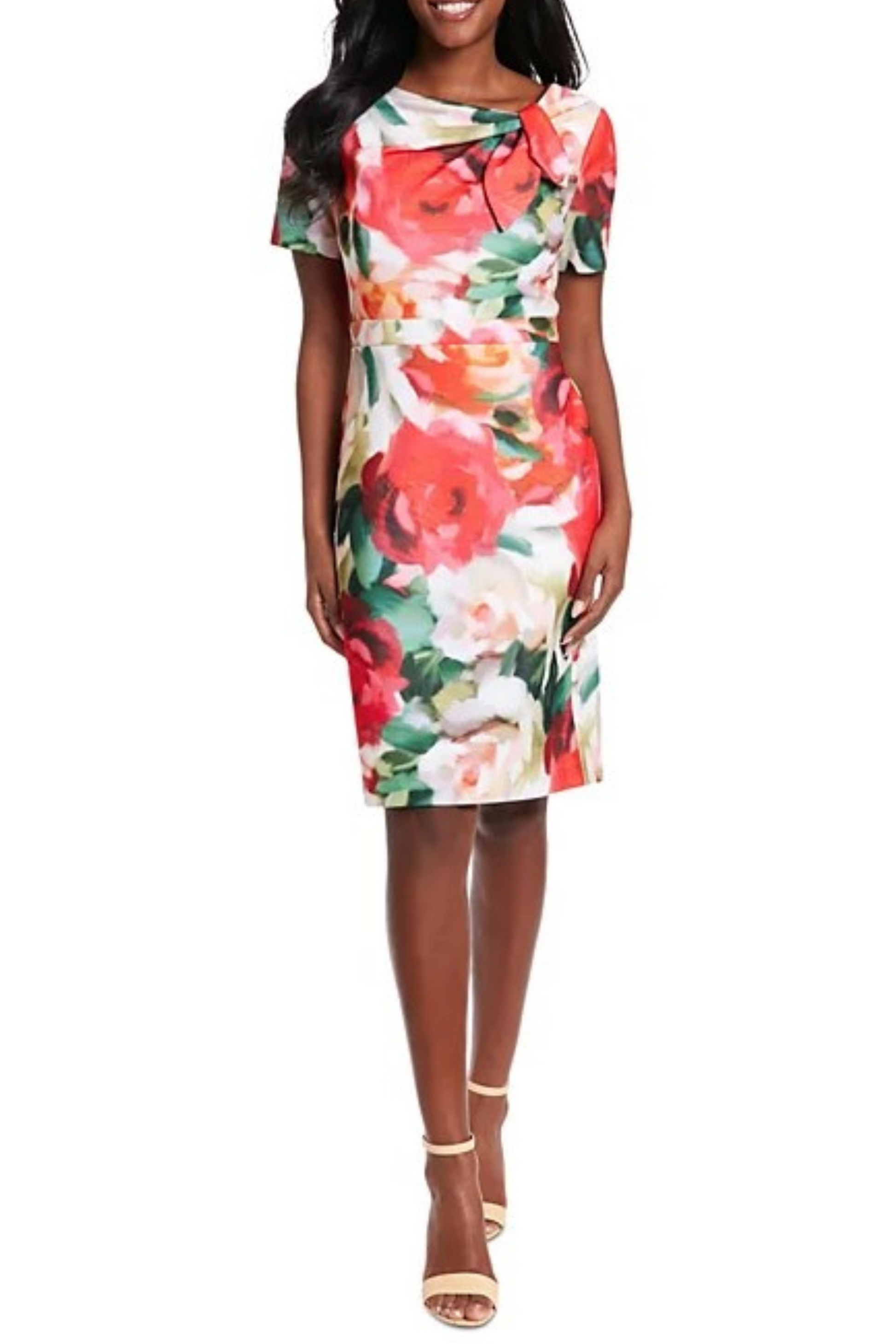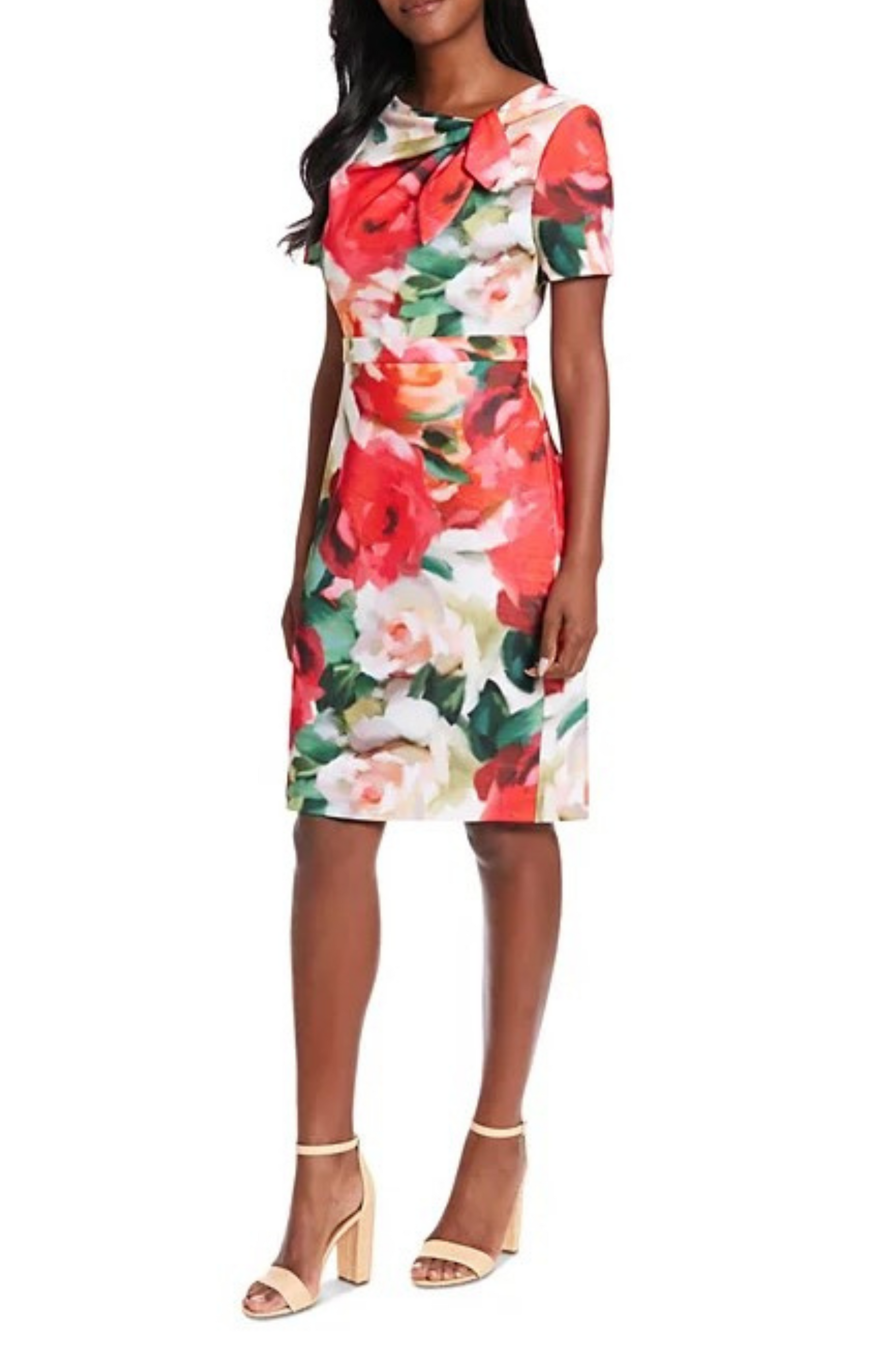Like an art gallery or museum painting, this lovely floral dress is perfect for spring and summer affairs, such as bridal and baby showers, Sunday brunches, birthday parties, and weddings. This pretty sheath dress features an asymmetrical neckline with a side bow detail, short sleeves, and a knee-length skirt that looks nice with a pair of heels, flats, mary janes, wedges or pumps.