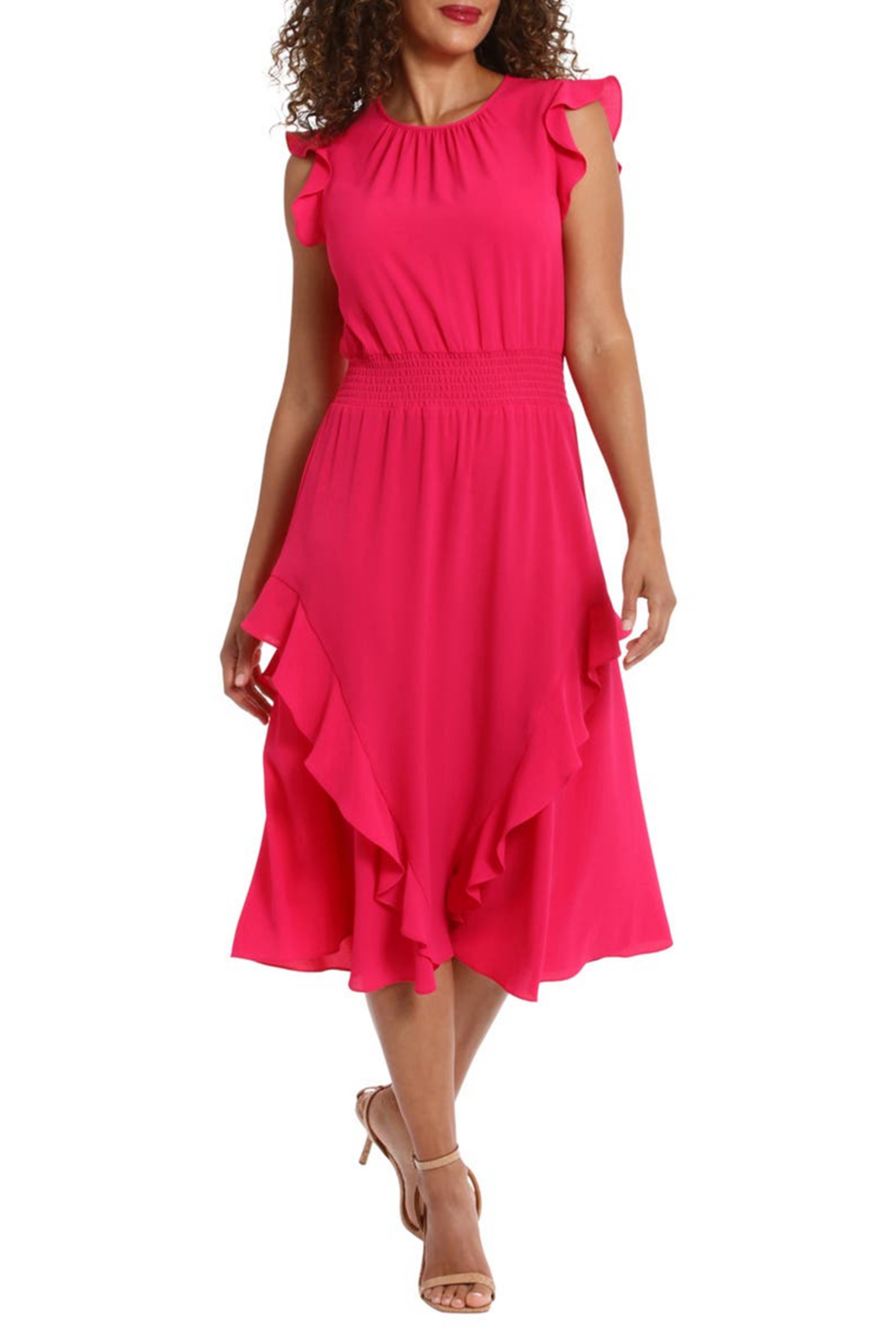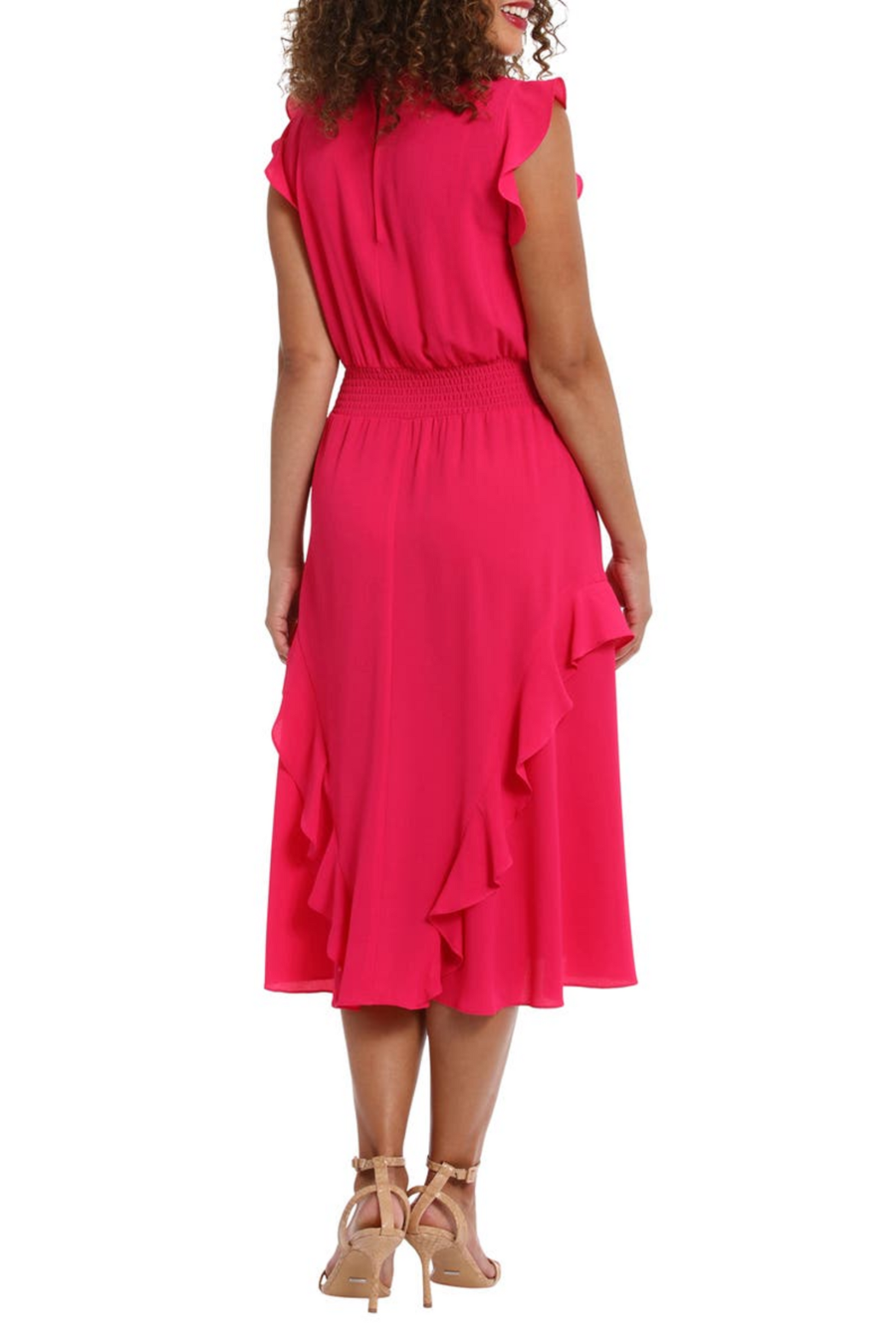 The epitome of femininity is this enchanting midi dress that features short flutter sleeves, a smocked waistline, and an A-line, calf-length skirt with V-shaped frilly ruffle detail. This lovely day dress is made for warm Summer and Spring days at events such as birthday parties, gender reveals, brunches, and luncheons, and pairs nicely with heels, sandals, and flats.