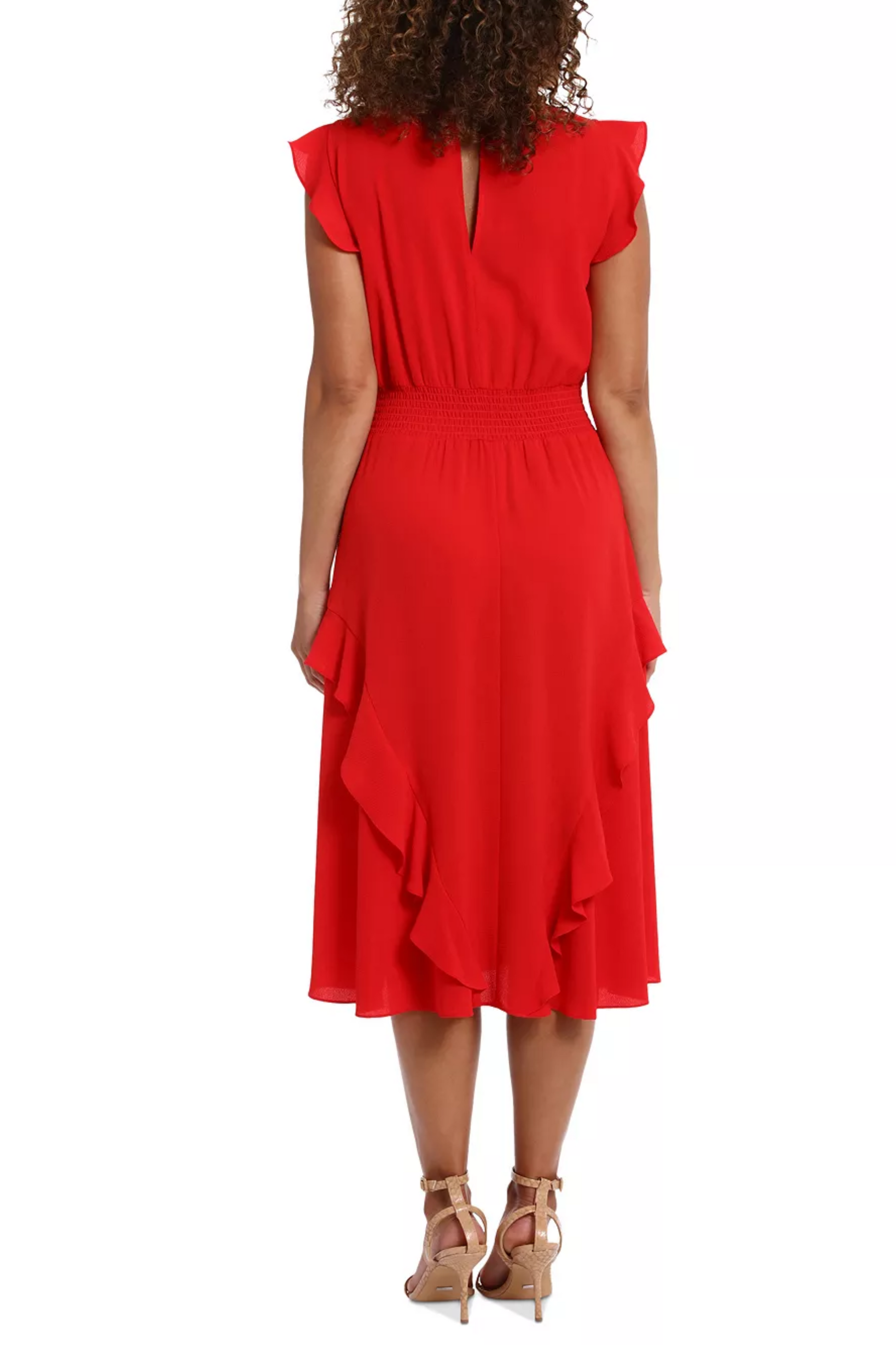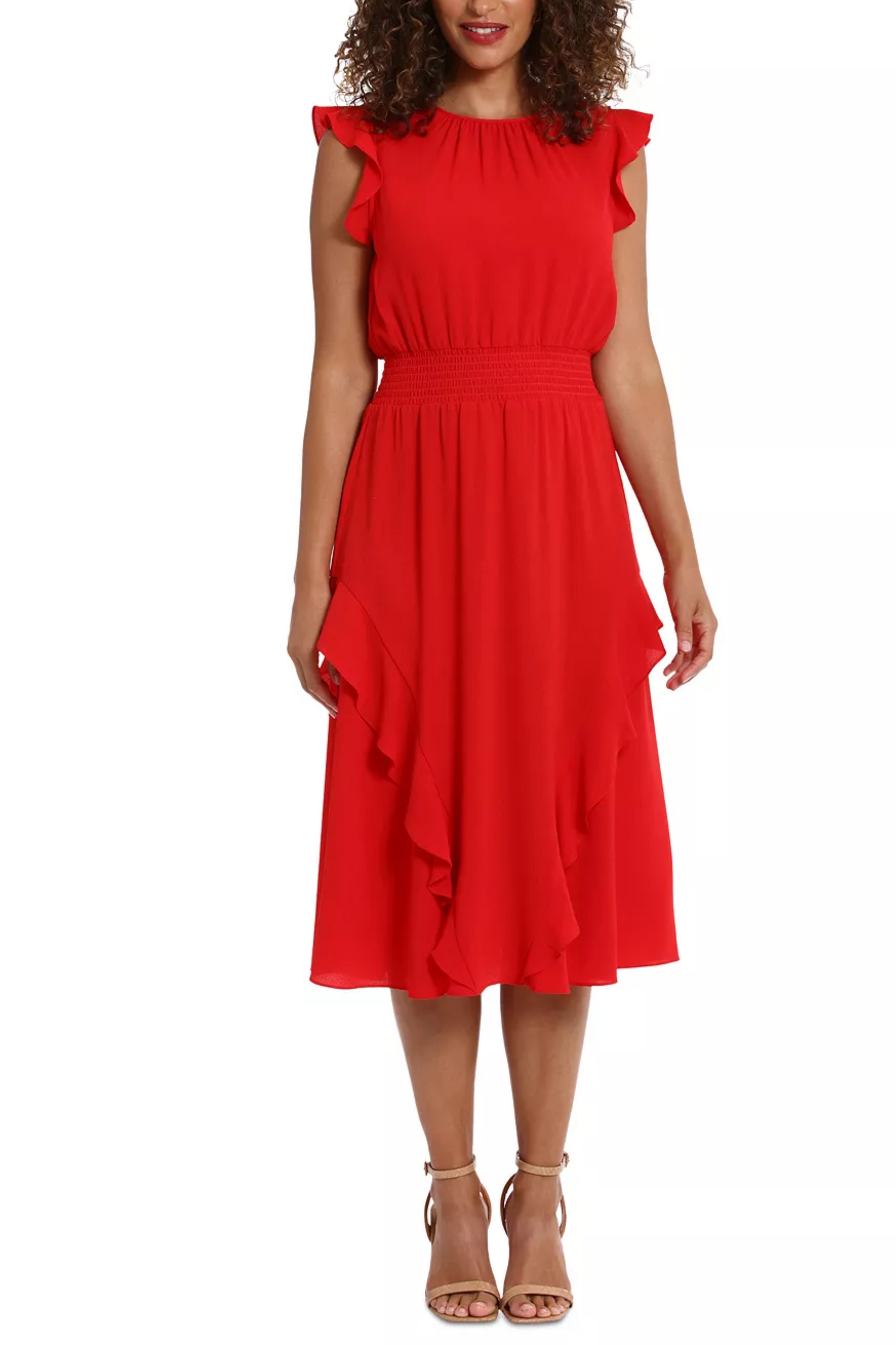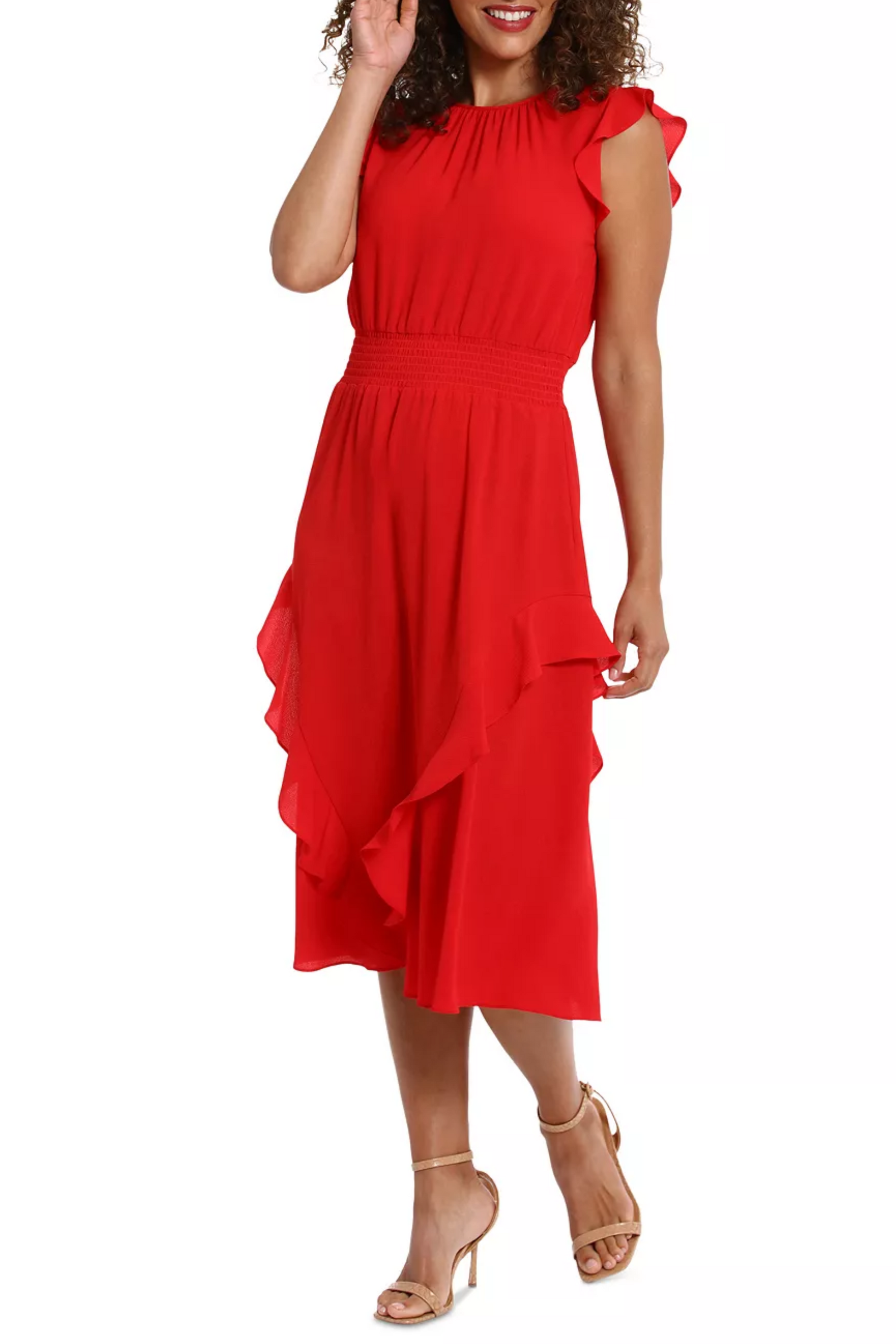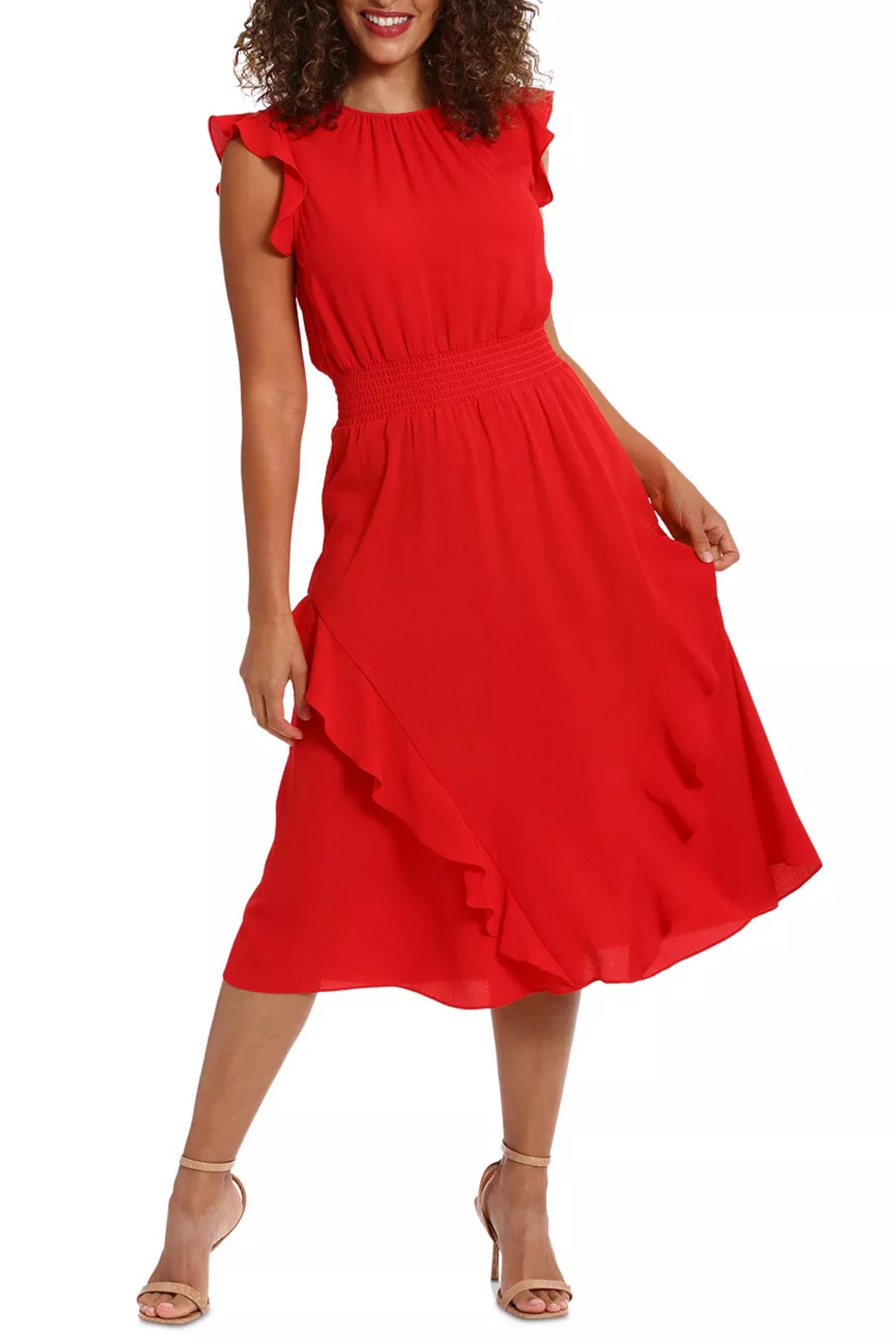 The epitome of femininity is this enchanting midi dress that features short flutter sleeves, a smocked waistline, and an A-line, calf-length skirt with V-shaped frilly ruffle detail. This lovely day dress is made for warm Summer and Spring days at events such as birthday parties, gender reveals, brunches, and luncheons, and pairs nicely with heels, sandals, and flats.