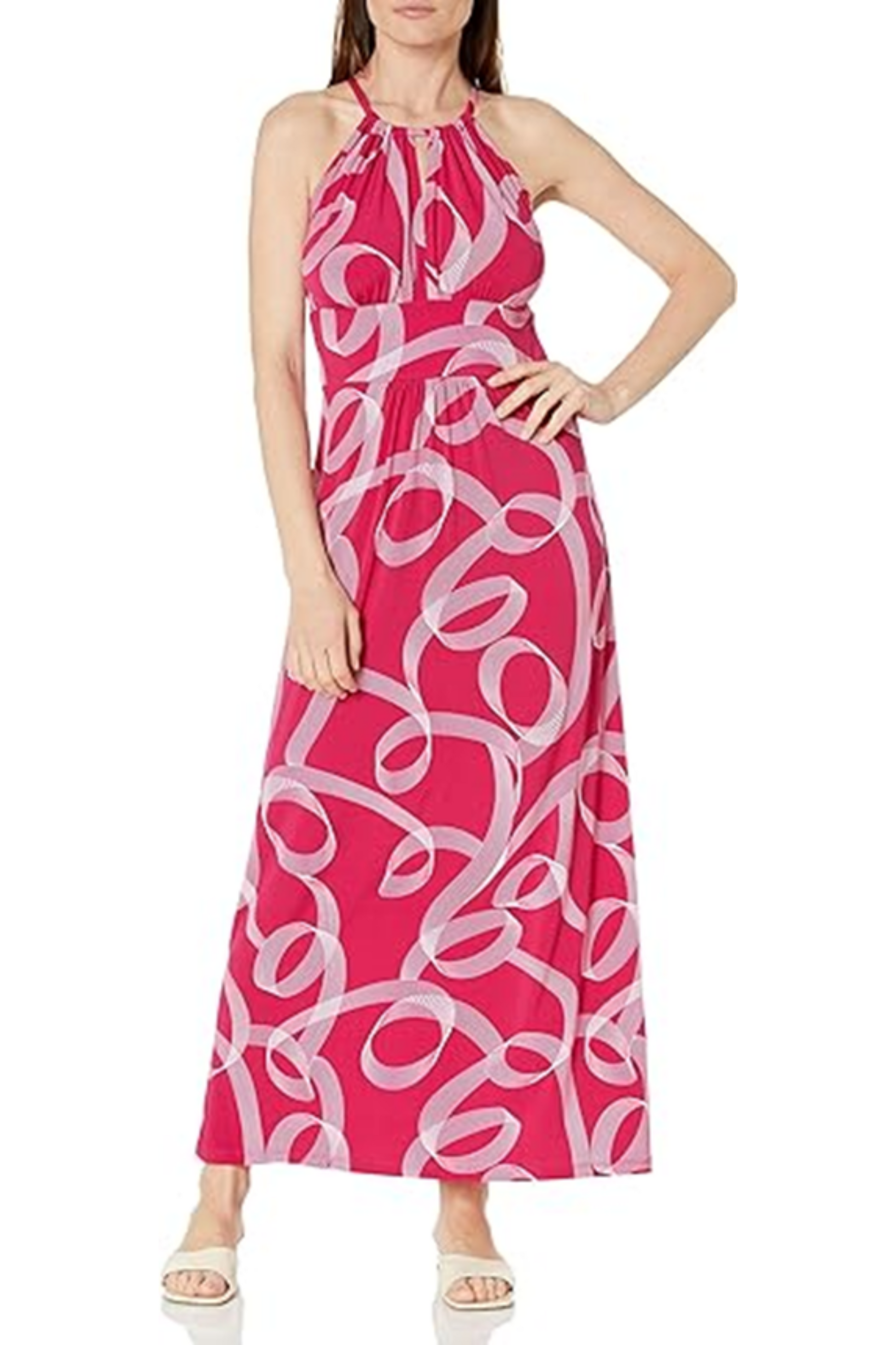 When summer and style mesh nicely, you get this chic-looking maxi dress that features a spaghetti strap halter neckline with a keyhole center, a banded waistline, a long ankle-length skirt, and an overall striped brushstroke print. This halter dress is great for birthday parties, weekend brunches, lunches with friends, bridal and baby showers, and gender reveals.