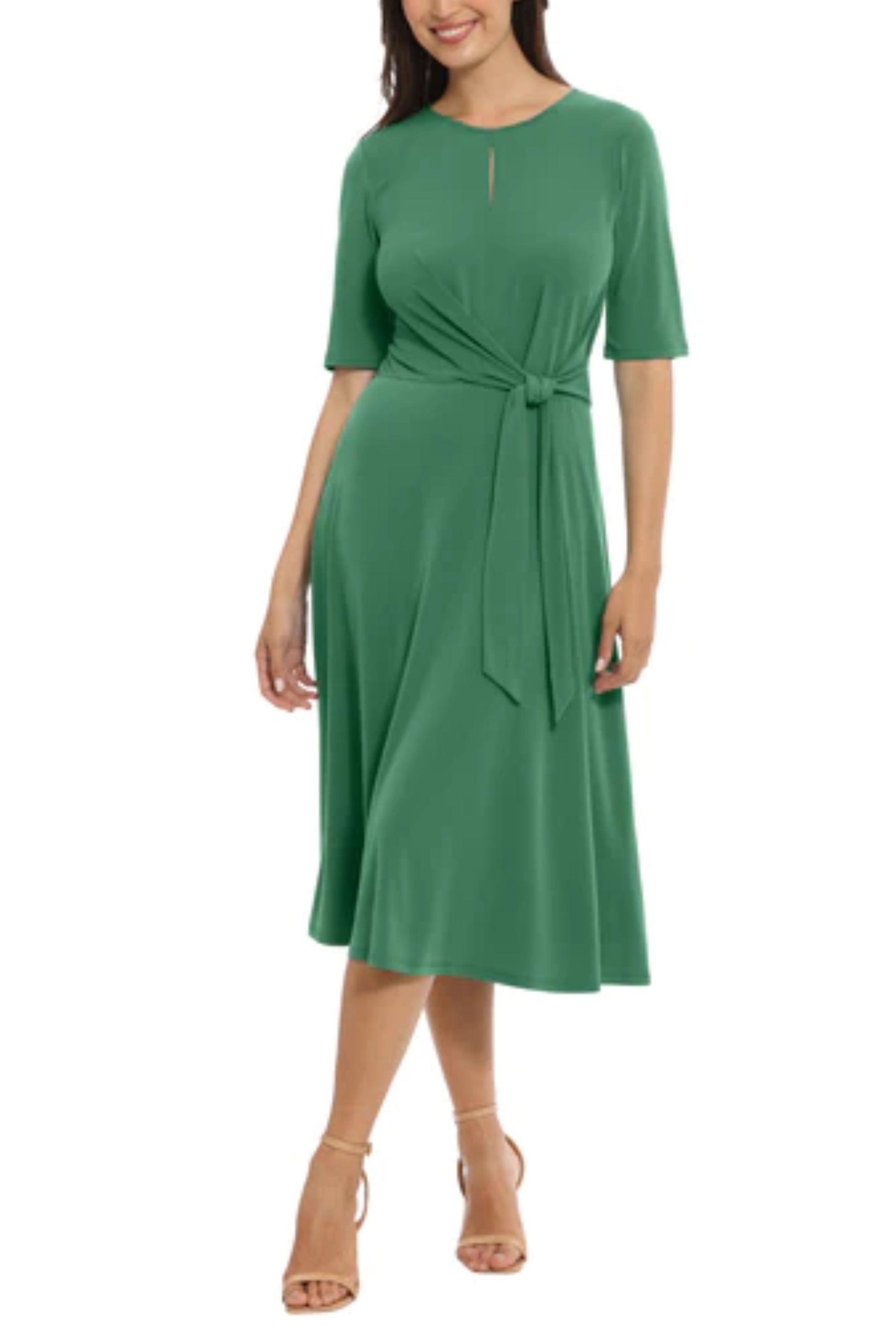 Move in comfort at work, at your next dinner engagement or on date night in this lightweight solid-colored midi dress that clings to your figure, features above-the-elbow sleeves, a round neckline with a keyhole design, a built-in side belt that shows off your waistline, and a flowy A-line skirt.
