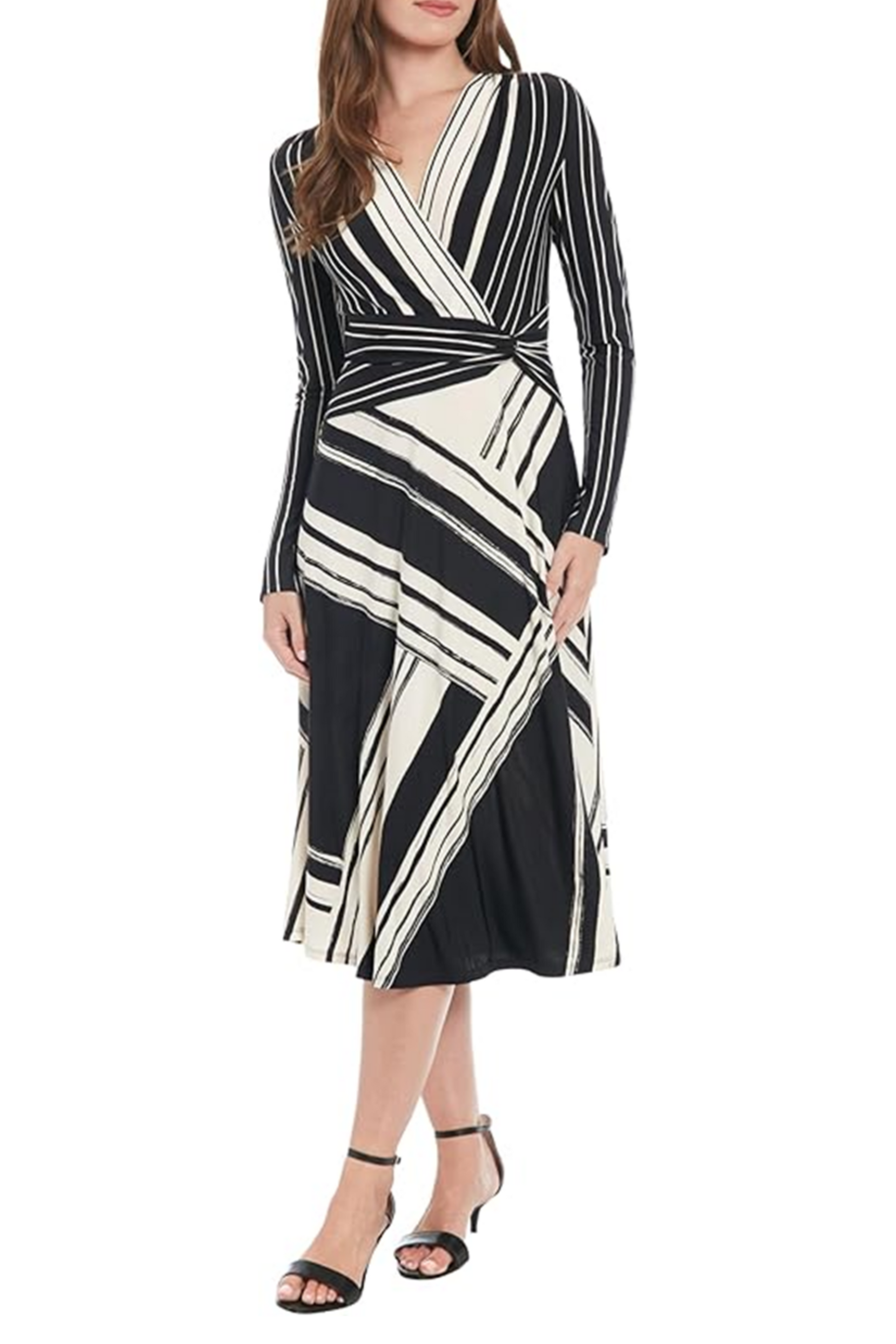 The epitome of style is this fabulous and classy-looking faux wrap dress that features a flattering silhouette, long sleeves, a V-cut surplice neckline, a twisted-detail waistline, an A-line knee-length skirt, and a striped and angled print. This long sleeve dress is perfect for year-round events and can be worn both during the day and night and dressed up and down.