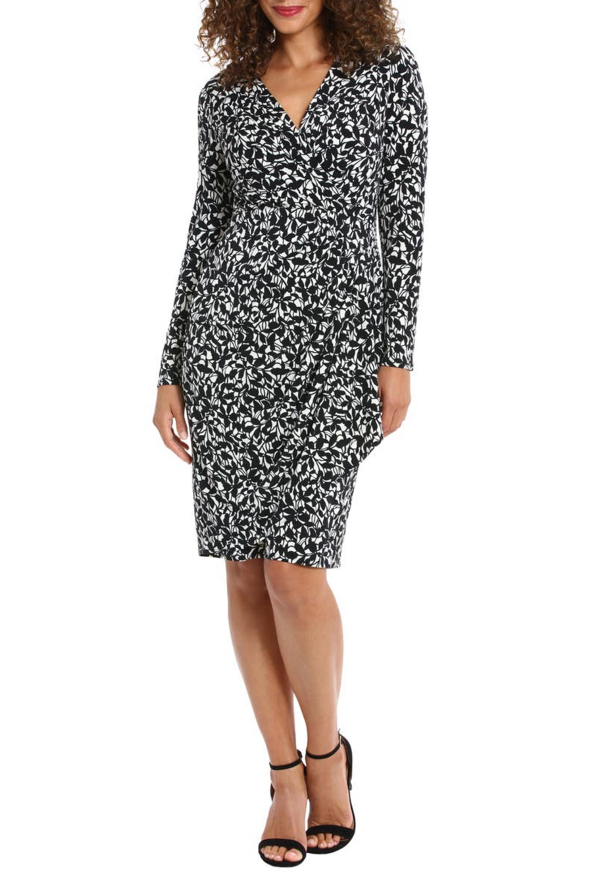 A chic-looking and modesty faux wrap dress that is very flattering to an array of body types, features long sleeves, a V-cut surplice neckline, and side waist pleats that connect to the asymmetrical drape detail of the knee-length skirt. This long sleeve dress also contains a pretty abstract floral print that can be worn both during the day and night and throughout any season.