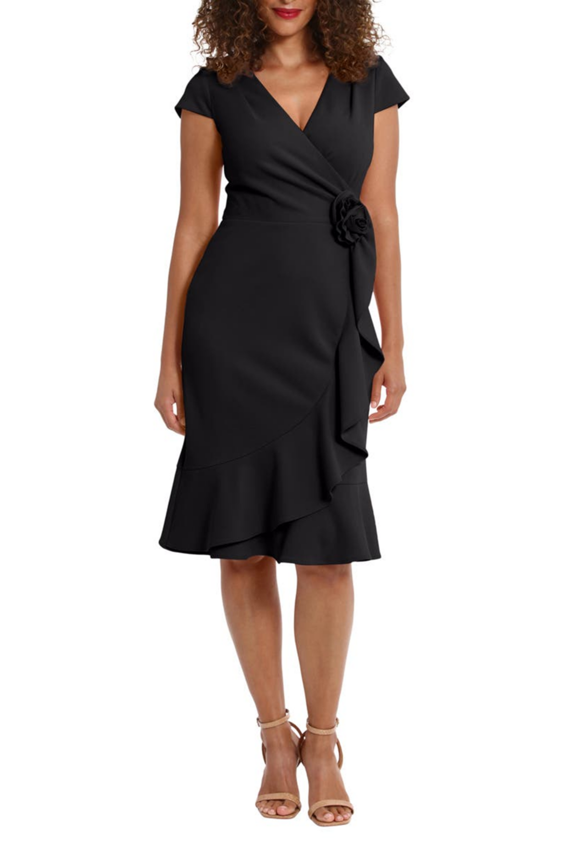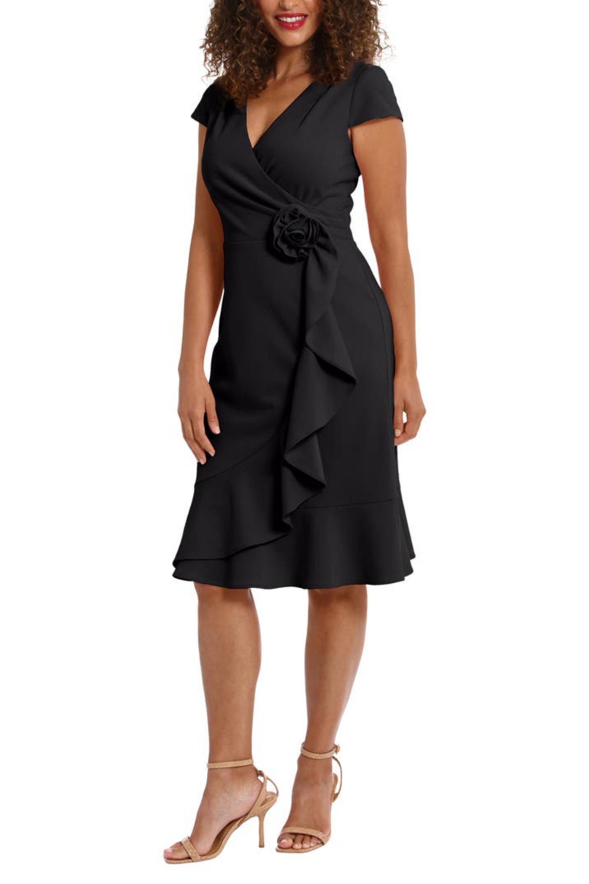 London Times Rosette Ruffled Skirt Faux Wrap Dress