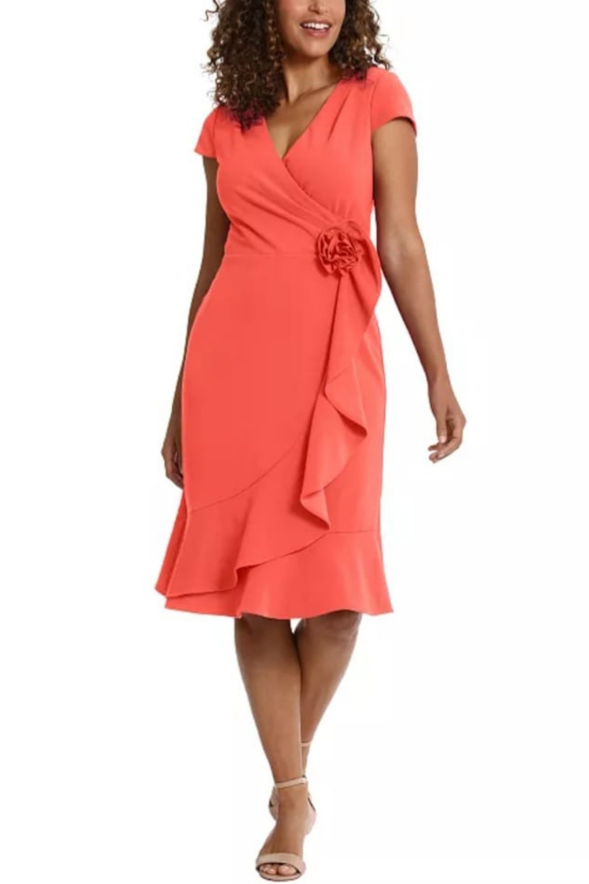 London Times Rosette Ruffled Skirt Faux Wrap Dress