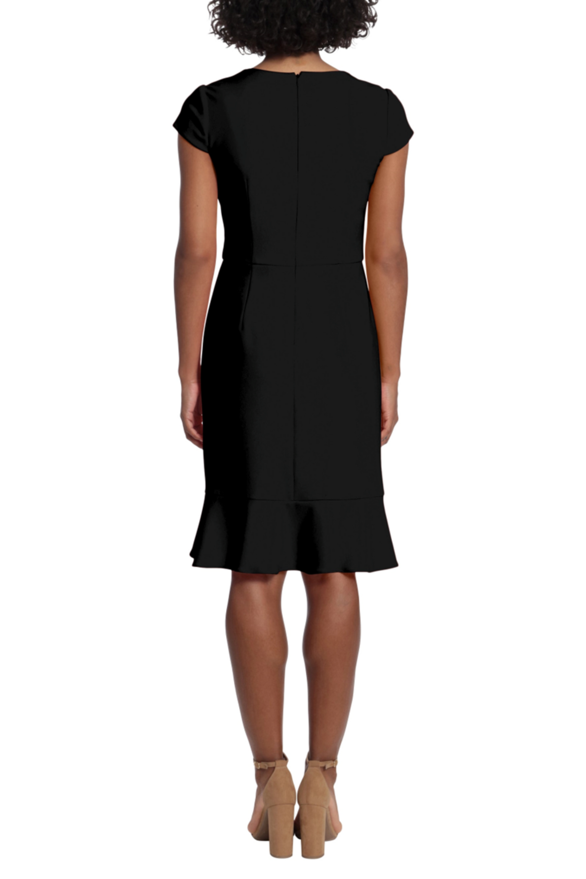 This isn't your ordinary sheath dress but one that is quite feminine and flattering, and it features short cap sleeves, a surplice neckline, side pleat waist detail, a faux-wrap silhouette, and a knee-length skirt and hem adorned with frilly ruffles. This cap sleeve dress is needed for an array of events throughout the year, such as weddings, brunches, luncheons, dinner engagements, and cocktail parties.