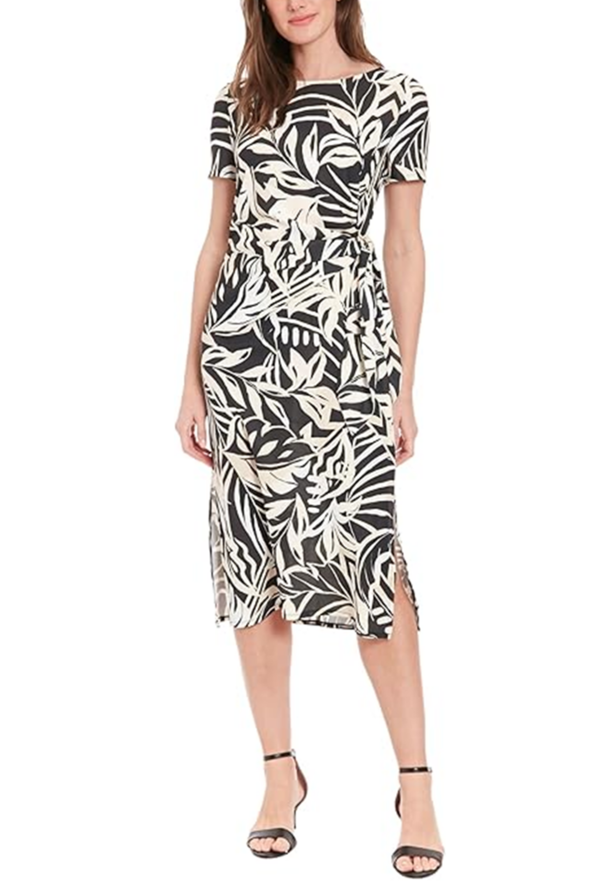 London Times Short Sleeve Leaf Print Midi Dress