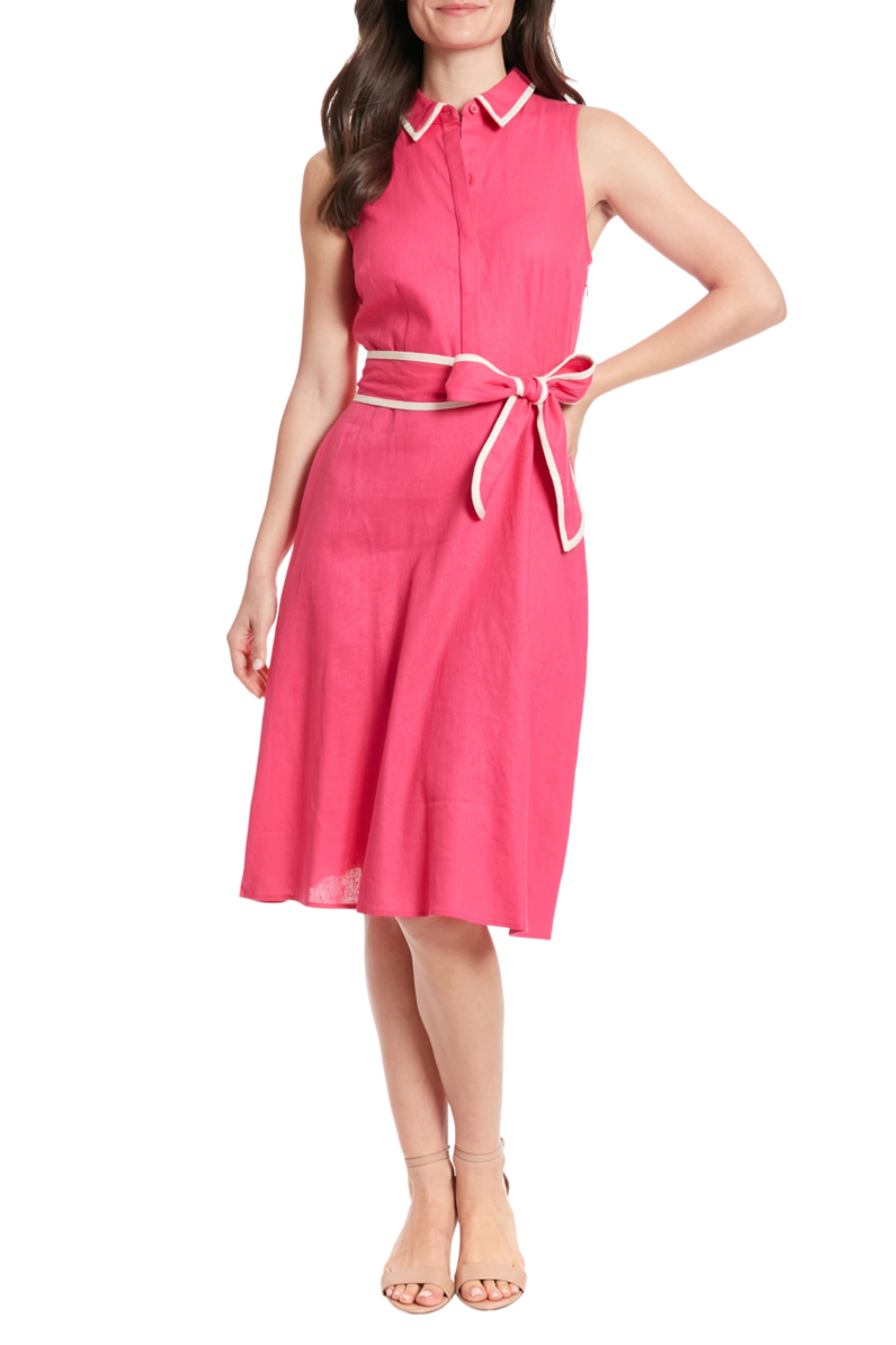 When it comes to details, this shirt dress exemplifies so many great features, such as a spread collar, a sleeveless silhouette, an upper bodice covered placket, a sash belted waist, hidden side pockets, an A-line knee-length skirt, and contrast trim. This charming collared dress looks nice when paired with heels, flats, sandals, wedges, and even sneakers, and is great to wear to parties during those hot days.