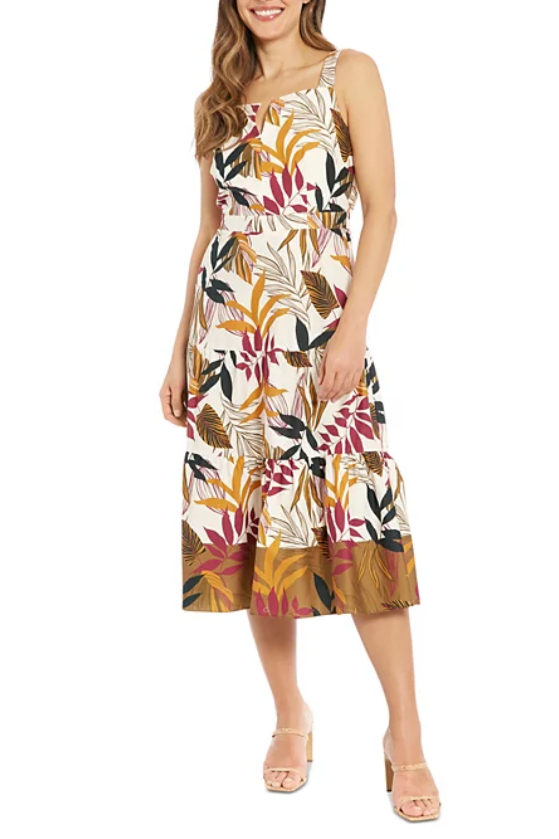 You'll feel like you're on a tropical island when you wear this enchanting leaf print midi dress that features a sleeveless silhouette, a square V-cut neckline, a built-in beltline, and a below-the-knee tiered skirt. This tiered dress is made for spring and summer days and for attending weekend brunches, lunches with friends, beach parties, gender reveals, and bridal and baby showers.